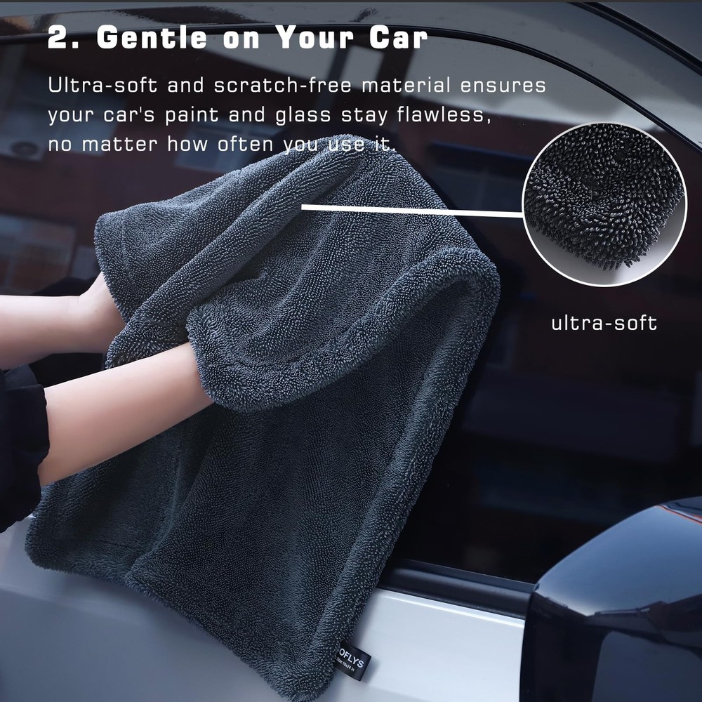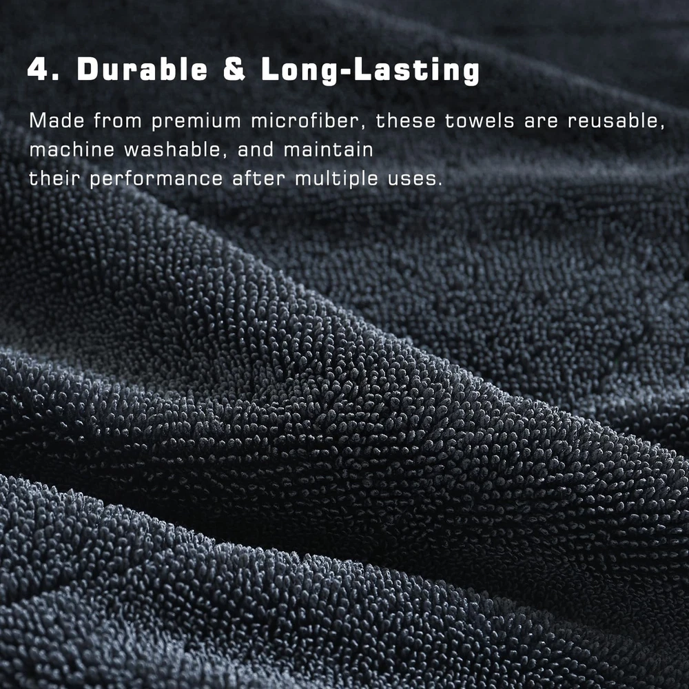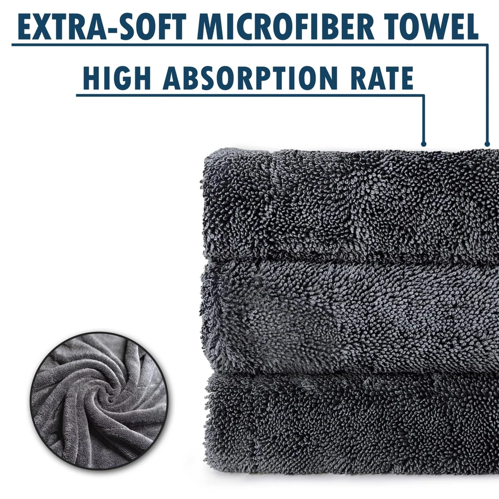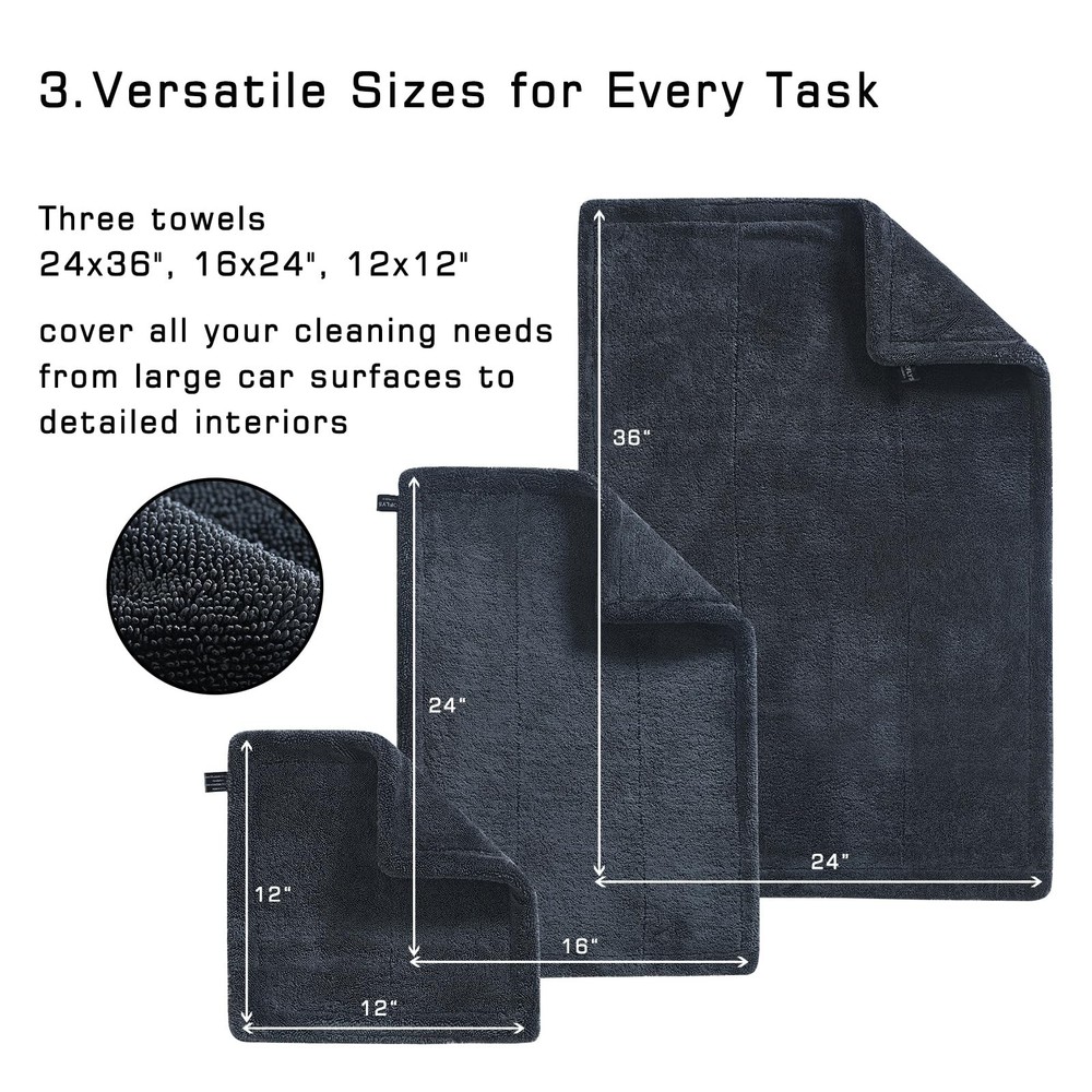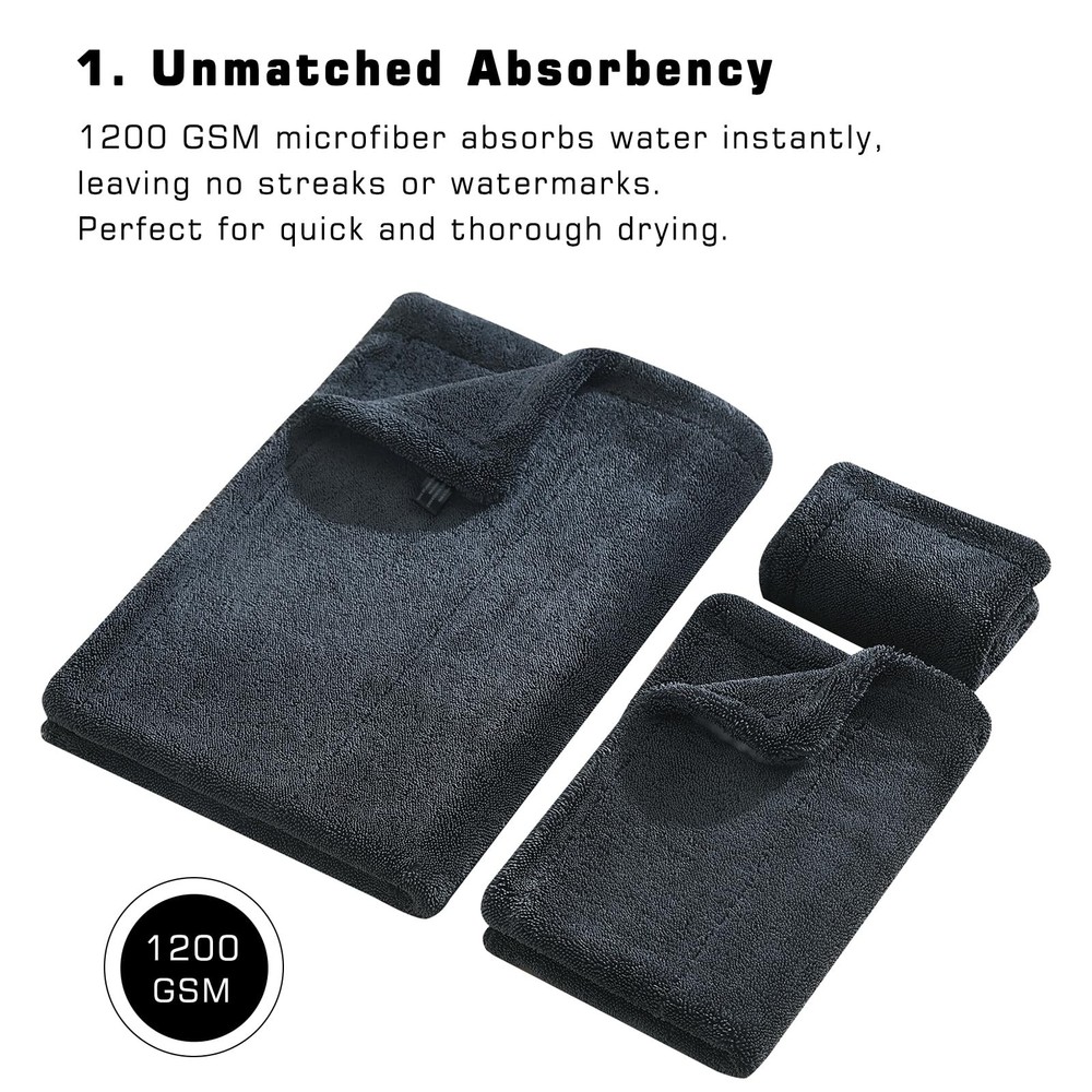 SATISFACTION GUARANTEED: We’re committed to top-notch quality, so if you’re not thrilled with your drying experience, we’re here to make it right. This set combines value, performance, and lasting quality—exactly what every car enthusiast deserves. COMPLETE CAR DRYING SET: With three specialized towels in one value-packed set, you’re covered for every step of the drying process. Use the 24" x 36" towel to dry the whole car, the 16" x 24" towel for tricky areas, and the 12" x 12" for mirrors and detailing—all without needing to wring them out. STREAK-FREE CLARITY FOR WINDOWS & MIRRORS: Each towel features ultra-thick 1200 GSM microfiber that soaks up over 9x its weight in water. The result? Streak-free, crystal-clear windows with just a quick swipe—no multiple passes required! EFFICIENT : Say goodbye to wasteful paper towels and soggy rags. Our double-sided microfiber towels are designed for maximum absorbency and durability, providing a scratch-free, premium drying experience that saves you time and resources PROFESSIONAL-QUALITY RESULTS, EFFORTLESSLY: Whether you’re a pro or a weekend warrior, this set offers a versatile and easy-to-use solution. The high absorbency and quick-drying design ensure spotless results in less time, so you can spend less time drying and more time enjoying your ride SATISFACTION GUARANTEED: We’re committed to top-notch quality, so if you’re not thrilled with your drying experience, we’re here to make it right. This set combines value, performance, and lasting quality—exactly what every car enthusiast deserves.