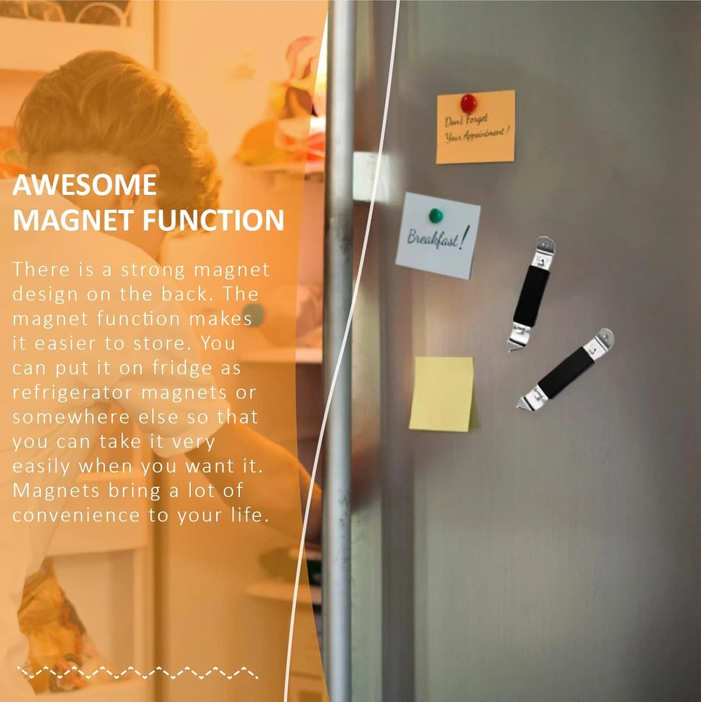 Unique Design: One side is a bottle opener, and the other side is a can opener, You can choose to use it according to your needs Great Material: Made of high-quality plated iron for a lasting use Repeated use will not cause any damage to the product itself, There is also a plastic casing to prevent rust Proper Size: 4.5" long x 0.87" wide,It is small in size makes them compact and easy to store in any bag or drawer Multi-function:The magnet design on the back will bring you lots of convenience while using and storage,attached to the refrigerator, making it easy to find Wide Application: Can easily and quickly open the beer, soft drinks, soda water, and more, Perfect for everyday life and party events Product description Color:Black Sizer:4.5" long x 0.87" wide 3 Pack Magnetic Bottle Openers The magnet design on the back will bring you lots of convenience while using and storage,attached to the refrigerator, making it easy to find