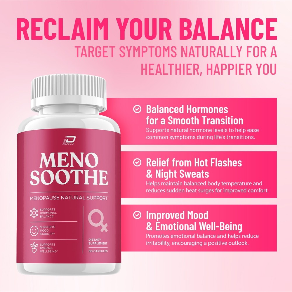 Discover MenoSoothe Capsules a carefully formulated all natural ingredients daily supplement. Meno Soothe Wellness Formula: Crafted to complement a healthy routine, MenoSoothe Capsules designed for women natural support MenoSoothe All-Natural Formula: Made with carefully selected natural ingredients. MenoSoothe Balanced Lifestyle: Stay active and maintain a sense of balance in your daily routine Meno Soothe for Daily Use: Convenient and simple to incorporate into your daily routine, these capsules are designed for hassle-free use. MenoSoothe Promotes Well-Being: Meno Soothe may help maintain a healthy lifestyle.