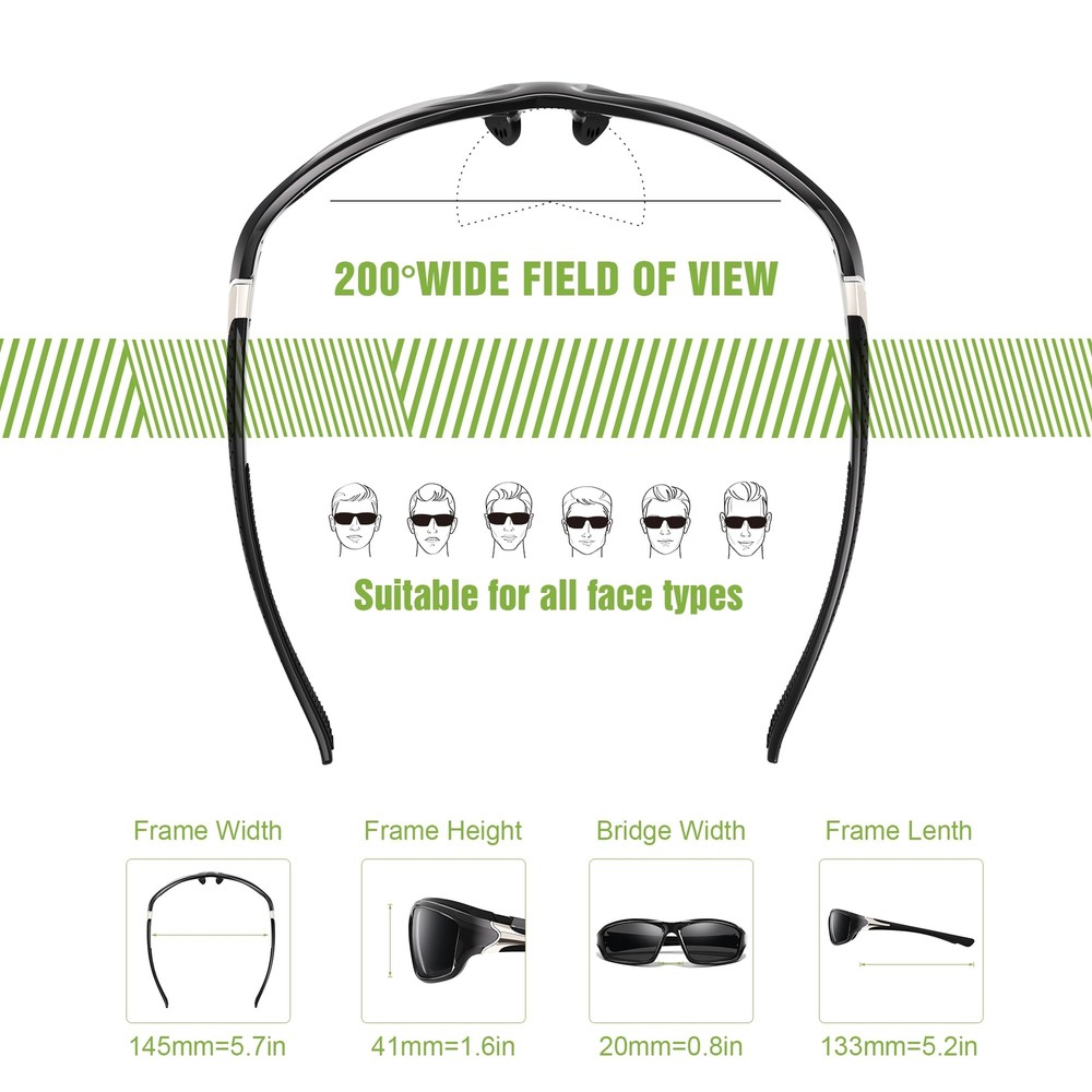 UV Protection and Clear Vision: Utilizing advanced UV400 lens technology, these mens polarized sunglasses effectively block over 99.9% of harmful UV rays, providing comprehensive protection for your eyes. The HD polarized mens fishing running sunglasses lenses reduce glare and reflections, delivering a clear visual experience for any outdoor activity, whether it's fishing or running Premium Materials and Details:Featuring high-quality TAC polarized sunglasses lenses that are scratch-resistant, these sunglasses for men offer long-lasting visual enjoyment. The lightweight PC frame, combined with non-slip rubber nose pads, ensures comfortable and secure wear without slipping. The included strap and pouch make it easy to carry and protect your polarized sports sunglasses Versatile Use and Streamlined Design:Specially designed for outdoor sports, these running sunglasses for men feature a streamlined, wrap around sunglasses design that fits closely to your face, ensuring they stay in place during activities like running, cycling, driving, hiking, and fishing. The non-slip temple design provides a secure fit even during high-intensity sports Multi-Pack Combination and Comfortable Wear:This set includes a 3-pack of polarized sunglasses men fishing, offering various colors and styles for you to mix and match according to different occasions and moods. The sunglasses bulk ultra-light frame ensures comfortable wear for extended periods, making them ideal for long outdoor activities such as hiking, driving, fishing, and running Exquisite Packaging and Care Tips:Mens sunglasses polarized UV protection comes with mens polarized sports sunglasses*3, glasses case*1, cleaning cloth*1, glasses pouch*1, glasses strap*3, polarization test card*1, making them an ideal present for friends and family. Special Tips: To protect the integrity of the cycling sunglasses lens coating, please avoid exposing the sunglasses to extreme high temperatures, such as direct contact with hot water