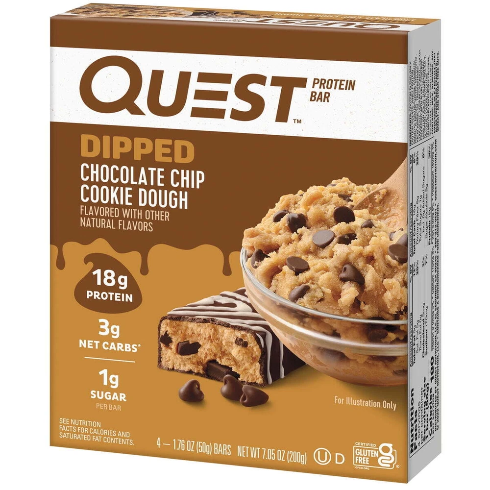 eBay Product details Quest Dipped Protein Bars, Low Sugar, High Protein, Chocolate Chip Cookie Dough, 4 Count QUEST DIPPED CHOCOLATE CHIP COOKIE DOUGH PROTEIN BAR tastes like a scoop of cookie dough fresh from the bowl. Only our version is packed with chocolate flavored chips, then dipped and topped with chocolatey drizzle, and has 17g protein 4g net carbs and 1g sugar per serving. UNWRAP COMPLETE PROTEINS: Quest Dipped Chocolate Chip Cookie Dough Protein Bars are made with complete, dairy-based proteins to provide your body with 9 essential amino acids. FIBER IS YOUR FRIEND: Each Quest Dipped Chocolate Chip Cookie Dough Protein Bar has 9g of fiber per serving to provide your body with a more complete macro profile. SWEET WITHOUT ADDED SUGAR: Enjoy the rewarding taste of Chocolate Chip Cookie Dough without worrying about added sugars. The Quest Dipped Chocolate Chip Cookie Dough Protein Bar has no added sugars COMFORT FOODS FOR ANYTIME CRAVINGS: The Quest Dipped Chocolate Chip Cookie Dough Protein bar is a sweet treat, without a ton of sugar, you can enjoy whenever you want to satisfy your sweet tooth. Box contains 4 Dipped Chocolate Chip Cookie Dough flavored protein bars