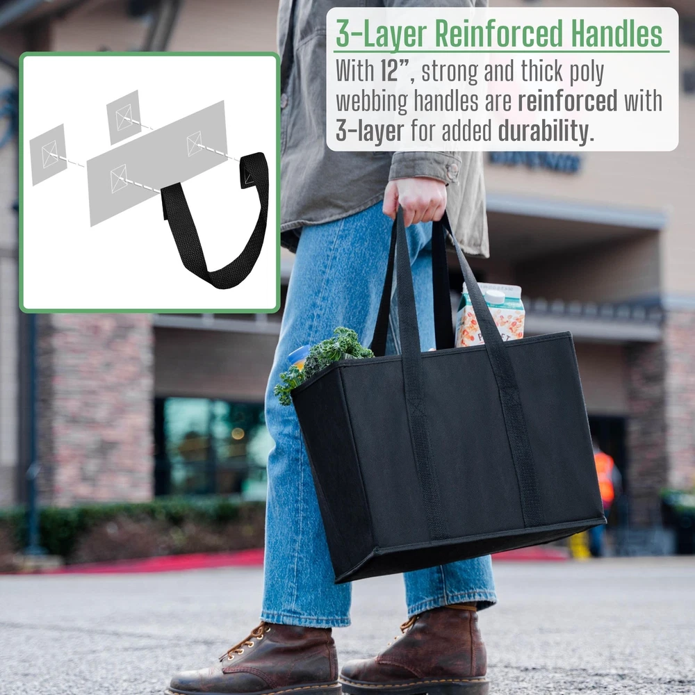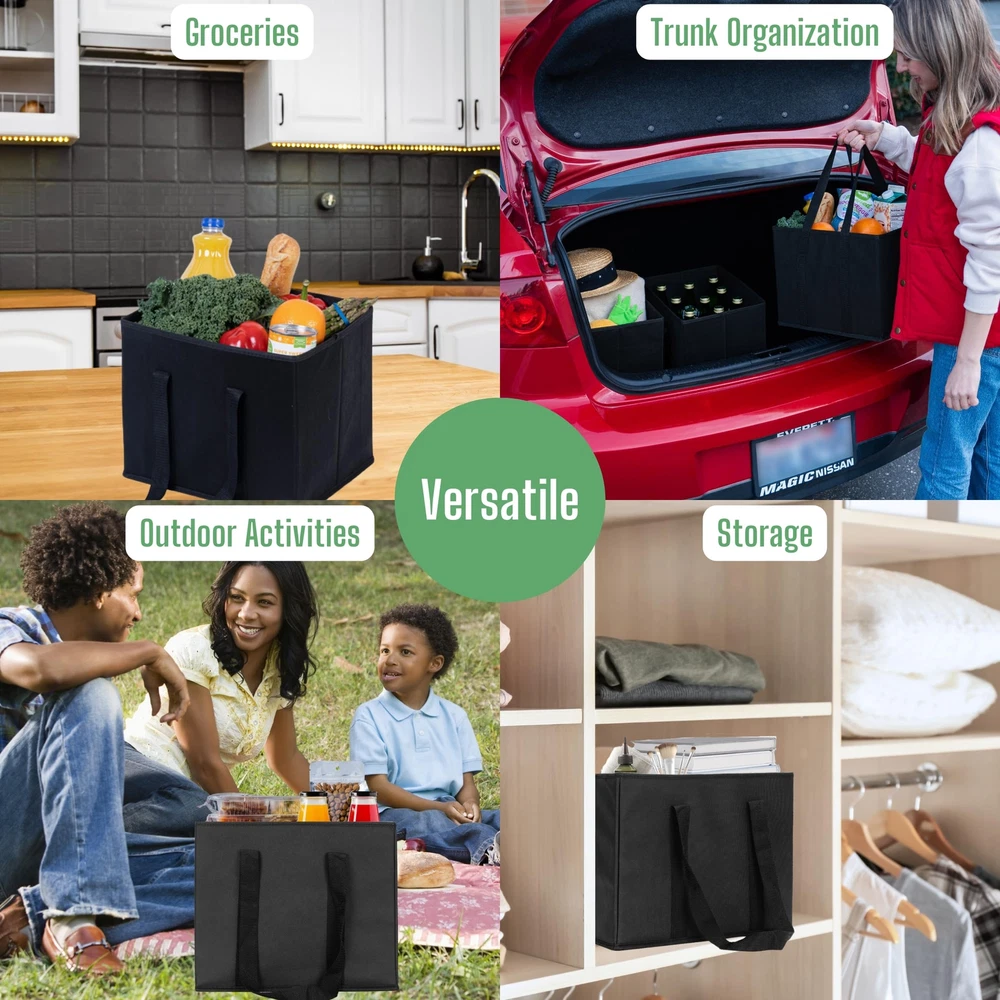 Practical and Great!These bags are so convenient and big, literally perfect for all errands! Made for the shopper with a soft spot for our planet, the collapsible box will have you looking and feeling fabulous every day of the week. Enjoy it as a storage bin, a grocery companion, and more. As form meets function, this box’s modern, subtle design makes it a great addition to every shopper’s arsenal. Because the environment is important to usTo make the collapsible box, we use PET, also known as Polyethylene Terephthalate. It’s of the most common forms of plastic in the world, and it is recyclable – it is the most recycled plastic in the world. It is safe, strong, lightweight and flexible, which makes it ideal for plastic packaging, water bottles or… bags! So not only are our bags recyclable, but we use recycled bottles and other plastic products to manufacture them. Better products for greener results! A rigid frameIts rigid frame, its reinforced bottom and sides keep the box upright, rendering the storage process as easy as it gets. The hard-bottom is easy to lift so you can fold it in a breeze. Folds flatThis collapsible box is there when you need it, and effortlessly stashable between uses. The issue with regular boxes is the space they take when unused. Problem solved with the collapsible box: fold it and stash it wherever you want in a few seconds for a of peace! Perfect SizeThe collapsible box is ideal for grocery shopping and home storage, and it’s also perfect for day-trips at the beach or picnics in the park! Stand, Load, and Go – Our reusable shopping bags boast a sturdy hard bottom panel and rigid hardboard structure that enables the bag to stand upright, maintaining its shape even when empty. Loading your groceries becomes a breeze, as the bag conveniently stays open in your cart, speeding up your shopping experience. Plus, it keeps your fruits, bottles, and other items from rolling around in your trunk, thanks to its solid construction that prevents tipping. Versatility Unleashed – These reusable grocery bags aren’t just for grocery shopping. They're the ideal solution for trunk or home organization, perfect for picnics, potlucks, farmers market, camping, beach outings, pool, boating, or storage. Whether you're transporting groceries in your trunk, or using them as a shopping cart organizer for groceries, these bags make life easier. Heavy-Duty, Durable, and Dependable – Constructed from thick non-woven fabric material, these kitchen reusable grocery bags are easy to maintain and built to last. Carry heavy-duty loads comfortably with the 12” thick and strong poly webbing handles, reinforced for added durability. Each bag can hold up to 33 pounds, a testament to its well-constructed, sturdy design. Spacious and Smart – Offering 6.2 Gallons of storage capacity with dimensions of 13” W x 11” H x 10” D. These reusable grocery bags can fit large grocery items, from watermelons and milk gallons to soda cases and ice cream gallons. Also perfect for non-food items like detergent, towels, tools, toys, gifts, and more. It's your go-to grocery bag carrier for Costco, Sam’s Club, and runs. Easy to and Clean – When not in use, remove the hard bottom panel and fold the bags flat for easy storage in your car, kitchen, or cabinet. They're not only a sustainable alternative to disposable grocery bags but also easy to clean with a simple wipe or damp cloth. Invest in these reusable heavy duty grocery bags, protect the environment, and make shopping a breeze!
