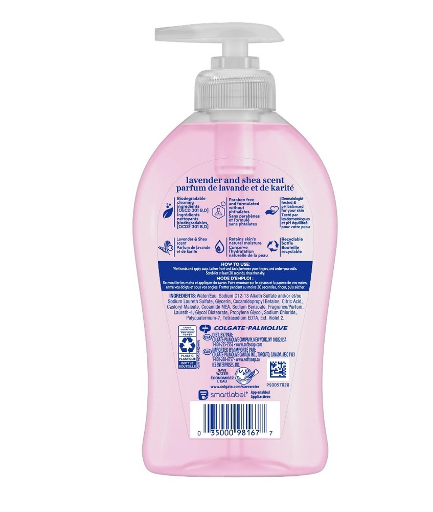 3 Pack Softsoap Moisturizing Liquid Hand Soap, Shea Butter & Lavender, 11.25 oz. From the #1 liquid hand soap brand (1) comes a deeply moisturizing hand soap with a lavender and shea scent. With its beautiful bottle design and modern pump head, Softsoap's Lavender and Shea Moisturizing Liquid Hand Soap perfectly complements the elegance of your bathroom or kitchen sink. This fun pink hand soap with its sweet and floral scent will infuse joy into the smallest moments. This scented hand soap deeply moisturizes to hydrate dry skin, all while effectively washing away bacteria for clean and fresh hands. The creamy formula hydrates dry skin, leaving your hands feeling soft and smooth. Our dermatologist tested formula retains skin’s natural moisture and is formulated without parabens and phthalates. This liquid hand soap is one you’ll want to keep on your sink to infuse every small moment with joy. (1) Based in part on data reported by Nielsen through its Market Track Service for the Liquid Hand Soap Category for the 52 week period ending 07/01/23, for the All Outlet market. Copyright © 2023 Nielsen. Suitable for all ages and all skin types. Three 11.25 oz Bottle of Softsoap Lavender and Shea Moisturizing Liquid Hand Soap Pump - The #1 Liquid Hand Soap Brand This fun pink hand soap with it's sweet and floral scent will infuse joy into the smallest moments With its beautiful bottle design and modern pump head, it perfectly complements the elegance of your bathroom or kitchen sink The creamy formula hydrates dry skin, leaving your hands feeling soft and smooth Elevate your senses while effectively washing away bacteria with this moisturizing hand soap The #1 Liquid Hand Soap Brand* *Based in part on data reported by Nielsen through its Market Track Service for the Liquid Hand Soap Category for the 52 week period ending 07/01/23, for the All Outlet market. Copyright © 2023 Nielsen. Retains skin’s natural moisture Dermatologist tested & pH balanced for your skin Suitable for all ages and all skin types. Floral scent