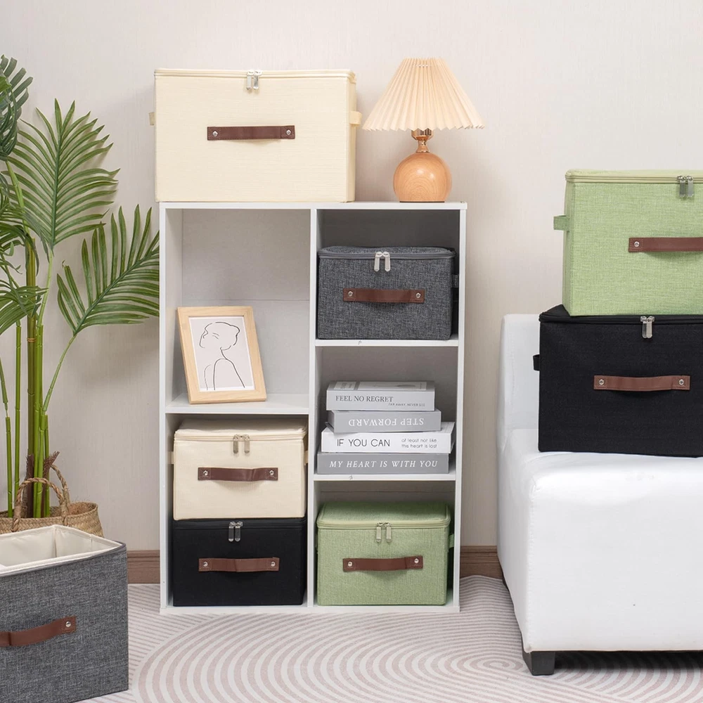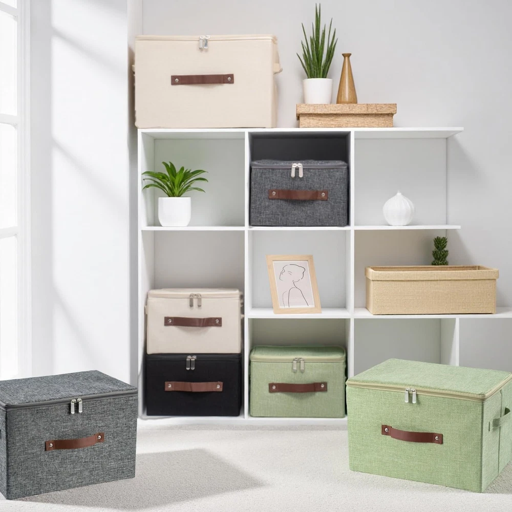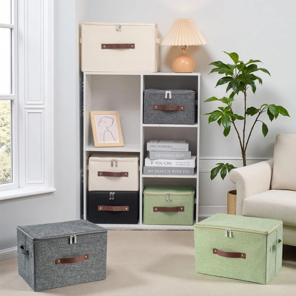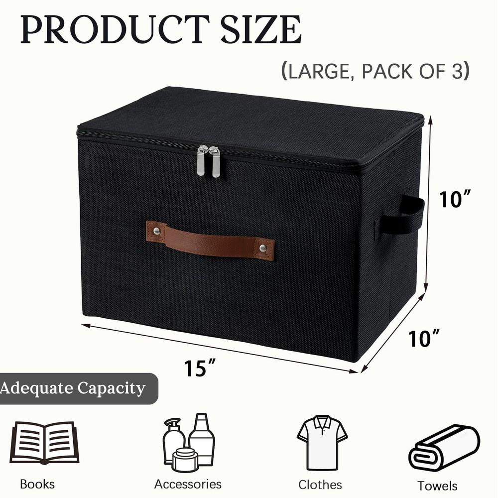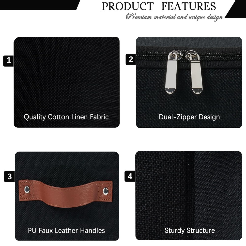 Specifications: Material: cotton linen and plastic Color Options: Black, Gray, Green, Beige Size Options:10"x8"x7",15"x10"x10" 【Premium & Durable】Storage Bins with Zipper, made from high quality cotton linen fabric with durable PP plastic boards(750GSM thickness), sturdy, washable and breathable for your long terms storage needs. 【Proper Capacity】Collapsible Storage Box , Set of 3, available in 2 sizes: small-10" long, 8" wide and 7" high and large - 15" long, 10" wide and 10" high, perfect for storing clothes, books, towels, documents, accessories, and more. 【Dual-Zipper Design】Sturdy plastic boards with dual-zipper design which are hard to be broken, easily pulled to open and close, keeping your items neatly organized, clean, and secure. 【Space-saving and Stackable】These storage Baskets are collapsible and stackable when not in use, helping you save much storage space. Easy to unfold when you need them again. 【Convenient Handles】Designed with PU Faux Leather in front and cotton linen handles on both sides for comfortable carrying during movement, making it easy to slide in and out. our storage cubes ensure easy pick up, put down.