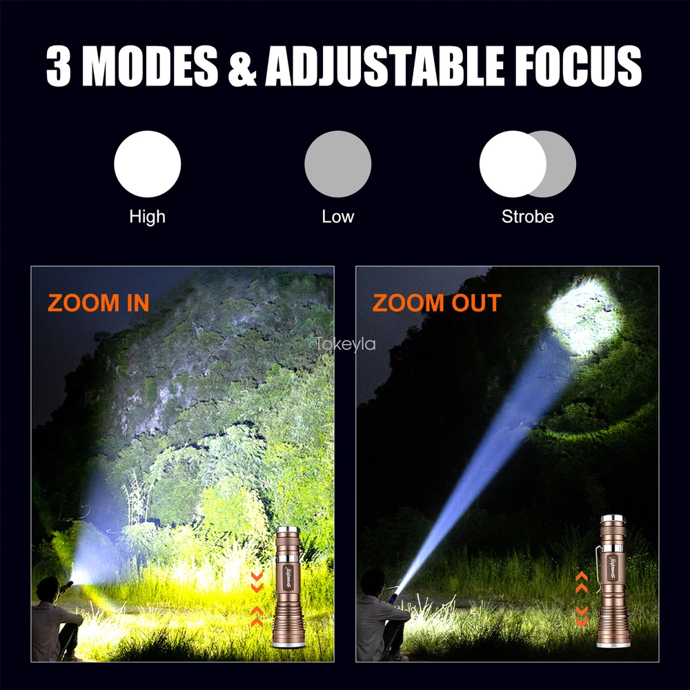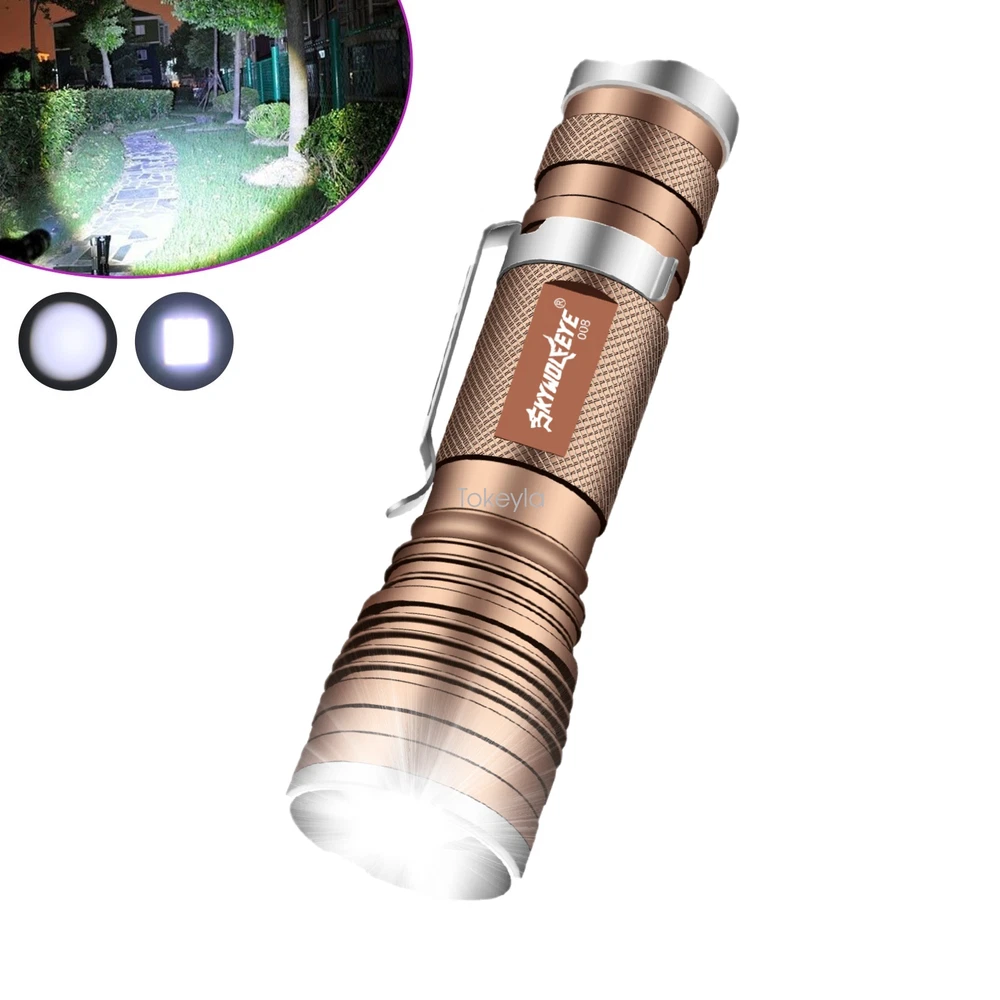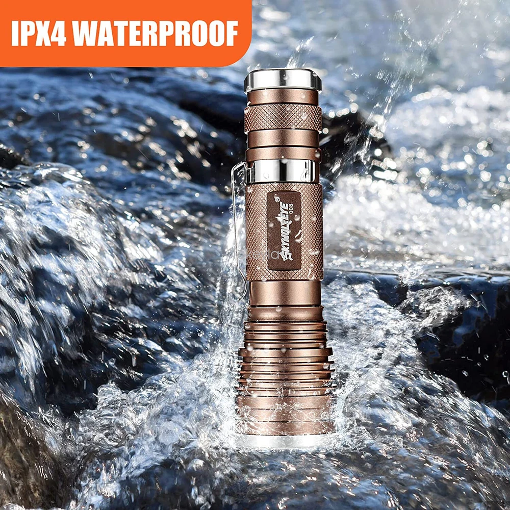 Operating Time: 1-5 Hours Number of Lights: 1-3 Color: Bronze Type: Flashlight Item Height: 0.94 inch Item Width: 1.26 inch Voltage: 3.7V Battery Included: No Lighting Technology: LED Brand: Sky Wolf Eye Number of Batteries: 0 Number of LEDs: 1 IP Rating: IP50 Item Weight: 4.0 ounce Item Length: 4.45 inch MPN: Does Not Apply Country/Region of Manufacture: China Material: Aluminum Features: Clip On, Handheld, Rechargeable, Waterproof, Super Bright Zoomable LED Flashlight, Super Bright LED Flashlight, Flashlight High Lumens Super Bright Waterproof, LED Mini Flashlight Super Bright, Mini LED Flashlight Portable Work Light Custom Bundle: No Model: Super Bright LED Flashlight Power Source: 1x 3.7v Lithium Rechargeable Battery(Not Included)