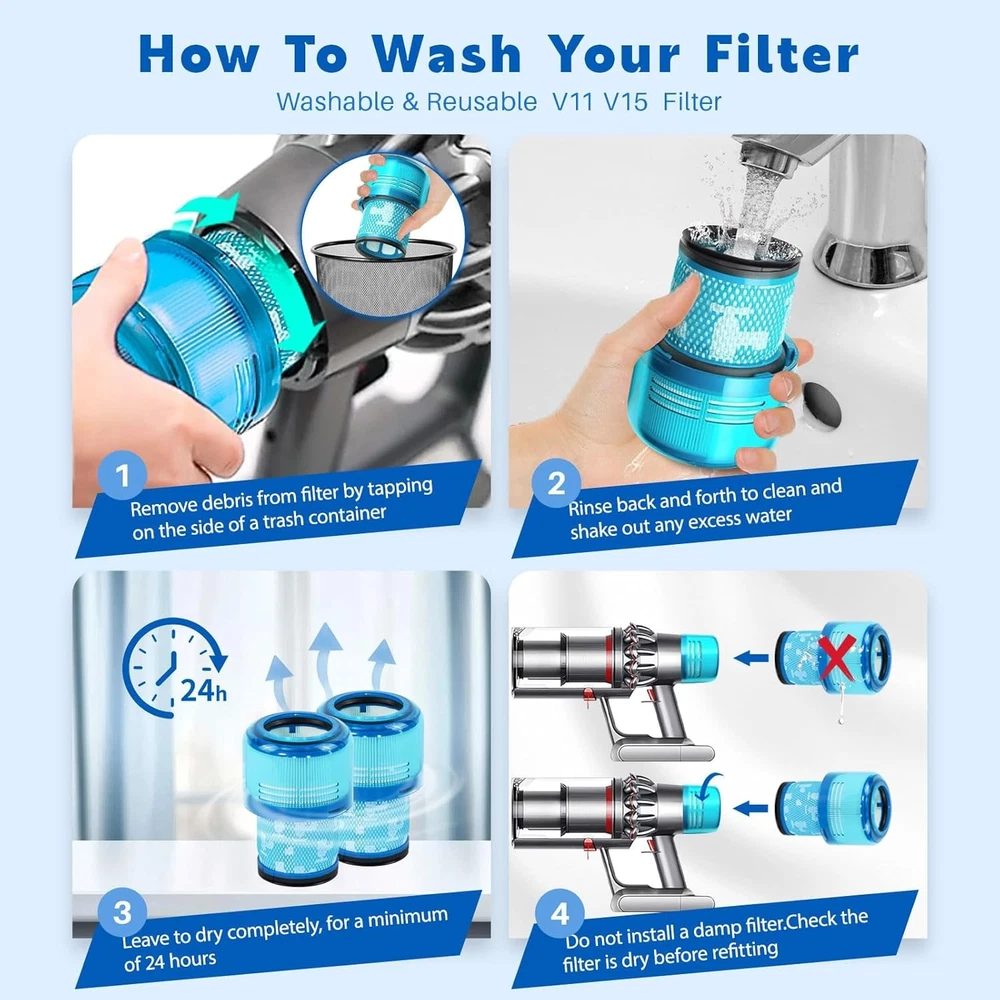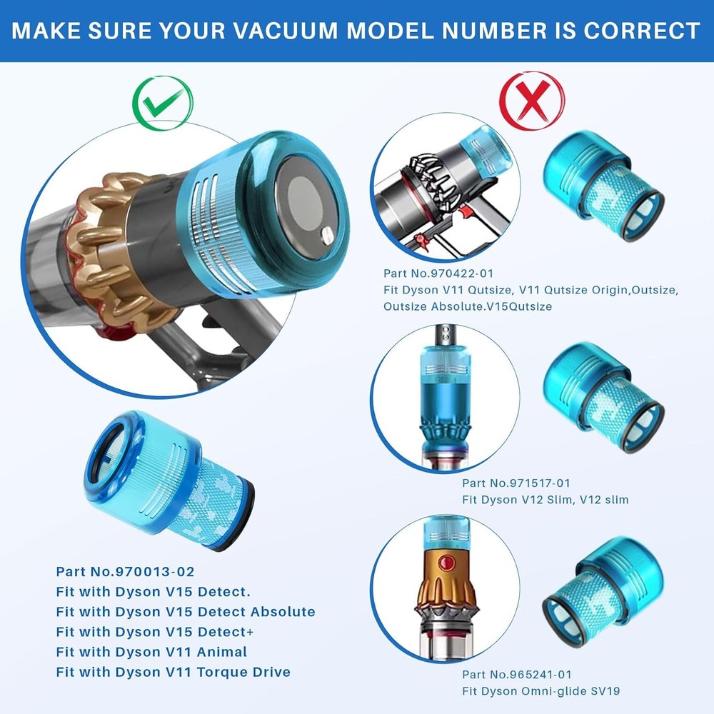 3 Pack V15 Vacuum Filters Replacement for Dyson-V15 Detect, Filter-3Pcs Description Features: Compatibility: Compatible with Dyson Cordless Vacuum V15 V11 SV14, Fit for Dyson-V15 V11 Torque Drive Vacuum and Fit for Dyson V11 Animal. Compare to Part # 970013-02. Not suitable for Dyson-V11/V15 outside vacuum. Please confirm your accessory model before ordering Mismatch Model: NOT compatible with Dyson-V15 Outsize, V11 Outsize, Outsize Absolute+, V12 Slim vacuums, Dyson Gen5 Series and SV19 Omni-glide + vacuums Valuable Package : Includes 3 Pack V11 V15 replacement filters and 1 brush.Fanulter replacement parts seamlessly integrate with your vacuum cleaner, ensuring great performance Washable Reusable: Filters can be hand-washed with warm water, air-dried, and reused for cost-saving and prolonged use Cost-Effective Maintenance: Recommended to wash every 3-5 weeks and replace every 3-6 months for great performance, ensuring a fresh home environment Product Details: Brand Name: Fanulter Model Info: Dyson V11, V15 Item Weight: 13.1 ounces Product Dimensions: 2.3 x 3.5 x 5.1 inches Country of Origin: China Item model number: Dyson V11, V15 Part Number: V11 Filter-4Pcs Color: V15 Filter-3Pcs Material Type: HEPA Included Components: HEPA Batteries Included?: No Batteries Required?: No Brand: Fanulter Material: HEPA Product Dimensions: 2.3"L x 3.5"W x 5.1"H Number of Pieces: 3 Reusability: Reusable Handling We will ship all orders within 3 business day of payment. Delivery We take pride in offering fast and reliable delivery for your orders! We are committed to getting your products to you as quickly as possible. Generally, we would like to inform you that all orders will be delivered to you within 1-3 business days after processing.However, in some cases, delivery times may vary depending on the buyer's location. Especially in remote or rural areas, the expected delivery time may be extended. In such situations, we do our best to ensure that your order reaches you as quickly as possible.If there are any delays, we will be happy to contact you to explain the situation. Our goal is to enhance your satisfaction with our fast delivery times. We work diligently to ensure that your order arrives safely.Trust us and enjoy our speedy delivery! Return Policy All items qualify for returns within 30 days of receipt. Buyer is responsible for return shipping on any item that is not damaged. Feedback We take our reputation seriously, we buy and sell online, so we understand the value of trust. If you are unsatisfied with your order, please contact us and we will work with you to resolve it to your satisfaction.