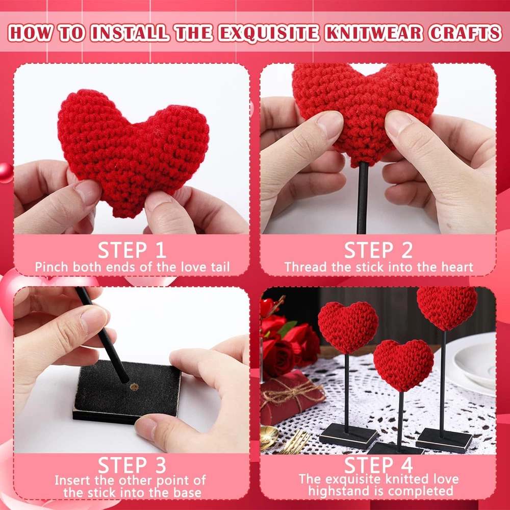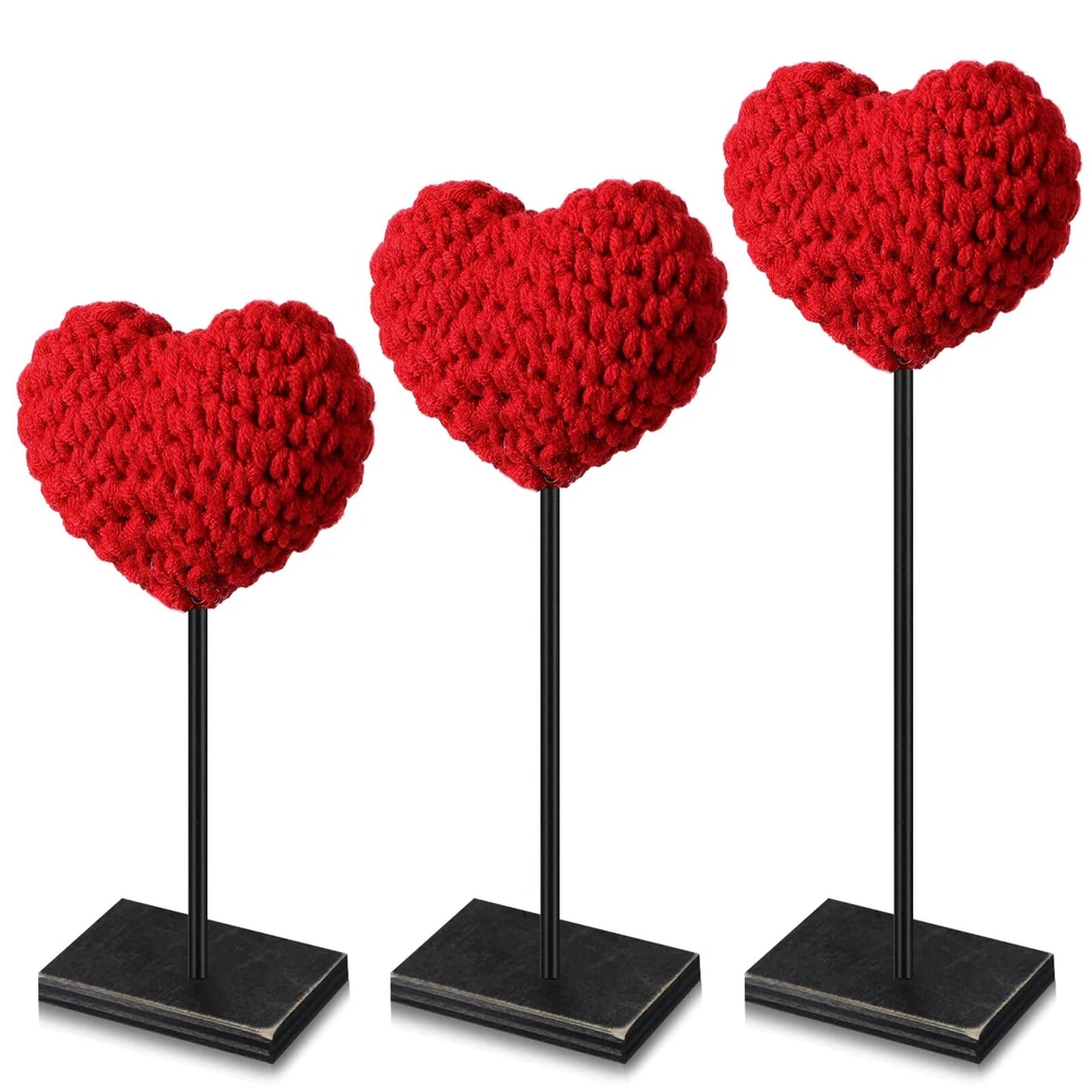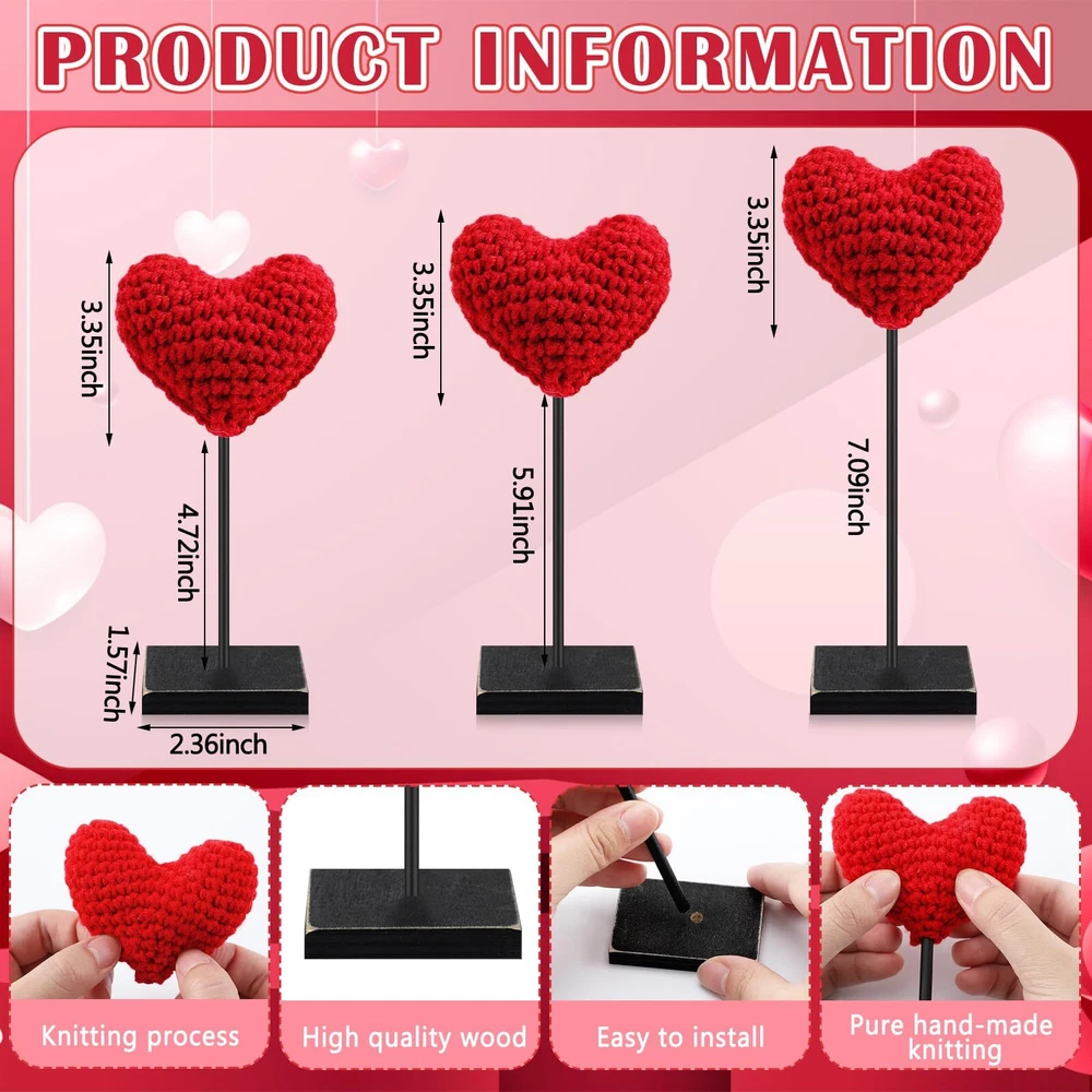 Features: With these exquisitely knitted heart table decors, every day can be a special celebration of love. Whether it's an ordinary day you want to make special, or a significant occasion like an anniversary, these decors ensure to enhance the ambiance. These delicate heart shaped decors play a significant role in establishing a strong romantic atmosphere. Whether applied for a Valentine's Day dinner, a wedding or an anniversary celebration, they're sure to add a dash of romance to the proceedings. Specifications: Sticks material: wood Color: red Heart part of knitted heart table decor size: about 3.35 inches/ 8.5 cm Sticks size: about 7.09 inches/ 18 cm, 5.91 inches/ 15 cm, 4.72 inches/ 12 cm Bases size: about 1.57 x 2.36 inches/ 4 x 6 cm Package includes: 3 x Valentine's Day knitted heart table decors Notes: Manual measurement, please allow slight errors on size. The color may exist a slight difference due to different screen displays. Valentine's Day Knitted Heart Decor Set: the package includes 3 pieces of Valentine's Day knitted heart table decors, with 3 sturdy bases and 3 sticks; Simply combine the components to effortlessly create a romantic Valentine's Day setting Ideal Size: the heart parts measure about 3.35 inches in size, and the sticks have 3 different lengths, respectively about 7.09 inches, 5.91 inches and 4.72 inches; The sturdy bases are about 1.57 x 2.36 inches, offering stable support Hand Knitted Design: the heart part is meticulously hand knitted, providing a rustic, charming touch to your decor; The vintage design on the bases adds a touch of timeless elegance, serving as an aesthetically pleasing manner to celebrate love Stable and Versatile: our table decors come complete with thick bases and sticks, ensuring that they stand firmly; Our design allows easy removal and storage, making them an ideal decor piece for windows, tables, fireplaces, and more Suitable for Various Occasions: these heart table signs aren't just for Valentine's Day, you can use them to spruce up your Christmas decor, add a romantic touch to a wedding or anniversary, or even create a special atmosphere for an engagement or a date