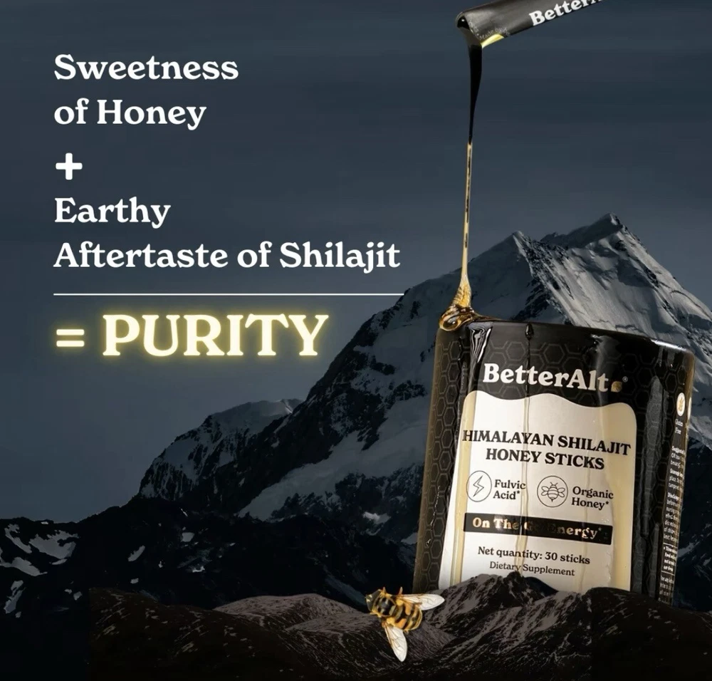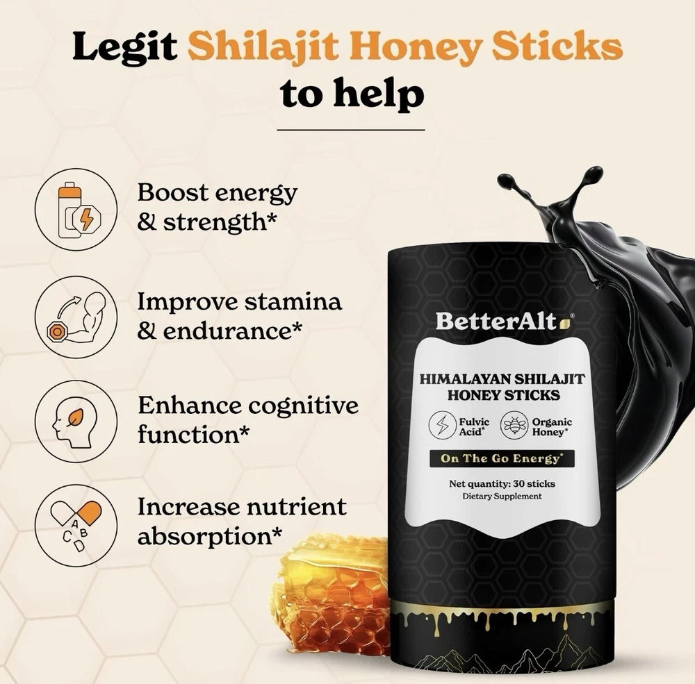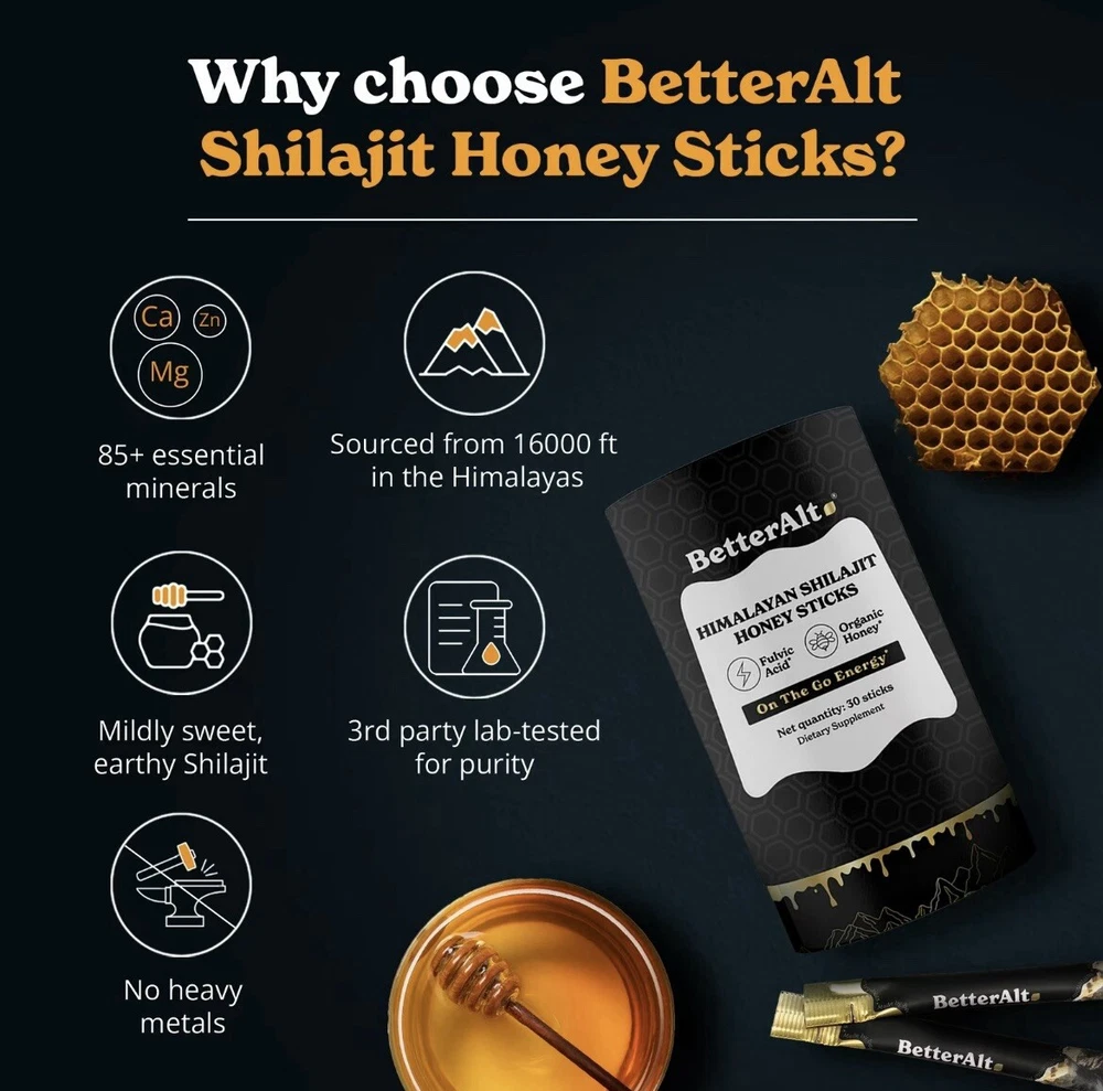 Recharge your body and support your reproductive health with BetterAlt’s Pure Himalayan Shilajit Honey Sticks! Each pack (30 sticks) blends nutrient-rich Himalayan Shilajit with organic honey, offering a natural and delicious way to boost your energy and vitality. Loaded with essential minerals and fulvic acid, this powerful combination is crafted to enhance stamina, energy levels, and overall well-being. Take charge of your health—order yours today !