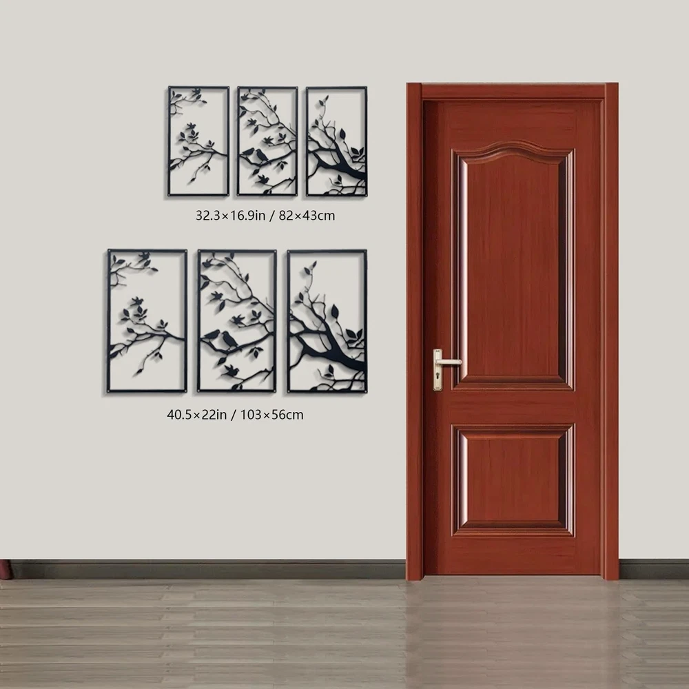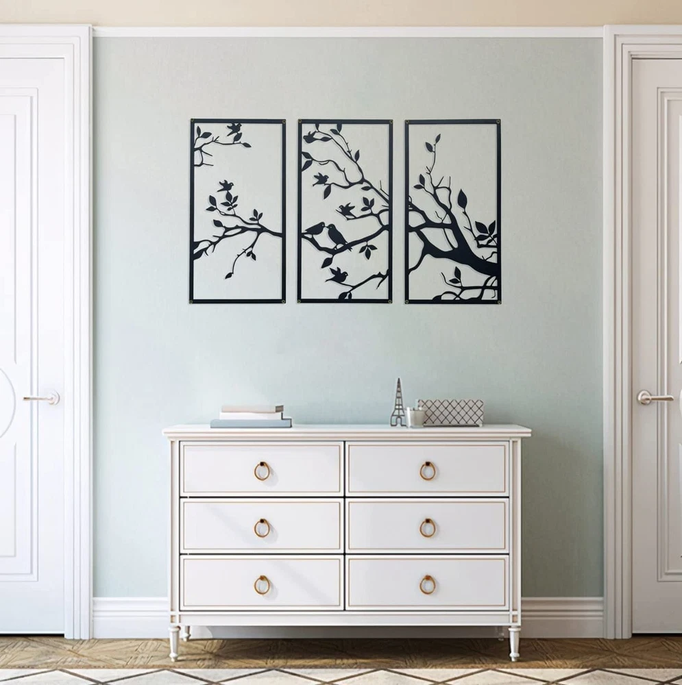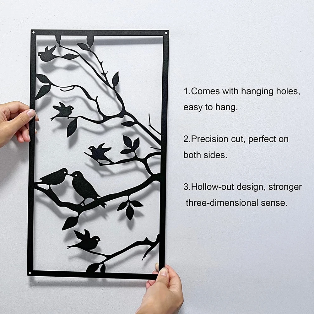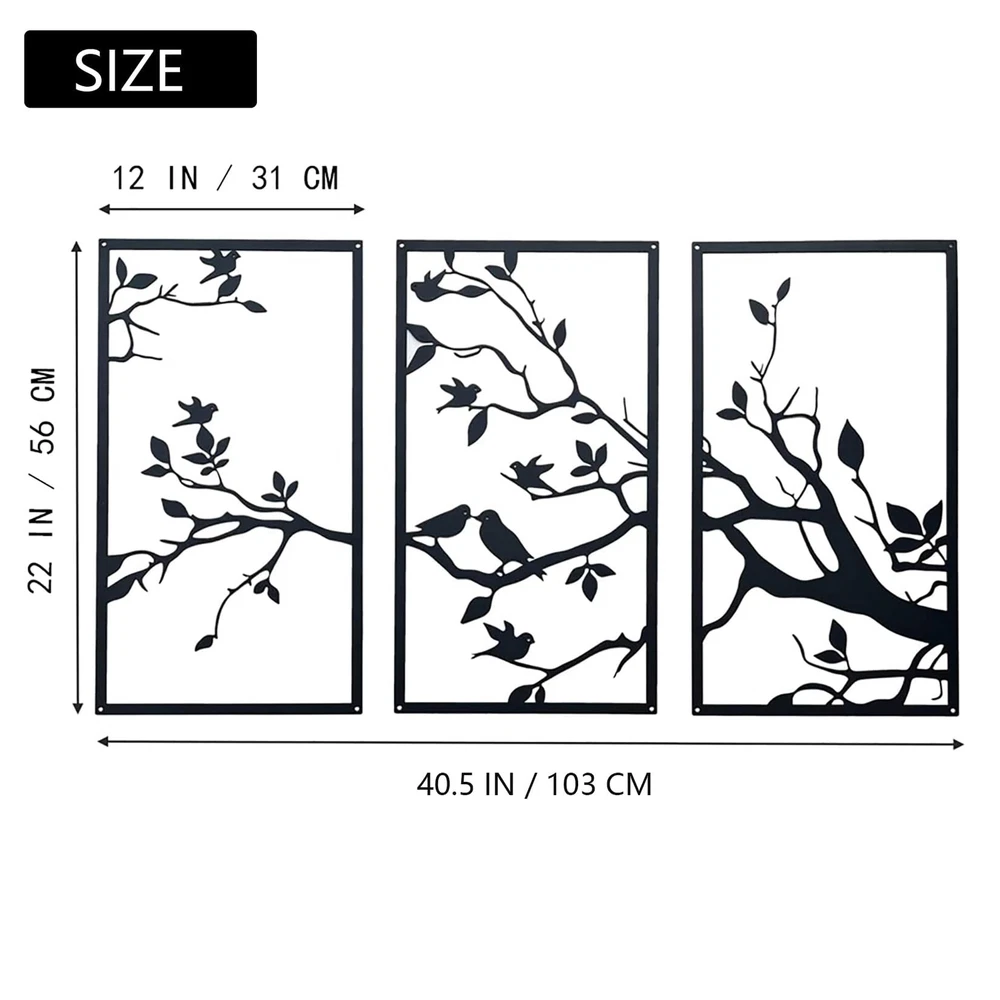 3 Packs Birds On Branch Large Metal Wall Art Decor,Black Tree of Life Silhouette Sculpture ,Leaves with Birds Metal Ornament Hanging Sign for Home Garden Office Living Room Indoor Outdoor Product Details Color: Black Size: 40.5 x 22 in / 103 x 56 cm Brand: DUOOLN MPN: Does not apply UPC: Does not apply EAN: Does not apply Product Dimensions: 22 x 36.6 x 0.2 inches Item Weight: 3.31 pounds Country of Origin: China Finish types: Powder Coated Number of pieces: 3 Batteries required: No UNIQUE DESIGN TREE OF LIFE WALL ART: A symbol of beauty. the feature of this metal tree wall art is that there are cute birds on the branches, and the branches and leaves of the leaves metal wall art grow upward and are very lush, symbolizing the prosperity of family and business, and endless life; many birds are on the branches, symbolizing harmony, happiness and reunion of family members. MATERIALS AND DIMENSIONS: This black with bird wall decoration is made of 100% high quality iron, durable and reliable. you will receive 3 pieces of metal branch wall hanging, the size is about 40.5 x 22 inches / 103 x 56 cm. EXQUISITE CRAFTSMANSHIP: Precisely cut hollow design makes wrought iron wall decoration have a smart three-dimensional effect, leaf metal wall art can get rid of monotony in your room and add a touch of color to the wall; black texture electrostatic powder coating, non-fading, corrosion-resistant, beautiful and easy to clean. EASY TO HANG: The installation of the metal bird hanging ornament is simple and convenient. each piece of branch decoration has a small cutout at the four corners for easy hanging on indoor and outdoor walls. simple and stylish design that magically fills your room with a spring feel. WIDE APPLICATIONS: The branch wall hanging sign is suitable for dressing up your house decor, you can display them inside your home like bedroom, living room, kitchen, hallway or outside the house and office, this adorable hanging bird decor really adds a warm style to your home.Also a great gift for friends and family, as a housewarming gift, christmas gift and other holiday gifts.