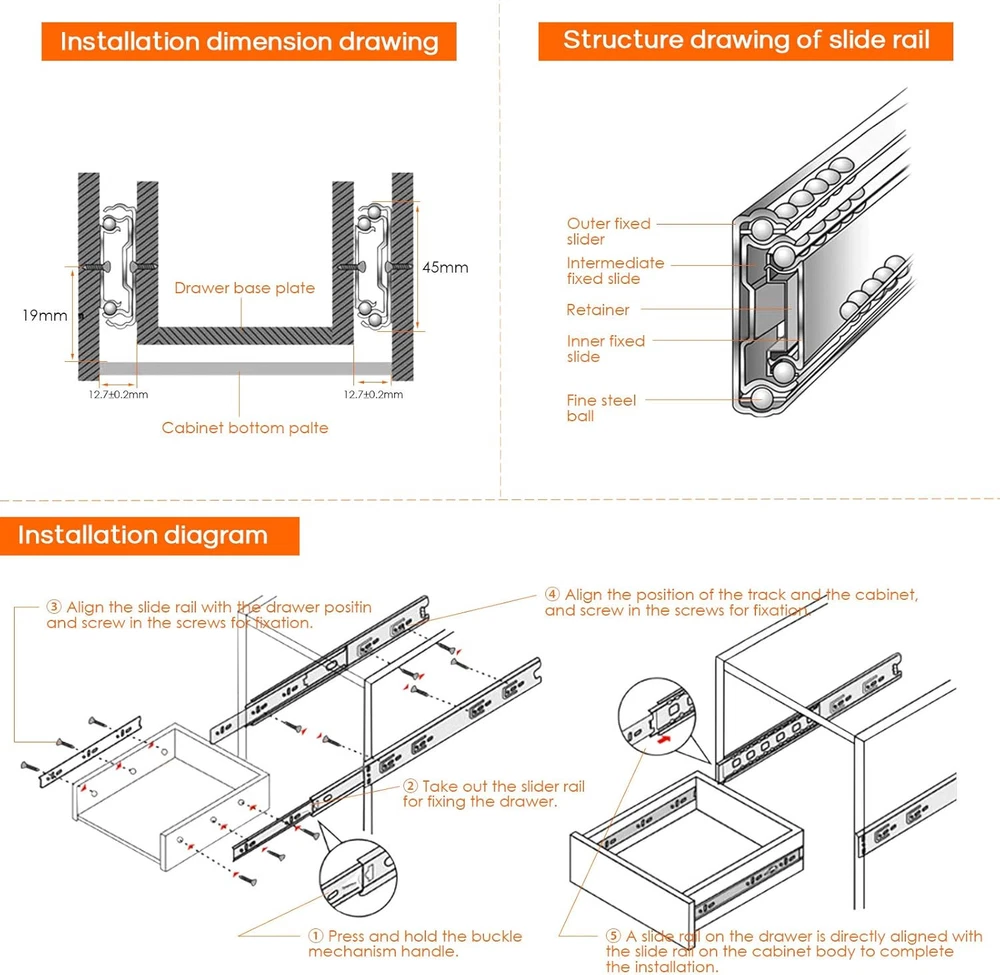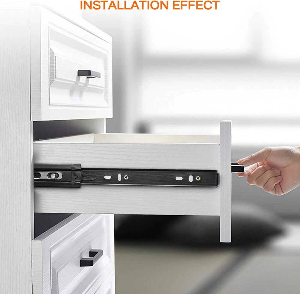3 Pair Drawer Slides 10 inch, Heavy Duty Ball Bearing Full 10Inch, Black Product Details Mounting Type: Side Mount Weight Limit: 100 Pounds Drawer Type: Side Mount Manufacturer: ESPEN Part Number: DrawerSlides-10inch-6-BK-210116m Item Weight: 2.9 pounds Product Dimensions: 10 x 1.75 x 0.46 inches Item model number: DrawerSlides-10inch-6-BK-210116m Size: 10Inch Finish: Steel Maximum Weight Capacity: 100 Pounds Batteries Included?: No Batteries Required?: No Color: Black Material: Alloy Steel Brand: ESPEN Product Dimensions: 10"L x 1.75"W x 0.46"Th Finish Type: Steel 10 INCH SOFT CLOSE DRAWER SLIDES: Length: 10 inch(250mm), Suitable for long cabinet depths of 10-12 inches(250-300 mm), Carrying capacity: 45 kg / 100 lb FULL EXTENSION DRAWER RUNNERS & DETACHABLE: Full extension drawer runners noiseless ball bearing drawer runners rail.Detachable internal guide rail (to remove the tool from the drawer). SOLID BALL BEARING DESIGN: Steel ball bearing action that offer less noise at closing and opening. very effectively ensure the stability and smoothness of the orbital operation. WIDE APPLICATIONS: They are widely used on: dresser, spice rack, kitchen cupboard, bed drawers, keyboard, shelves... perfectly for your DIY projects EASY INSTALLATION: Push to open style which do not need a drawer handle.Side mount and will fit most cabinet drawers, Mounting screws not included. ESPEN 3 Pair Full Extension Drawer Slides, 10 Inch 3-Section Silent Soft Closed Ball Bearing Drawer Slides is suitable for kitchen cabinets, offices, hotels, accommodations, institutions and residences SPECIFICATION Material: High quality cold rolled steel Size: 10 inch Color: Black Max Load Capacity: 45KG/100 lb Features: ball bearings & cushion pad FEATURE 1.Solid metal steel ball design: Pull back and forth more smoothly and more firmer quality 2.Full extension: 3 Folds Full Extension, opening allows for the entire drawer to be accessed. 3.Slides easily with a slight push and operate smoothly. 4.Quality Material : Made from high-grade cold rolled steel. Zinc Plated. Rust resistant for your lifetime use. 5.Less noise : Steel ball bearing action that offer less noise at closing and opening. 6.Rubber brake preventing from automatic opening.provides slient and friction-free motions when open drawer. 7.Anti rust and corrosion protection: drawer slides are treated with electrophoresis, and the electrophoretic layer blocks the direct contact between the air and the rail steel plate, which is resistant to oxidation and corrosion PACKAGE INCLUDED: 3 Pair 10 inch Ball Bearing Full Extension Drawer Slides