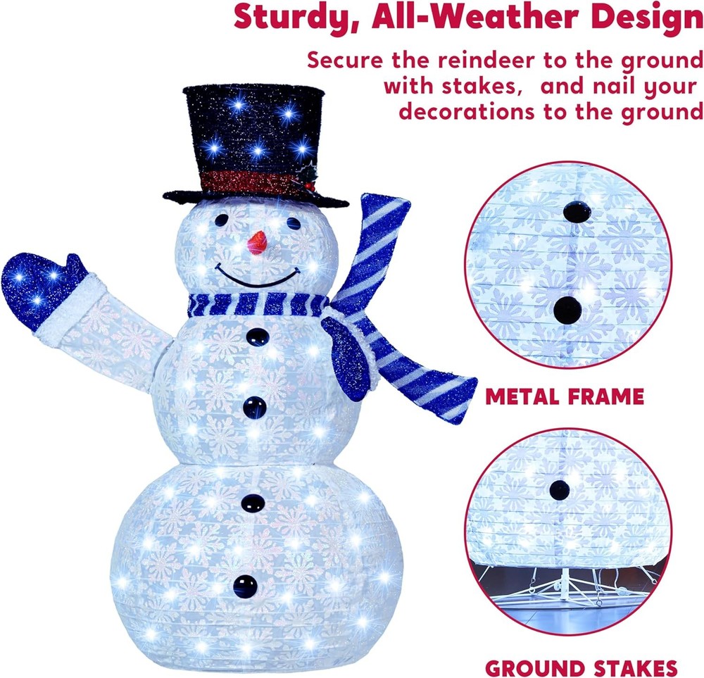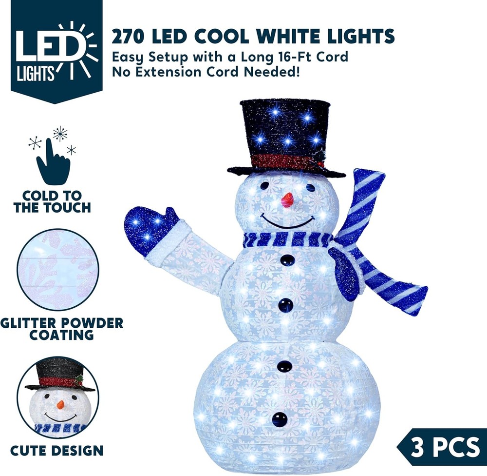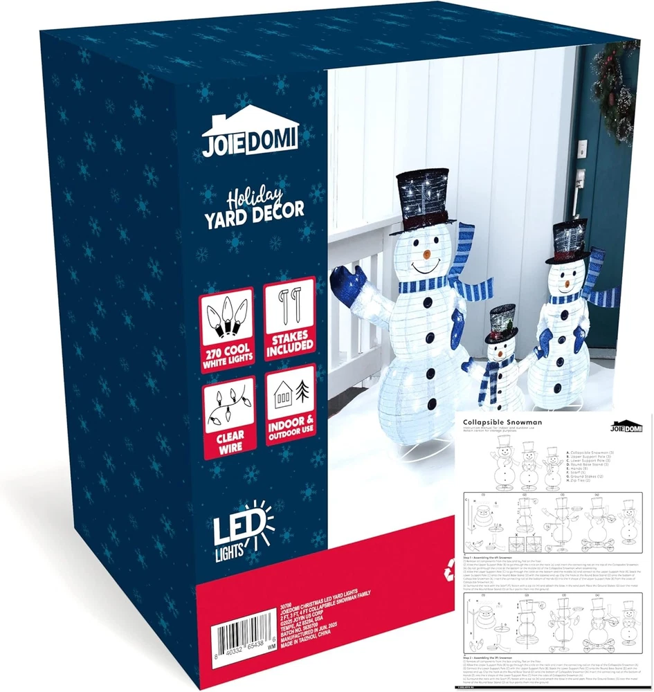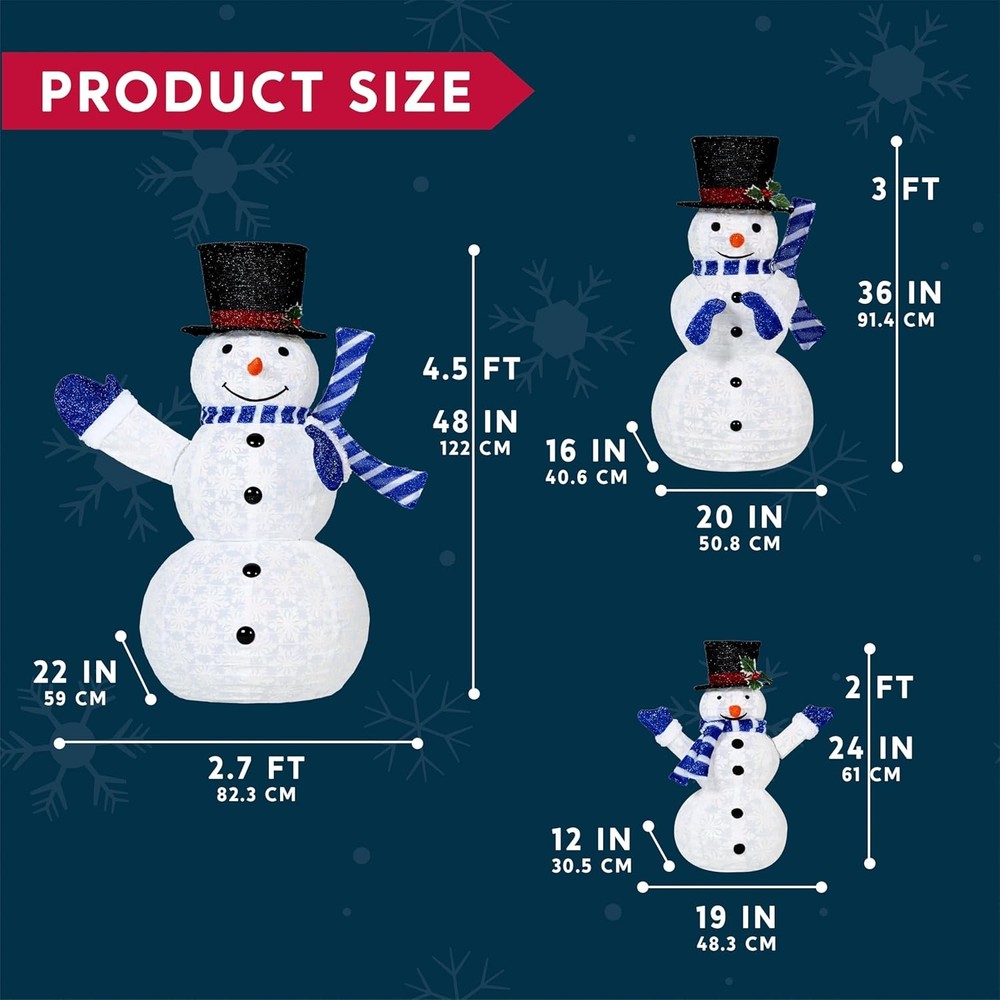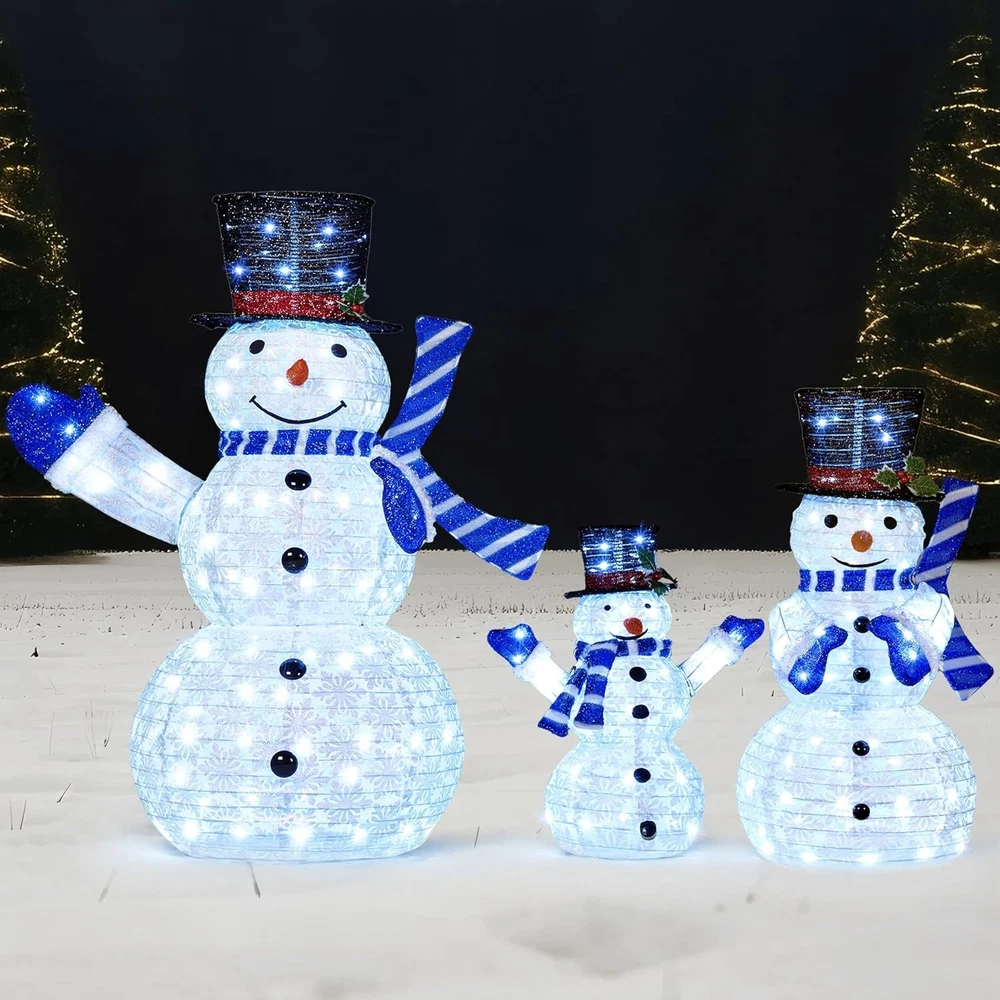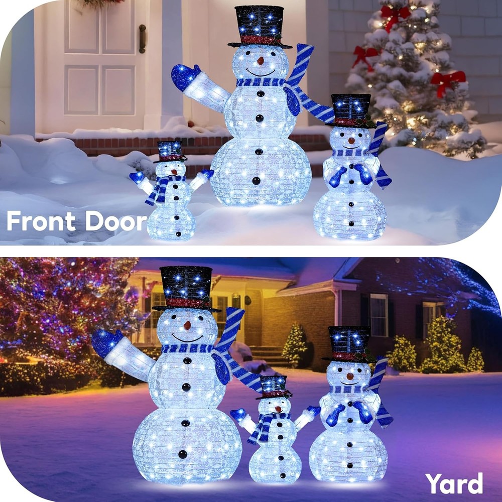 Store New Arrivals Add to Favorite View Feedback Contact 3 Pcs 3D Christmas Collapsible Snowman Yard Light 270 LED Cool White Lights Description Number of Light Sources 270 Color Cool White Light Color Cool White Material Metal Package Dimensions 23 x 20.5 x 8 inches Item Weight 12.57 pounds Theme Christmas Frame Material Metal 【Dazzling Cool White LED Lights】Illuminate your nights with our lighted outdoor christmas decorations! This light up snowman family features 270 (large snowman 120 & medium 90 & small 60) cool white LED lights for a brilliant display. The energy-efficient led snowman design uses less power. With clear wires, these snowman christmas decorations stay elegant unlit. Perfect outdoor lighted christmas decorations for your christmas yard decorations. 【Super Value Snowman Family Set】Create a heartwarming scene with our snowman family set, featuring large snowman (4FT), medium (3FT), and small (2FT) figures. These snowman outdoor decorations have classic hats and blue-and-white scarves. Though not pop-up, they assemble easily. Ideal front door christmas decorations or christmas lawn decorations, this outdoor snowman family brings cheer 【Weather-Resistant & Built for Outdoor Durability】These snowman outdoor christmas decorations feature metal frames with an IP44 waterproof rating, making them reliable outside christmas decorations for yard. While the snowman decor is weather-resistant, keep the adapter dry. With 12 ground stakes, these outdoor christmas lawn ornaments stay secure in wind. 【Effortless Setup with Enhanced Safety Features】Our snowman christmas decorations outdoor feature simple assembly.It has pre-wired frames and is very durable. The 4.5V low-voltage system and UL-certified adapter make these lighted snowman outdoor christmas decorations safe for families. As versatile outdoor holiday decorations, they create a magical merry christmas lighted sign outdoor ABOUT US We offer the best prices around on high quality products. Our E-store includes media such as books, movies, music and games while offering electronics, toys, sporting apparel, clothing, tools, general home, garden items and more. SHIPPING We are always working hard to ensure your package arrives as soon as possible. Please understand that some factors like weather, high postal traffic, and the performance of shipping companies are outside of our control. We offer free shipping to the lower 48 states and ship within 2 business days of payment, usually sooner. We do not accept P.O. Boxes. Please provide a physical address. For shipping outside of the continental USA, we only use eBay's Global Shipping Program.The item is shipped to KY and then sent to the rest of the world. International customers are responsible for all duties and taxes. Continue to check out in order to calculate costs for shipping the item to your country. Messages regarding eBay's Global Shipping Program MUST be directed at eBay EXCLUSIVELY. RETURNS We offer a 30-Day Return Policy on items which you are not completely satisfied with. You have the option for a full-refund or an exchange of the item. No returns are available on items shipped outside of the USA. PAYMENT We accept PayPal. CONTACT US This page content is yet to come Please ad us to your favorite seller and visit again later Thank You CUSTOMER SATISFACTION We try our very best to make sure every customer is completely satisfied. If there's a problem, message us! We're happy to help.