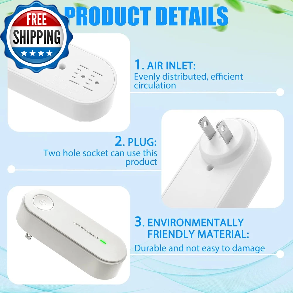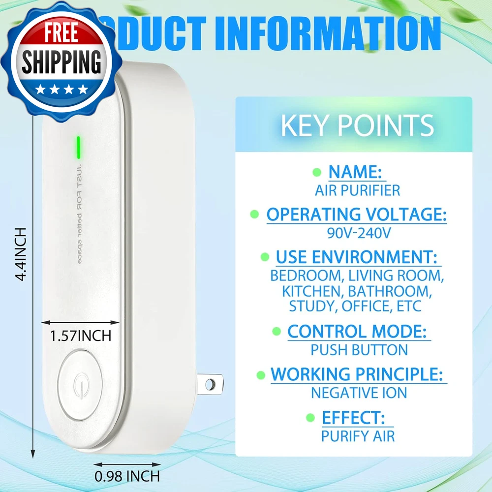 3 Pcs Air Purifier Plug in Portable Negative Ion Generator Filterless Home Air Ionizers Freshener Filter Cleaner for Removing Smell Pollutants Odor Dust Car Room Bedrooms Toilets Office What You Will Receive: the package contains 3 pieces of ionic air purifiers for home in white color, which can to remove bad odors, such as pet smell, laundry odors, rubbish odors, dirt and more, suitable for you to use at home or going out, bringing you a clean and cozy living Convenient to Use: the negative ion generator adopts plug in power, and can be turned on or off by one button, with a working indicator, ionizer air purifier is easy and convenient for your daily using Good Performance: Whenever working for 2 hours, our plug in air purifier will automatically stop for 20 minutes, and then automatically continue to work, and stays quiet while working by releasing 20 million ions, which can purify the air and bring you a healthy and safe living environment Applicable Occasions: the negative ion air purifier can be extensively applied in the living room, bedroom, study room, kitchen, bathroom, office, hotel, shop, cafe, gym, basement, pets' room, children's room, nursery, hallways, fit for mothers and children, bringing you an enjoyable sleep time Compact and Portable: deodorizer air purifier measure approx. 4 x 2.5 x 11.3 cm/ 1.57 x 0.98 x 4.4 inches, the proper size makes it convenient for you to carry with a bag when traveling, going out or driving without taking too much space Product Description 3pcs white ionized air purifier, bring you a clean and comfortable life, the right size makes it easy to carry with you when you travel, go out or drive without taking up too much space Product Information NAME: Air purifier OPERATING VOLTAGE: 90V-240V USE ENVIRONMENT: bedroom, living room, kitchen, bathroom, study, office, etc CONTROL MODE: push button WORKING PRINCIPLE: negative ion EFFECT: purify air After two hours of continuous operation, our plug-in air purifier automatically stops for 20 minutes, and then automatically continues to work with a quiet Negative ions are known as the vitamins and longevity elements in the air, which can degrade and neutralize harmful gases in the air and settle PM2.5 and other tiny particles. This product can constantly produce negative ions, so that the feeling of freshness fills every corner of the room! Item model number 3d4bbdd2-5eb6-4133-98de-acf13c4a5839 Batteries required No Product Dimensions 0.98"D x 1.57"W x 4.4"H Country of Origin China Power Source Corded Electric Item Weight 0.21 Kilograms Item Weight 7.4 ounces Color White Control Method Touch Filter Type Ionic Air Controller Type Button Control Shipping Fast shipping is very important for us. Our standard US shipping service is FREE. Your order will be shipped within 2-3 business days upon full payment received. Your order will be delivered within 2-3 business days after the handling time. We only ship to the confirmed PayPal address. We reserve the right to cancel any order for any reason at any time. We are not responsible for undeliverable addresses. Returns and payment We offer a 30 days return policy from checkout winning date. We allow only PayPal as payment method FeedBack Your feedback very important to us, after you get your package and you are satisfied with our service please leave us positive feedback If you have any problem with your order / any questions please before leave any type of feedback Please visit our eBay store to check out other items for sale! Thank you for shopping at our store.