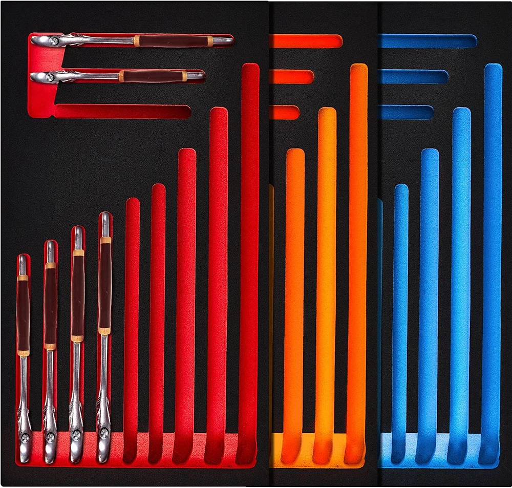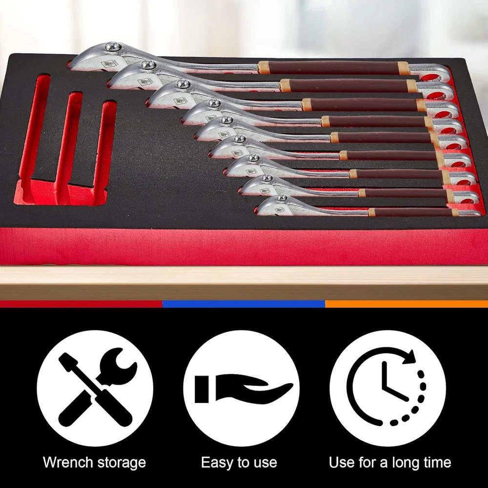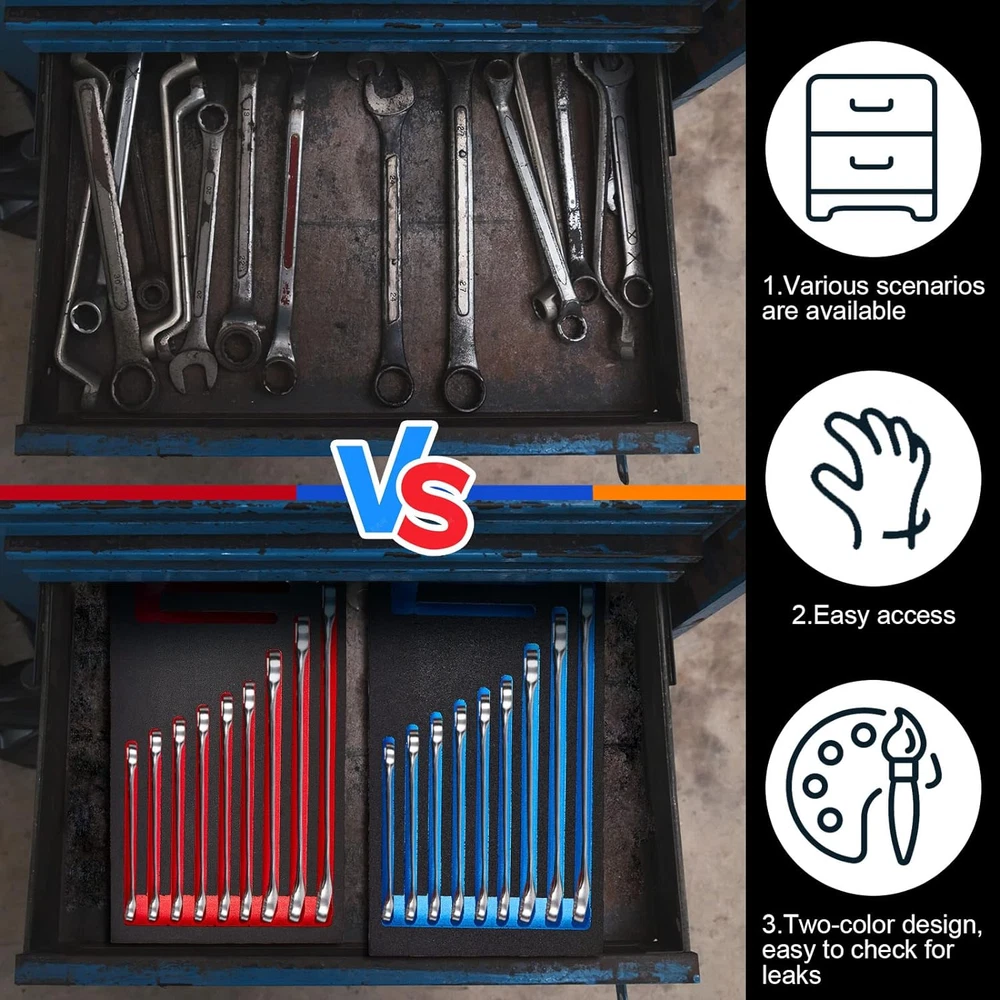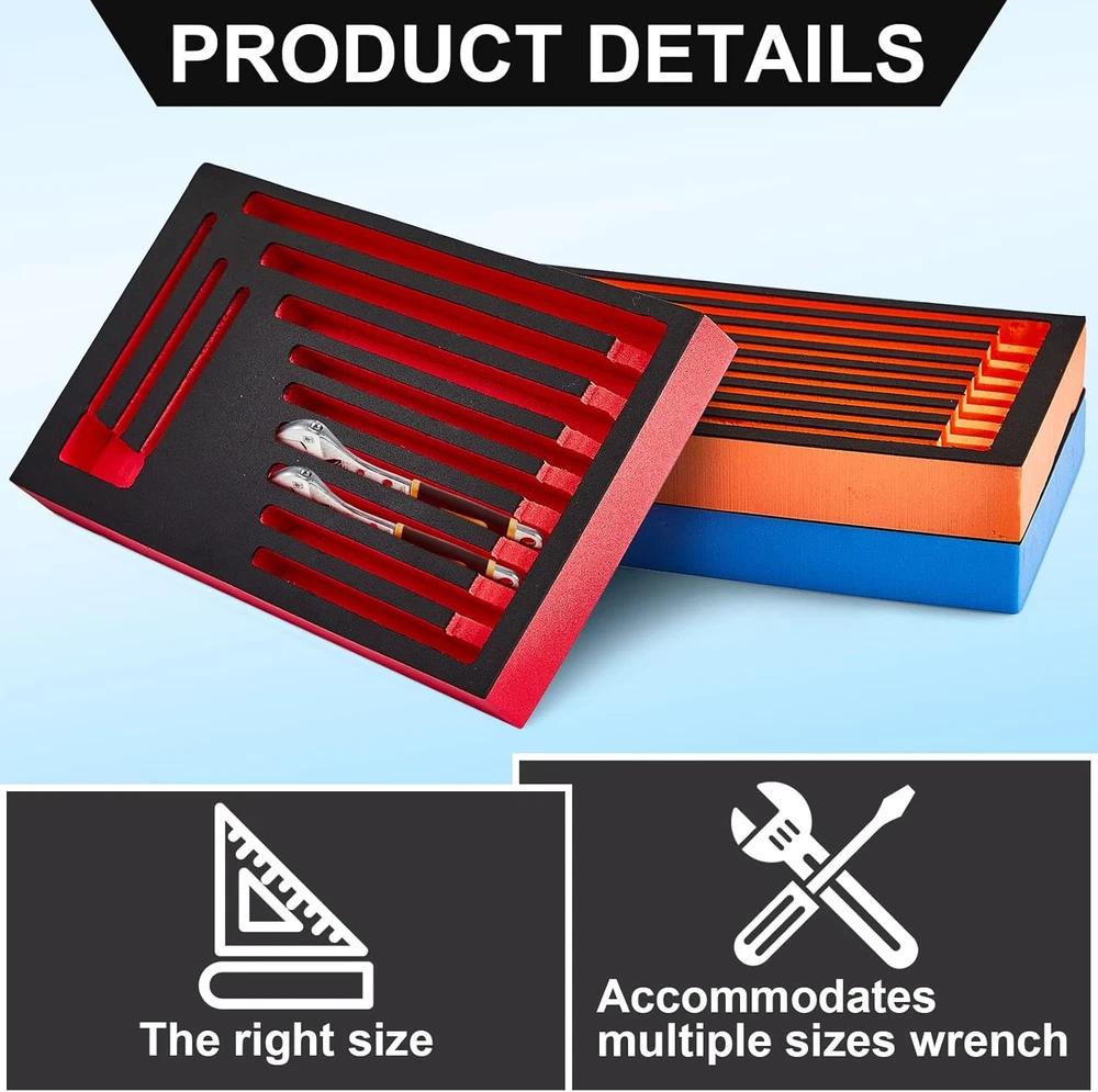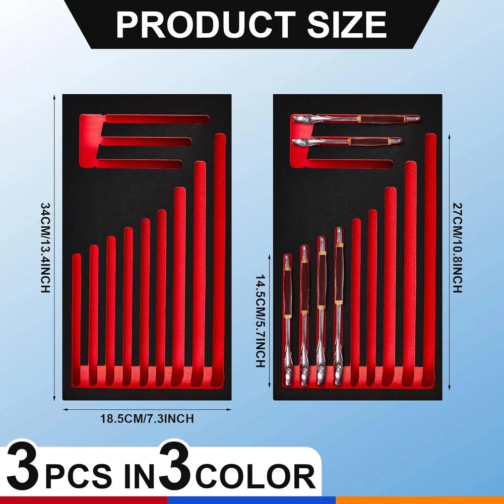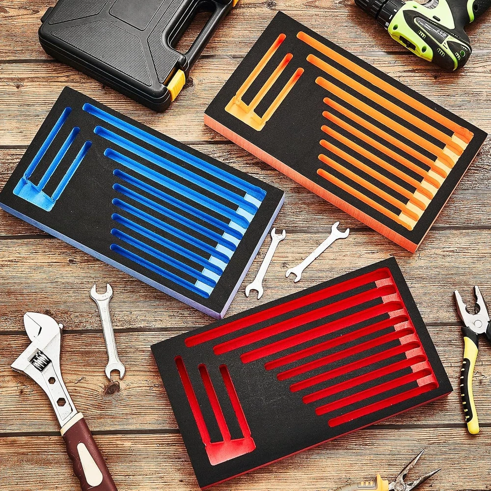 Ideal Package to Meet Your Needs: there are 3 pieces of wrench organizers in the package for you, available in 3 classic colors, the quantity is enough to satisfy your daily organization demands, and you can share them with others Functional Usage: our wrench organizer for tool box has 12 independent wrench positions, suitable for you to store fixed sockets, easy to use, and not easy to lose, providing a lot of convenience to your daily life Thoughtful and Considerate Design: our foam tool organizer comes in classic colors, allowing you to easily identify tools of different models, and find out if tools are missing in time Serviceable Material to Use: our tool box wrench organizers are made of quality EVA, reliable and stable, not easy to break or deform, allowing you to use them with confidence for a long time Wide Applications: you can put these tool organizers on the workbench, or stored in a drawer, making your workplace more neat and organized, and help you develop a good habit of tidying up Features: The tool box foam organizer comes with an appropriate size, measuring about 13.39 x 7.28 inches/ 34 x 18.5 cm, the standard size is appropriate for you to carry around, without taking up too much space. The tool box organizer tray is practical, you can use it for yourself or as gift to your family, friends and neighbors, to show them that you care about them and strengthen your relationships. Specifications: Material: EVA Color: as pictures shown Size: about 13.39 x 7.28 inches/ 34 x 18.5 cm Package includes: 3 x Foam wrench organizer Notes: Manual measurement, please allow slight errors on size. The color may exist a slight difference due to different screen displays.