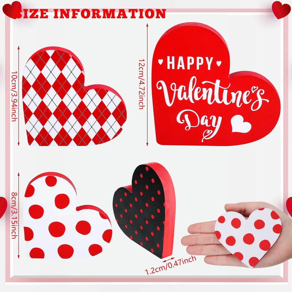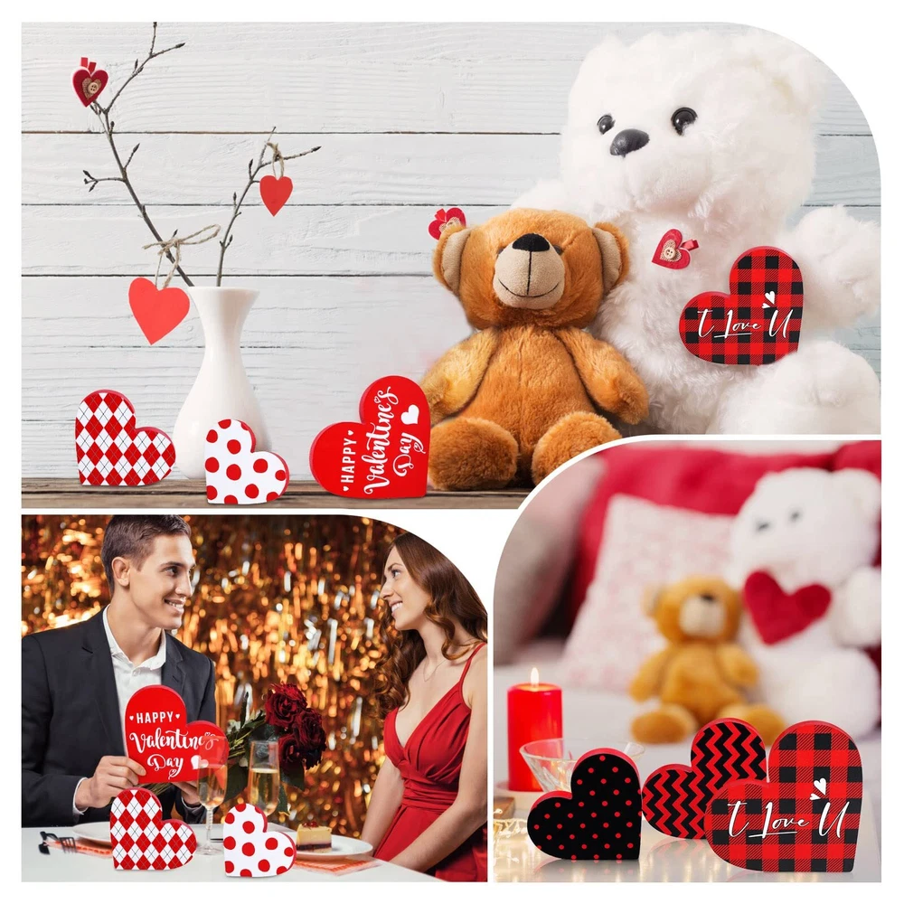 Features: Extensive applications: The heart shaped wooden pieces can be placed anywhere you want for a stunning Valentine's Day display, like your living room, kitchen, bedroom, hallway office, bathroom, hotels, bars, restaurants, and more. Reliable quality: Made of wood, the home table top sign is so firm and sturdy, hard to break or deform, without loose burrs and slivers, able to provide a long time service for you. Moreover, this valentine's day sign is of high color fastness and the color will hardly fade away. Specifications: Material: wood Color: as shown in the pictures Height of large size: 12 cm/ 4.72 inches Height of medium size: 10 cm/ 3.94 inches Height of small size: 8.5 cm/ 3.35 inches Thickness of all size: 1.2 cm/ 0.47 inches Package includes: 3 x Heart table decorations ( in different heights and designs) Notes: Manual measurement, please allow slight errors on size. The color may exist slight difference due to different screen displays. Sufficient quantity: the package includes 3 pieces of Valentine's Day signs in various adorable designs, sufficient enough to satisfy your needs for home decoration on Valentine's Day, add a warm and sweet touch to your room Double Sided Printing Design: the rustic sign decor is characterized by the large heart shaped body, and double sided printed with different romantic buffalo plaid patterns in vibrant colors of red, white, black, which presents a strong visual impact and looks quite charming Easy to use: the heart wood decor has three different heights, namely 12 cm/ 4.72 inches, 10 cm/ 3.94 inches, and 8.5 cm/ 3.35 inches, and it is designed with a flat bottom, 1.2 cm/ 0.47 inches in thickness, which enables it to stand upright on most flat surfaces and tabletops without supporting Create a romantic atmosphere: these wooden decorative signs can fill your home or office with love and lots of festive spirits, happily celebrating Valentine's Day with the one you adore, to warmly welcome your guests into your love filled home Romantic and delicate present: not only does the heart table decorations enhance the interior decorations of your home or workplace, but also make a sweet present for professing your love to your classmates, colleagues, friends on Valentine's Day, birthdays, or anniversaries