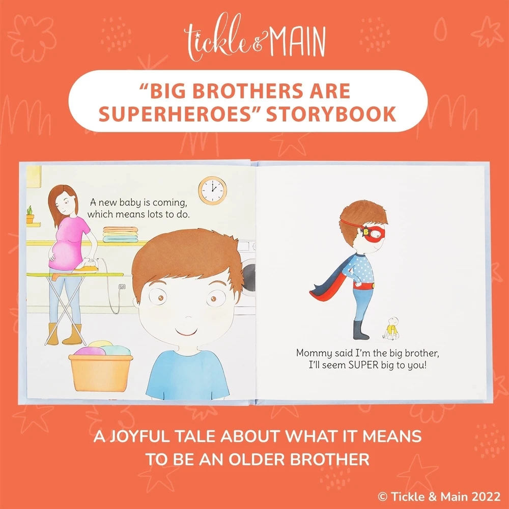 AccStation Introducing the perfect gift set for any little boy who's about to become a big brother! This 3-piece set from Tickle & Main has everything a new big brother needs to feel special and excited about his new role. First, there's the colorful storybook that comes with the set. This book is designed to educate kids about what it means to be a big brother and how to interact with a new younger sibling. It's a fun and engaging way for kids to learn about their new role in the family, and the colorful illustrations will keep them entertained as they read. But that's not all - this gift set also includes a child-sized superhero cape and matching mask! Made from 100% satin, the cape is blue on the outside and red on the inside, and measures 23” long (from the neck down) and 32” along the bottom hem. It's the perfect size for kids aged 3 to 7, and is sure to make any little boy feel like a superhero. The matching mask is double-layer felt, and is also child-sized. It's the perfect accessory to go with the cape, and will help your little one feel even more like a real superhero. With this gift set, your child will be ready to save the day and take on any challenges that come his way! And best of all, this gift set comes ready for gifting in its own custom box. So whether you're buying it for your own child or as a gift for someone else, you can be sure that it will arrive looking beautiful and ready to be opened. It's the perfect gift for any little boy who's about to become a big brother, and is sure to be cherished for years to come. So if you're looking for a gift that's both fun and educational, look no further than this 3-piece gift set from Tickle & Main. Your little one will love reading the storybook, wearing the superhero cape and mask, and feeling like a true superhero as he takes on his new role as big brother. Recommended ages 3 to 7. 3 Piece Gift Set Includes Big Brothers are Superheroes Book, Satin Cape, Mask FOR BIG BROTHER-TO-BE: Celebrate your big brother-to-be with the perfect gift set! Discover delightful big brother gifts for toddlers, including an enchanting illustrated book, a cuddly plush toy for comfort, and a fun-filled activity book. This thoughtful package will prepare and excite your child for his new role. Let him know how proud you are with a big brother cape he'll cherish for years. Get your new big brother gift set now and make his journey extra special! COMPLETE SET: Get ready for the ultimate big brother experience! This 3-piece set, featuring a storybook, felt mask, and satin superhero cape, is the perfect gift for toddlers becoming big brothers. The engaging storybook introduces the concept in a fun way. The mask and cape empower them to embrace their new role and live out their superhero dreams. Delight any young boy with this special big brother gift set, making their exciting journey even more memorable. A PRACTICAL STORY: This heartwarming story emphasizes the role of an older brother as a role model, protector, and friend. With colorful illustrations and relatable stories, it's perfect for toddlers, teaching valuable lessons about sibling love & respect. Complete with a big brother cape, it's the ideal present to show how much he cares and celebrates the big brother to be. A must-have for any family welcoming a new addition! JUST THE RIGHT SIZE: Introducing the ideal big brother gift! This 100% satin cape, measuring 23" long and 32" wide, guarantees a comfortable fit for kids aged 3 to 7. Complete with a child-sized double-layer felt mask, it's a fantastic addition to dress-up boxes and Halloween costumes. Pair it with a delightful big brother book for toddlers, and you'll make your little hero feel extraordinary! Ideal for big brothers-to-be. PERFECT HOLIDAY GIFT: Delight your little ones this holiday season with our specially curated children's gift sets, perfect for toddler Christmas gifts and baby Christmas gifts. Each set is designed with thoughtfulness and packaged for immediate gifting, making it a hassle-free choice for busy parents. Our range of toys fosters creativity, joy, and adventure, providing exciting opportunities for learning. Make this Christmas unforgettable for your little ones with our charming gift sets.