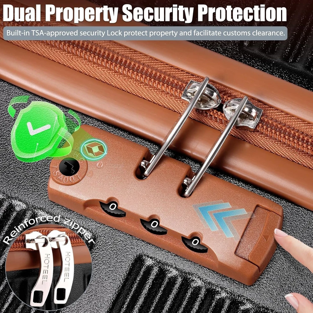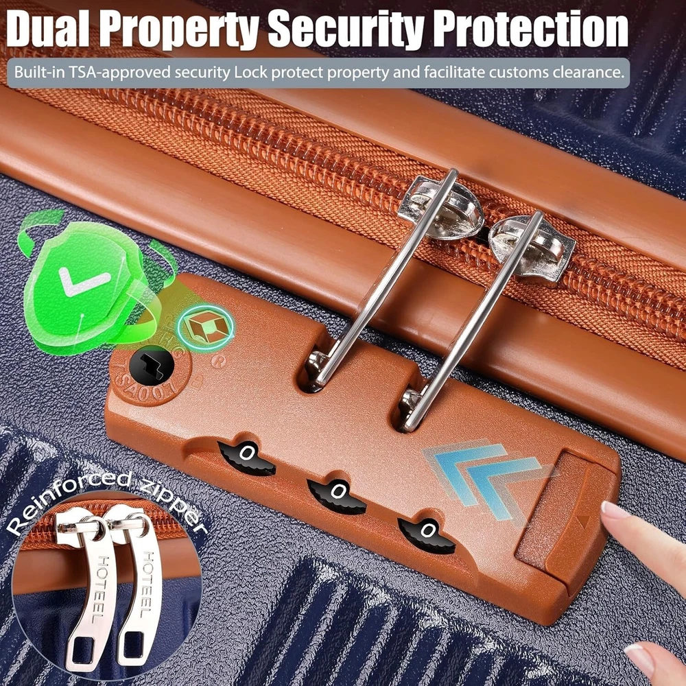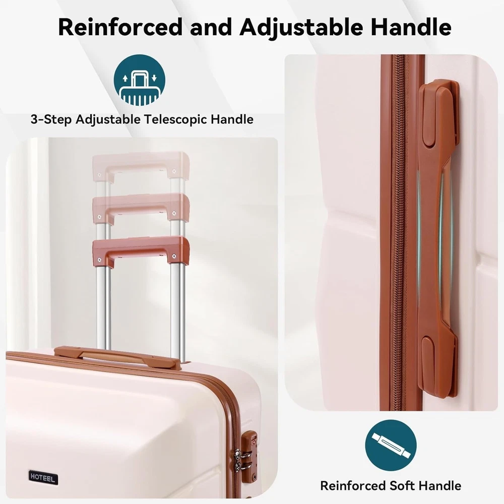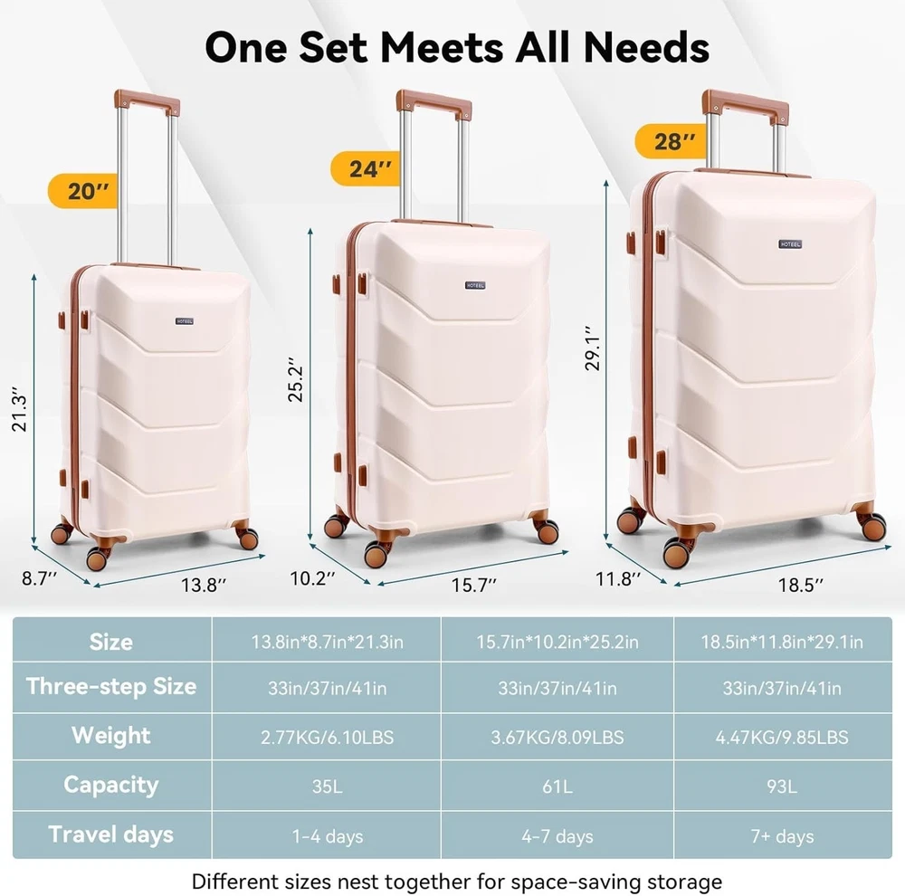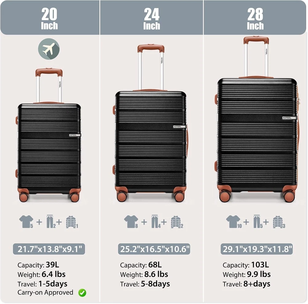 Product information Durable & Lightweight: 3-piece luggage set features thickened ABS material, perfectly balancing durability and lightweight. Reinforced hardshell ensures superior impact protection, while scratch-resistant texture maintains appearance through countless trips. Luggage available in three sizes (20"/24"/28") for all your travel needs. Wet & Dry Separation: Luggage features a book-style opening design with full zipper compartment and cross straps to effectively prevent items from shifting. Contains waterproof storage pockets and mesh pockets for wet and dry separation, making it easy to organize clothes, accessories and travel essentials. 3-Stage Handle & Hook Feet: Luggage set is equipped with an adjustable and durable ergonomic handle that is corrosion-resistant and rust-resistant, and retracts smoothly without shaking. Luggage top and side handles are thickly padded for a comfortable lifting and carrying experience. Suitcase set hook-style feet on the side of the suitcase protect the case, provide stable support, and can also hang accessories. Smooth & Silent Mobility: Luggage set is equipped with durable 360° silent spinner wheels, which can achieve smooth, stable and easy movement on any surface. Suitcases with wheels upright rolling design eliminates arm strain, making it perfect for business trips and extended travel. TSA Lock & Security Zippers: Luggage equipped with TSA-approved 3-digit combination lock ensures your belongings are secure while allowing TSA agents to inspect when necessary without damaging the lock. Luggage sets high-quality explosion-proof zippers provide lasting security and complete protection for your valuables, giving you peace of mind throughout your journey.