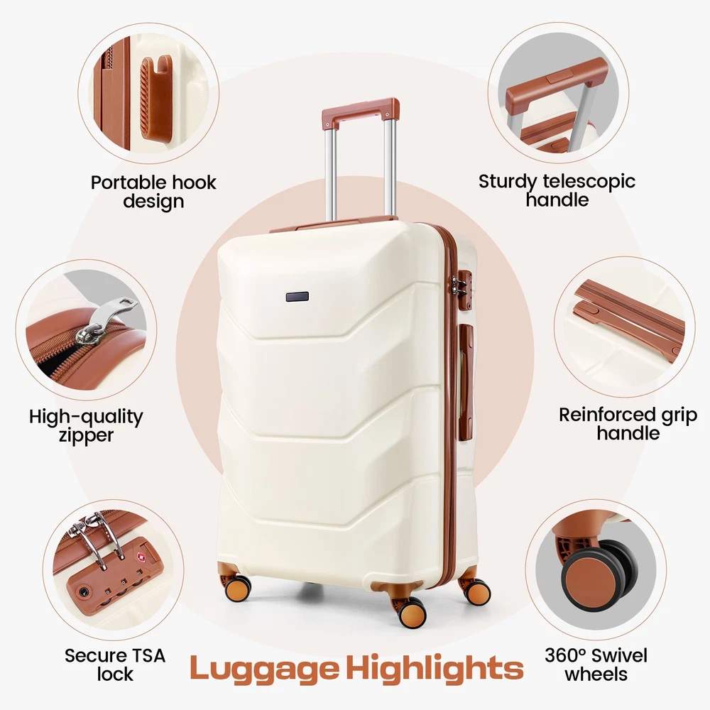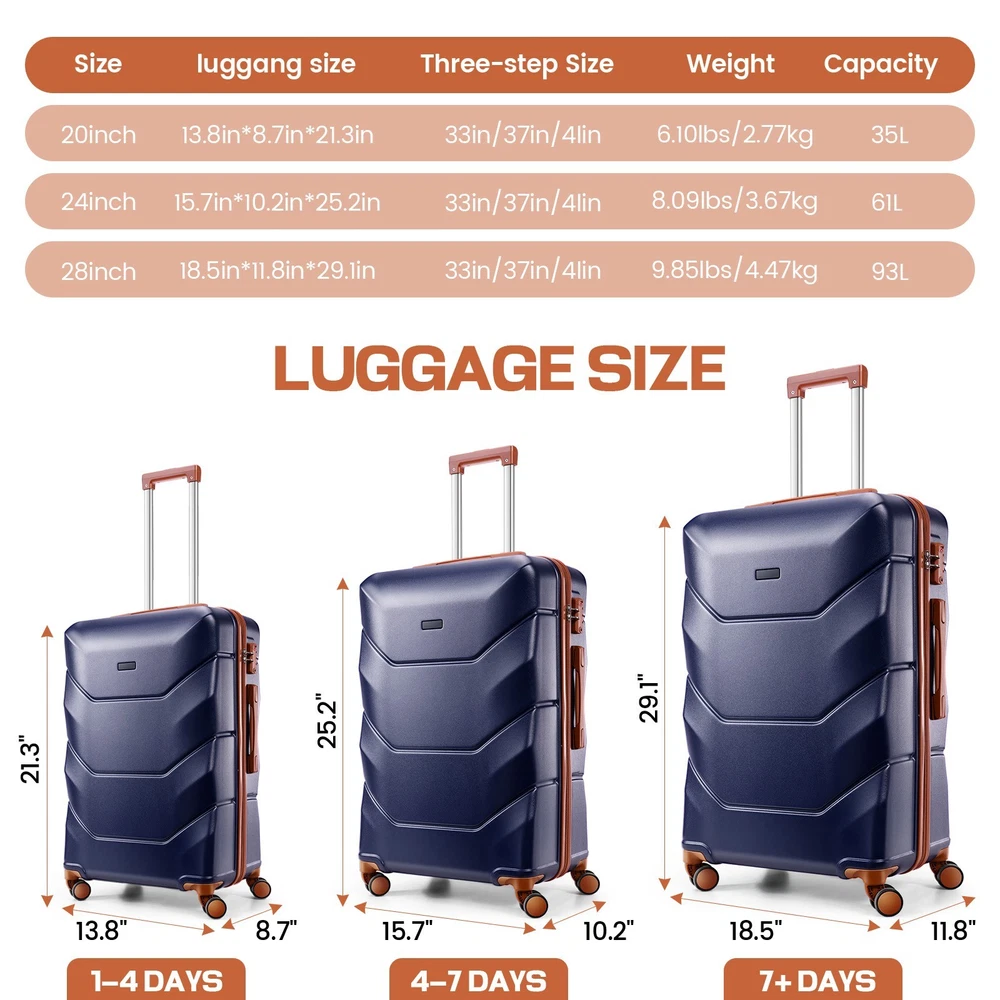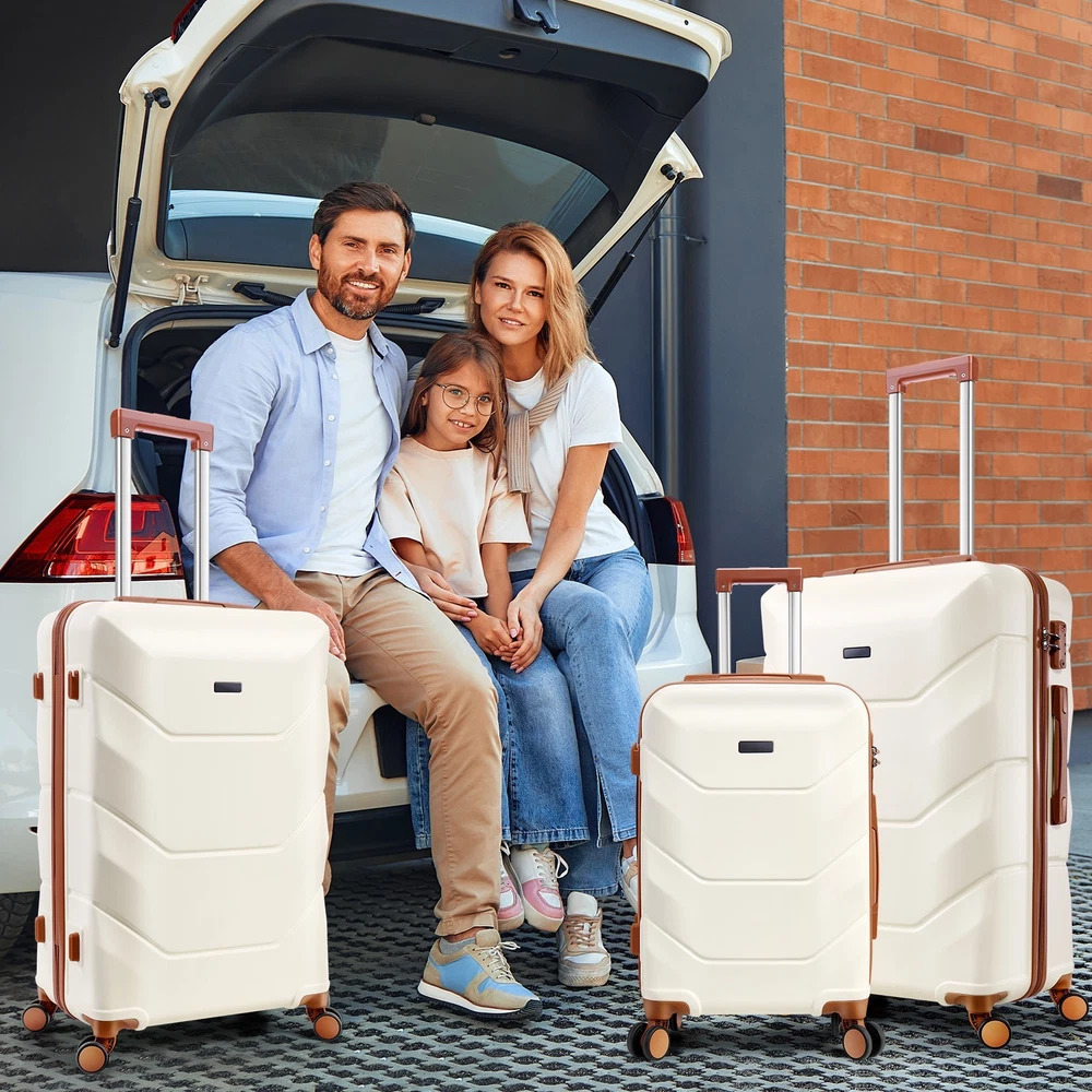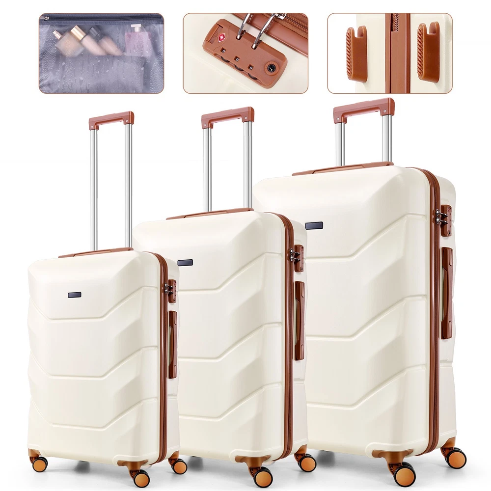 Description 3-Piece Luggage Set with Spinner Wheels, Durable Carry On Suitcase Luggage with TSA Lock, Portable Lightweight ABS Luggages for Travel 🧳Key Features: Advanced Security & Organization -TSA-approved combination locks on all luggage sets -Wet&dry separation compartment design -Multiple organizational pockets - Heavy-duty reinforced zippers Superior Durability -High-quality ABS suitcase material -Modern Refined Textured design -Impact-resistant exterior -Lightweight yet highly durable Premium Mobility Features - 8 shock-absorbing spinner wheels -360° multi-directional rotation -Smooth-gliding carry on suitcase wheel system -Enhanced luggage stability and control Ergonomic Design -3-step adjustable suitcase telescopic handle -Soft rubber comfort and finger protection handle -Space-saving handle system Full-Size Luggage Collection -Premium set includes: 20" carry-on, 24" medium, 28" large luggage -Perfect for family travel or extended trips 🧳 Luggage Sets 3 Piece Details: Size: 20/24/28 inch Pattern: Smooth Textured/ Refined Textured Luggage Sets Color: Black/White/Dark Blue/Beige Luggage Sets suit for: Unisex Design for Modern Travelers 3 Adjustable Carry on Luggage Handle Heights: 33in/37in/41in Weight: 10lb Capacity: 35L/61L/93L Suitcase with Wheels: 360° Rotatable Silent Spinner Wheels Telescopic Handle Material: Aluminum 🧳Luggage Sets TSA Approved Lock Instruction: Step 1: Set dials to 0-0-0; Step 2: Press reset button until "click"; Step 3: Turn dials to set new password; Step 4: Push button in arrow direction until "click". 🧳Luggage Sets Size/Weight: 20'': 13.8''L*8.7''W*21.3''H / 6.10lb 24'': 15.7''L*10.2''W*25.2''H / 8.09lb 28'': 18.5''L*11.8''W''*29.1''H / 9.85lb 🧳Luggage Sets Q&A : Q1: How do the 360-degree spinner wheels perform on rough surfaces? A1: The 8 shock-absorbing wheels provide smooth, quiet rolling on various surfaces - from airport terminals to cobblestones, making your travel experience hassle-free. Q2: Can this hardside luggage sets nest for storage? A2: Yes, these expandable suitcases are designed to nest - the carry-on fits inside the medium, which fits inside the large checked bag, saving significant storage space. Q3: Is the telescoping handle system sturdy for both tall and short travelers? A3: Yes, with three adjustable heights and an ergonomic aluminum design, the handle system accommodates different heights while remaining durable for long-term use. Q4: How durable is this hardshell luggage for international travel? A4: Constructed with 100% premium ABS material, reinforced zippers, and TSA locks, this durable luggage set withstands frequent travel while maintaining its lightweight characteristics. Payment 1 . We accept PayPal only. 2 . Payment should be completed within 4 (Four) days of auction closing. Or unpaid dispute will be filed for closing auction. 3 . Sales Tax of 9% will be applied for orders shipped within the state of California 4 . We will leave a positive feedback immediately after payment is received. We appreciate a positive feedback as much as you do. If for some reason there is any issue with the purchase, please contact us prior to leaving feedback, and we will be glad to work with you to have it resolved. Shipping 1 . We Ship to United States ONLY. 2 . Ship from two warehouses and only to eBay ADDRESS. Package handling only takes 1 business day at our warehouse, so please make sure entering correct payment and shipping information before checking out. Once your payment is completed, pls leave ebay note if the changes are needed before we send the product. 3 . Truck company: 3-8 business days. | USPS: 2-6 business days. | UPS/FEDEX: 3-5 business days. 4 . Lccal pick up is available. Warranty and Guarantee 1 . All of our items come with a 30-day return policy. We ensure all our items are new and in excellent condition prior to shipping. In the event that you receive the item that is not to the standards above, please contact us via e-Bay messages. All returns must be in new original condition as received and should be shipped with delivery confirmation 2 . We ONLY accept the return for original package. Please make sure that item has NO man-made sabotage. Used items will not be accepted for return. 3 . We reserve the right to refuse any returns for objective reasons. 4 . All NON-seller mistake returns for refund are subject to 20% re-stocking fee and buyer should pay for the round-trip shipping fee. (E.g. you bought wrong model or wrong color). Feadback 1 .Any problem after receiving our goods,please contact us before leaving Neutral/Negative feedback.We promise to help you solve it asap,and make you feel satisfactory absolutely. 2 . Please DO NOT leave negative feedback without asking for help. Please do not leave negative or neutral feedback if you haven't received item in 30 days, because we have mentioned the shipping time repeatedly.