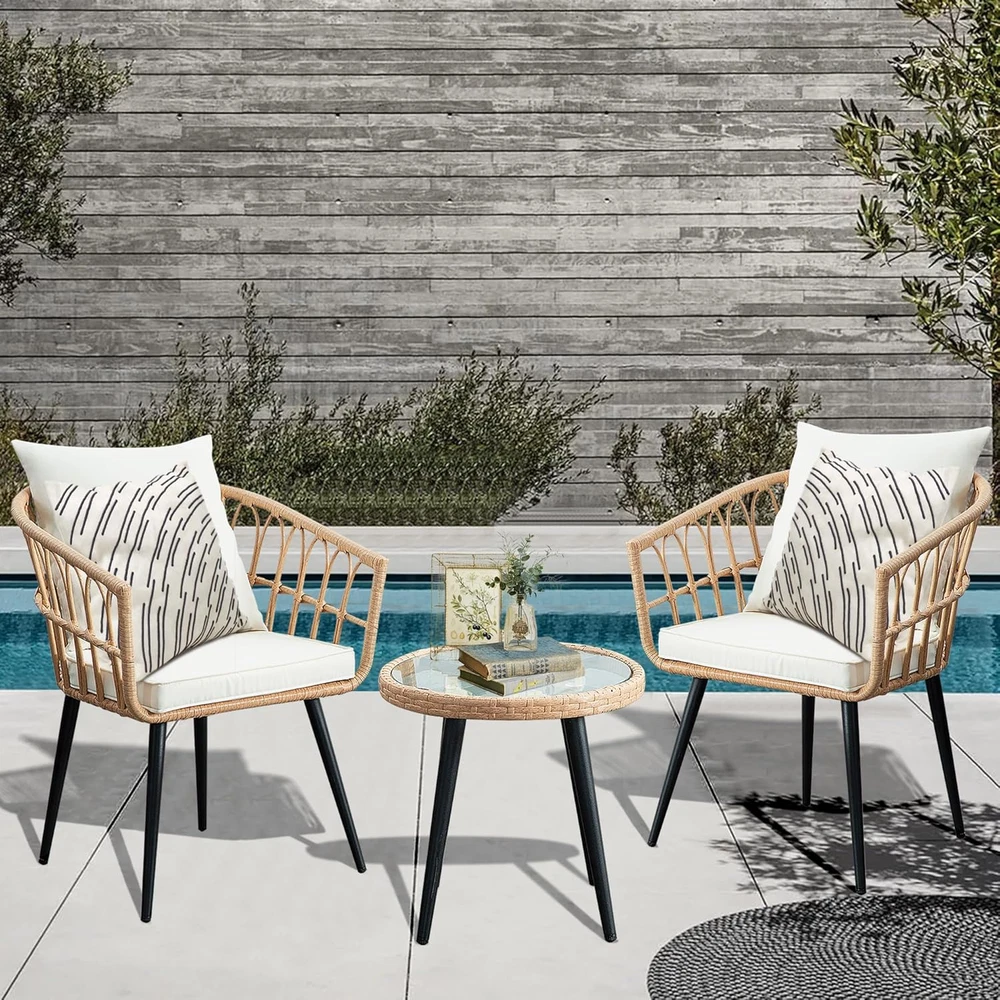 3 Piece Patio Bistro Set, Outdoor Wicker Apartment Balcony Furniture Sets, Ratta