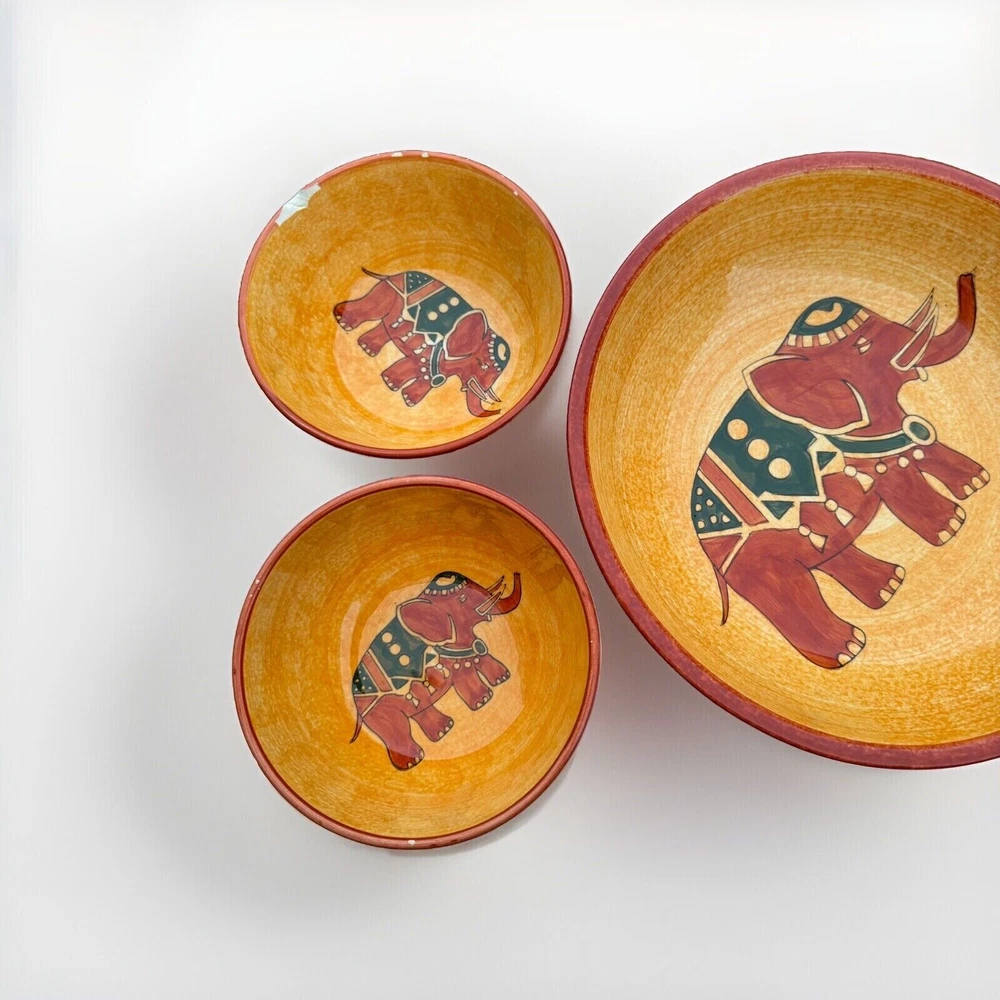 This 3-piece Pier 1 serving bowl set features an elephant theme and includes a pasta bowl and individual bowls. Made of ceramic, the serving bowl is 11.25" wide and 2-5/8" tall, while the individual bowls are 5-7/8" wide and 2.75" tall. The pasta bowl is 2.25" deep, and the individual bowls are 2.5" deep. The set weighs 5 lbs 9 oz and should be hand washed. Shipped with USPS Ground Advantage.