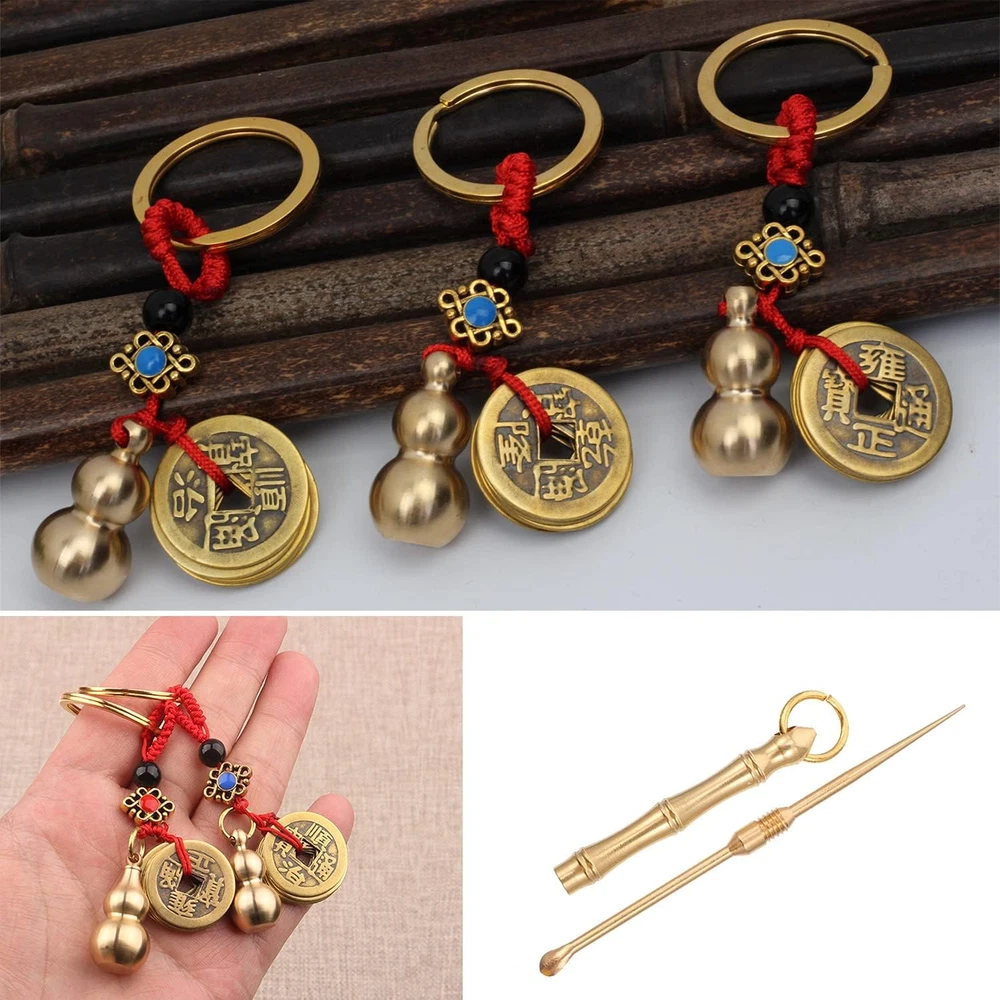 Material: The Gourd, Ancient Chinese Coins and Key Ring are made of brass,very durable and sturdy to use; Light in weight and portable to carry or store Size: The size of Wu Lou is 1.78 x 0.82 inch; The diameter of Ancient Coin is 0.9" and Keyring is 1", totall length is approx.4.2" Unique and Exquisite Design: Designed with brass gourd pendent, copper coins, black bead.The inside of each gourd is hollow and can be screwed off from the bottom and there is a Shurangama mantra (Blessing paper) in it Symbol of Good Fortune:This keychain is composed of a gourd and 5 different ancient Chinese coins.Gourd / Calabash / Wu Lou is the mascot of the "life giver" in Asian traditional culture, it means wealth and good luck Comes with 5 Different Ancient Chinese Coins:Imitation Ching-Dynasty-style coins, each with the clear name of one emperor,such as Shunzhi, Kangxi, Qianlong, Yongzheng and Jiaqing; people wear them and believe they can attract good luck and enhance positive Chi for health and wealth Widely Applications: You can hang it in your car, office, home to help you attract wealth, prosperity, success and all good things; Also can be used as a perfect blessing gift for your family, honey, children and friends as party favors, gift bag fillers and etc Package Included: 3 pieces brass gourd key chains with key rings; 1 pcs Brass Ear Spoon Keychain with small key ring This keychain is composed of a gourd and 5 different ancient Chinese coins.Gourd / Calabash / Wu Lou is the mascot of the "life giver" in Asian traditional culture, it means wealth and good luck. The Wu Lou (Calabash) in its original form is a vegetable and when dried was traditionally used to store wine or water which is how it got its name “giver of life”. The inside of each gourd is hollow and can be screwed off from the bottom and there is a Shurangama mantra (Blessing paper) in it.You can also DIY your own blessing card and put it in the Wu Lou. Specifications: Material: Brass Size: - The size of Wu Lou is 1.78 x 0.82 inch; The diameter of Ancient Coin is 0.9" and Keyring is 1",totall length is approx.4.2"; - Ear Spoon Keychain is 3 x 0.2 inch Weight: Wu Lou Key chain: 0.9 Ounce / 25g each; Ear Spoon Key chain: 0.2 Ounce / 5g; Package Weight: 2.9 Ounces / 84g. Color & Style: as pictures shown Package Included: 3 x Brass Wu Lou Keychains; 1x Brass Ear Spoon Keychain with toothpick Note: Please allow slight errors in size due to manual measurement.