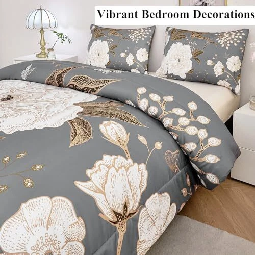3 Pieces Floral Print Bedding Set Queen White Flowers Queen(3Pcs) Dark Grey