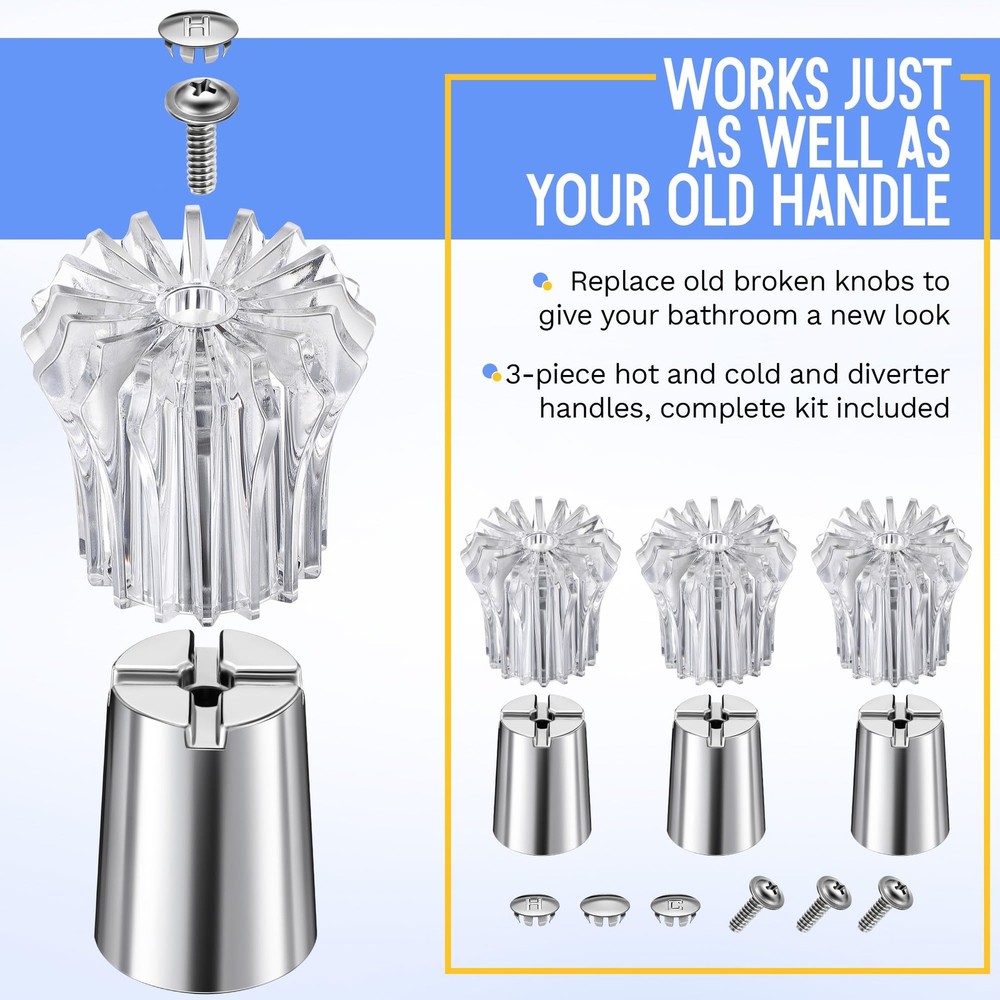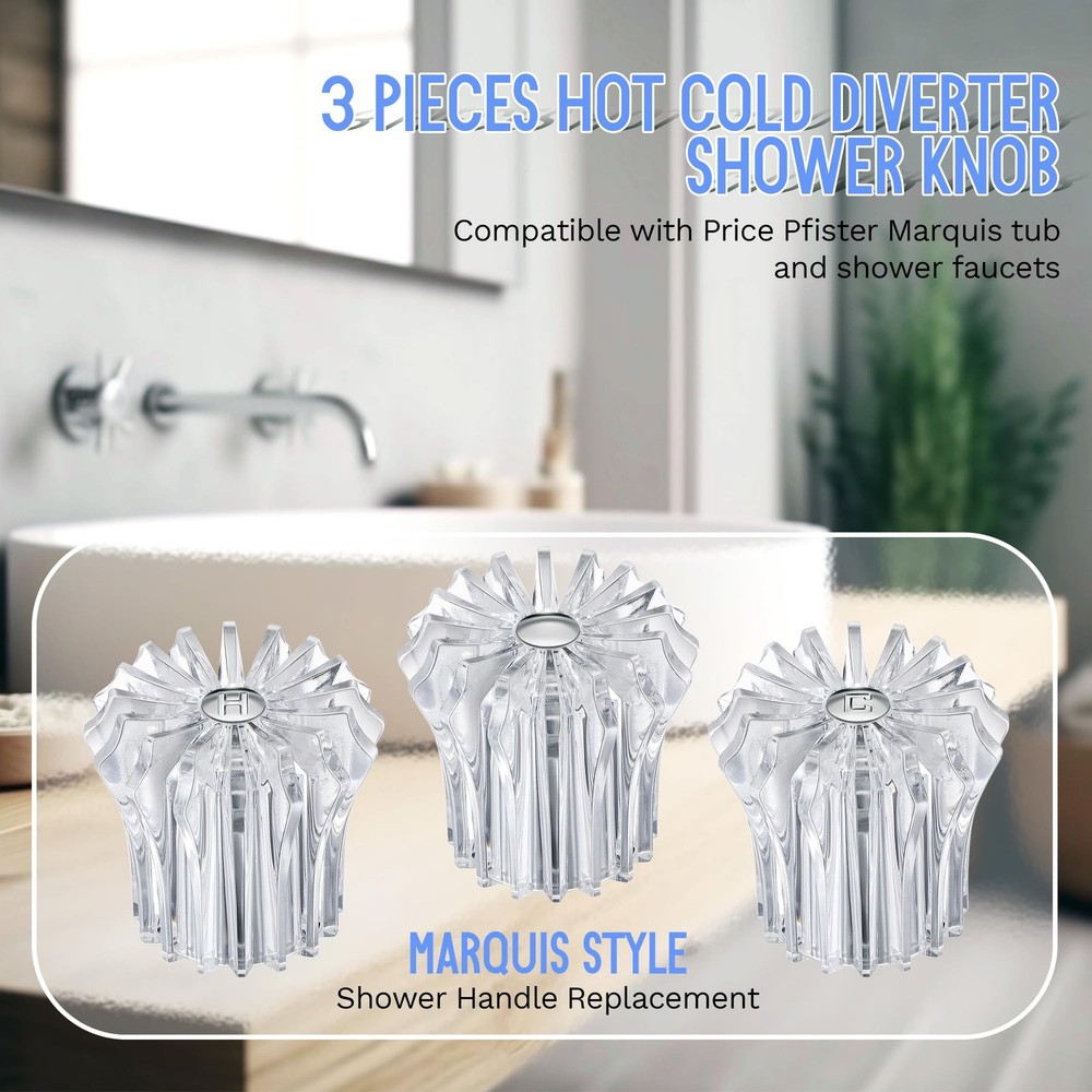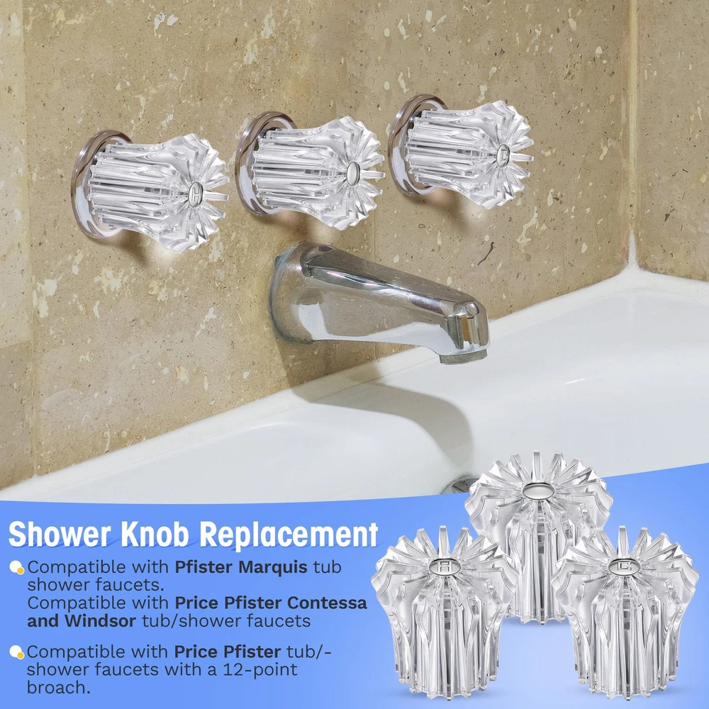 3 Piece Hot Cold and Diverter Shower Faucet Handle Replacement Compatible with Price/Pfister Marquis Tub and Shower Faucets  . Specifications: Color: clear Materials: acrylic Style: vintage Shape: round Handle Type: ‎Shower knob  . Features: Update your bathroom tub and shower faucet handle with this clear acrylic shower faucet handle replacement that complements your tub and shower decor. Replacing your leaky, worn shower knobs helps to restore the faucet to fresh new condition. The shower handle replacement can be installed in minutes using the included screws and index buttons. Compatible with Pfister Marquis tub shower faucets.  . Package includes: 1x Hot side shower faucet handle 1x Cold side shower faucet handle 1x Diverter shower faucet handle 3x Chrome index button and handle screw  . Note: Please check stem and old handle dimensions before ordering, the tip of the stem should have a 12 point broach for proper fit to the handle. Faucet Knob Replacement: the shower faucet handle replacement is compatible with Price Pfister Marquis tub and shower faucets; Please check stem and old handle dimensions before ordering, the tip of the stem should have a 12 point broach for proper fit to the handle Complement Your Bathroom Decor: featuring a clear acrylic finish and a vintage, elegant design, the shower knob replacement can easily match most type of bathroom design and give your bathroom a fresh new look Works Just As Well As Your Old Handle: the round ribbed shaped design makes these hot and cold shower faucet handle replacements easy to grip and rotate Long Lasting Performance: made of quality acrylic material that prevents corrosion and rust, the shower handle replacement can withstand hot and cold water temperatures for longer life and easier use Easy to Install: this 3 piece set of hot, cold and diverter shower handle replacements comes with index buttons and screws for easy installation