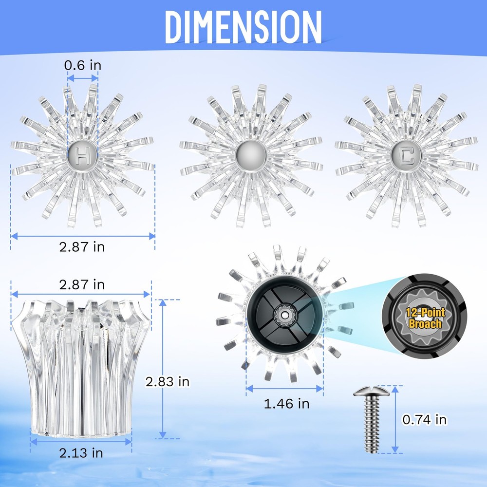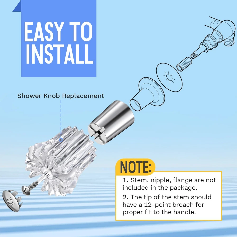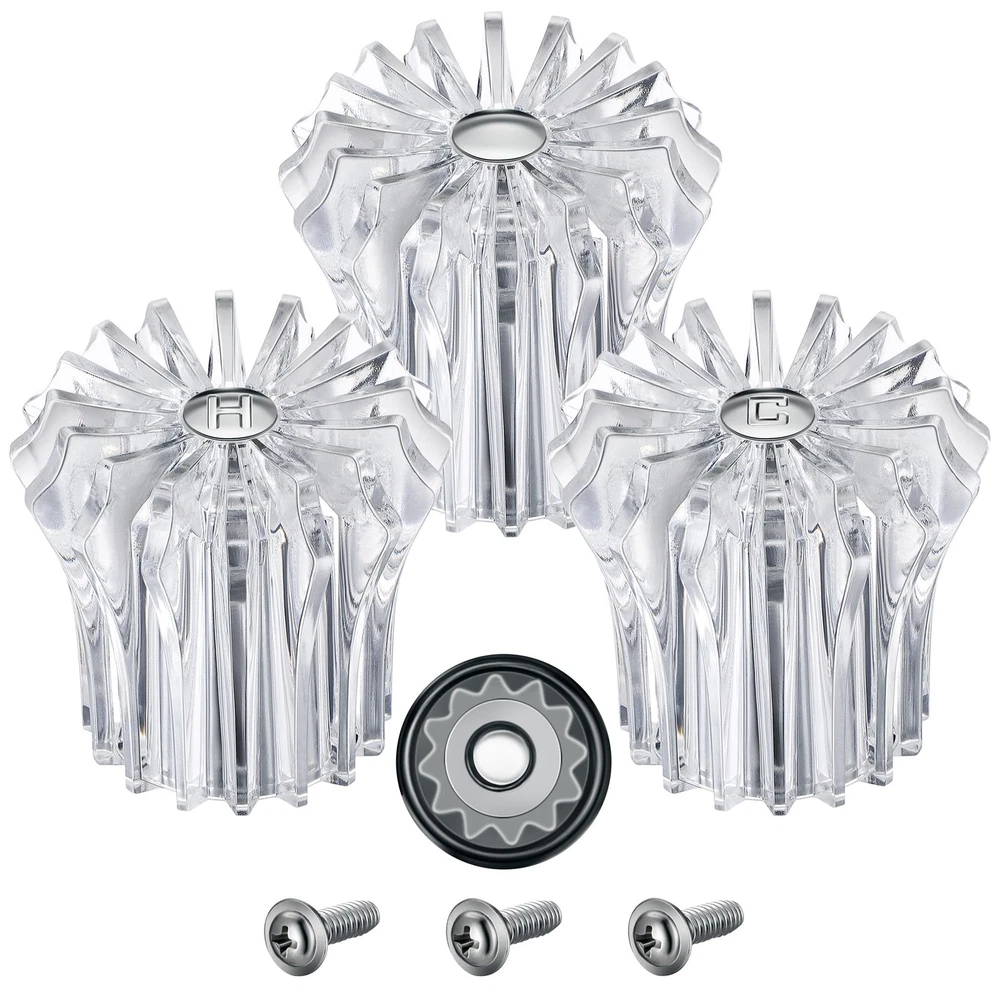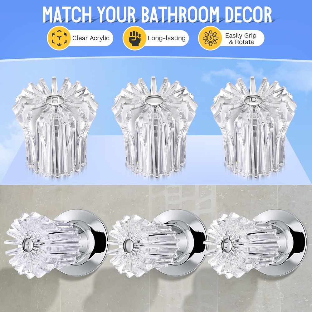 3 Piece Hot Cold and Diverter Shower Faucet Handle Replacement Compatible with Price/Pfister Marquis Tub and Shower Faucets  . Specifications: Color: clear Materials: acrylic Style: vintage Shape: round Handle Type: ‎Shower knob  . Features: Update your bathroom tub and shower faucet handle with this clear acrylic shower faucet handle replacement that complements your tub and shower decor. Replacing your leaky, worn shower knobs helps to restore the faucet to fresh new condition. The shower handle replacement can be installed in minutes using the included screws and index buttons. Compatible with Pfister Marquis tub shower faucets.  . Package includes: 1x Hot side shower faucet handle 1x Cold side shower faucet handle 1x Diverter shower faucet handle 3x Chrome index button and handle screw  . Note: Please check stem and old handle dimensions before ordering, the tip of the stem should have a 12 point broach for proper fit to the handle. Faucet Knob Replacement: the shower faucet handle replacement is compatible with Price Pfister Marquis tub and shower faucets; Please check stem and old handle dimensions before ordering, the tip of the stem should have a 12 point broach for proper fit to the handle Complement Your Bathroom Decor: featuring a clear acrylic finish and a vintage, elegant design, the shower knob replacement can easily match most type of bathroom design and give your bathroom a fresh new look Works Just As Well As Your Old Handle: the round ribbed shaped design makes these hot and cold shower faucet handle replacements easy to grip and rotate Long Lasting Performance: made of quality acrylic material that prevents corrosion and rust, the shower handle replacement can withstand hot and cold water temperatures for longer life and easier use Easy to Install: this 3 piece set of hot, cold and diverter shower handle replacements comes with index buttons and screws for easy installation