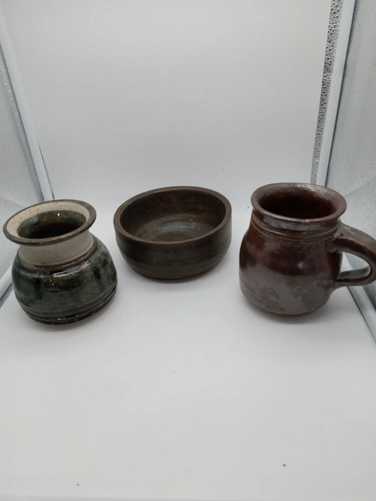 3 original pieces hand thrown studio art pottery. Bowl and cup signed HL and vase is signed PG13. All are unknown artists as far as I can tell probably from Kansas. Bowl signed HL 2.5 inch's tall 6 inch's wide Vase signed PG13 4.25 inch's tall 3.5 inch mouth 4.5 inch's wide Cup signed HL 5 inch's tall 3.25 inch mouth 3.25 inch's wide Cup is heaiver than the other two pieces. All pieces are nicely made and glazed.