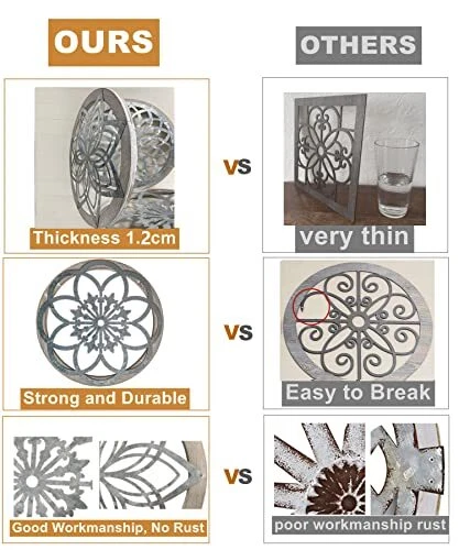 30 Days Return Policy Fast Delivery Trusted seller 3 Pieces Thicken Farmhouse Wall Decor Rustic Wood Round Wall Art Hanging Decoration for Living Room Bedroom Home Indoor Outdoor Office Apartment Size 11.8 * 11.8in Product Description ✅【Farmhouse Wall Decor】: You will receive 3 farmhouse wall decor, beautifully shaped and made into 3 different unique patterns by intricate and intricate 3D hollow carving techniques, suitable for the decorative needs of any space. Total dimensions including iron and wood framing: 11.6 inch in diameter, the same size for all three farmhouse wall decor. ✅【High Quality Material, Durable and Rustproof】: These farmhouse wall decor are made of light wood on the outer ring and iron on the inner ring, wear-resistant, anti-rust, anti-corrosion, light and beautiful, odorless and smooth, non-fading, non-breaking , It can be reused for a long time, the engraved pattern is clear, and it can be decorated indoors and outdoors. ✅【Quality Assurance】:We treat every decoration with great care. The traditional and exquisite cutting process ensures that every piece of iron is of high quality, no rust, no fading, and no scratches on your hands. Quality is supreme, and the thickness of the decoration is 1.5cm/ 0.6inch, safe and sturdy, not easy to break, bring long-lasting decoration to your home. ✅【Easy to Install, DIY Interests】: The back of the rustic wall decor has zigzag hooks, equipped with four non-marking nails, easy to install and hang on the wall, hang or take off without damaging and scratching the place w you need to decorate, it can also be convenient at any time We clean. Our rustic wall decor can be combined or separated in any way, and additional decorations can be added to give full play to your imagination and create more possibilities ✅【Wide Applications】: Farmhouse home decor adds some unique rustic and modern artistic sense to your house decoration, suitable for decorating living room, bedroom, garden, office, fireplace, bathroom, kitchen, entrance, stairs, etc., bringing A beautiful landscape to your space. Can also be used for theme parties, shop windows, hotels, beach restaurants or bars. ✅【Excellent Gift】: Rustic wall decor are perfect for sharing with your friends, family, lovers, neighbors at Christmas, housewarming, weddings, anniversaries, birthday parties, thanksgiving parties and other holiday celebrations, they will Love this wonderful gift. Shipping Returns Payment Shipping Shipping is FREE to all addresses other than APO/PO boxes in the lower 48 states. All our stock ships from US-based warehouses. Shipped via USPS or UPS (depending on location and package weight) Unless stated otherwise, all orders will ship within 24-72 hours of your payment being processed. Check our feedback to see the great reviews of FAST shipping we offer. Returns As our valued customer, we will do our best to make sure the product you receive arrives to you on time and as expected. If you are not satisfied with your purchase, please contact us within 30 days of receiving your order to process a return. Payment We currently accept payment via eBay managed payments only. Once payment is cleared, we will dispatch your shipment within 1-3 business days. Please refer to the "Shipping" tab for more information regarding shipping speed to your destination.