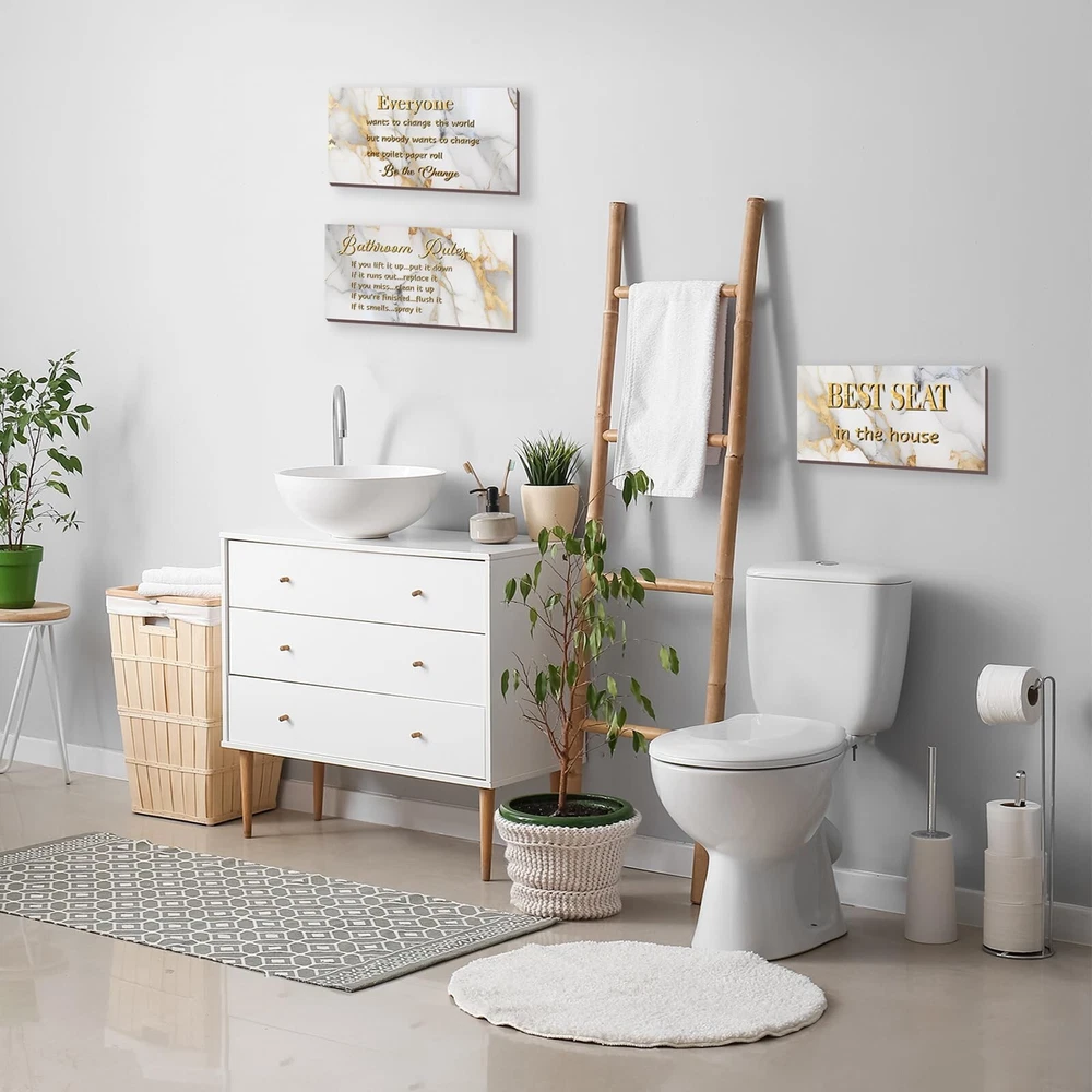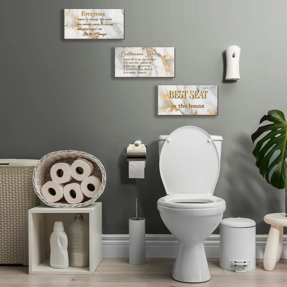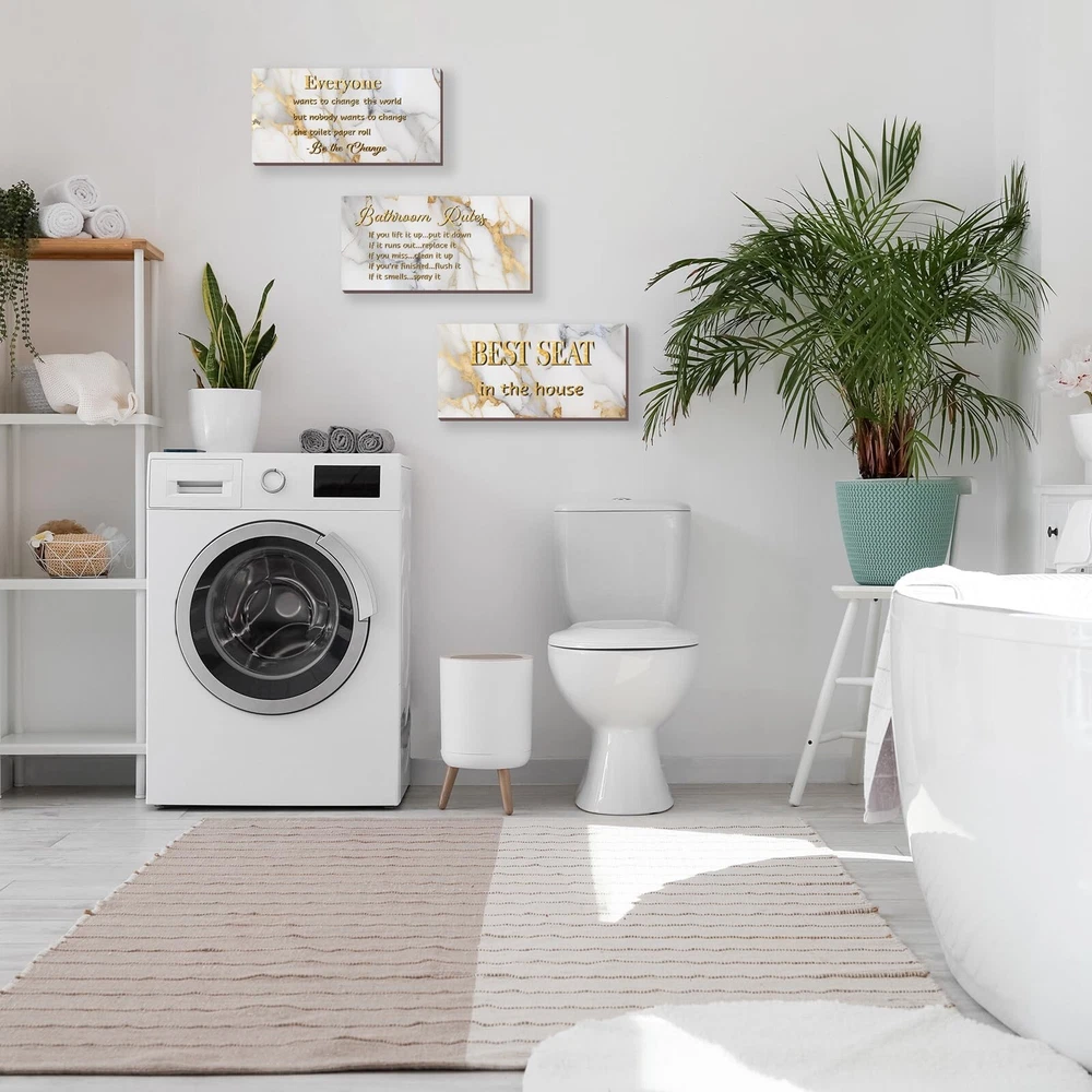 3 Pieces White Gold Bathroom Decor Bathroom Rules Wall Art White Gold Bathroom Rules Best Seat in The House Rustic Farmhouse Wooden Sign for Bathroom Toilet Wall Decor (White Gold 10x5) Product Details Color: White Gold Brand: DONFENTHY MPN: DON0012WHITE GOLD UPC: Does not apply EAN: Does not apply Color: White Gold Brand: DONFENTHY Material: Wood Theme: Flower Recommended Uses For Product: Bathroom decor and enhancement Mounting Type: Wall Mount Product Dimensions: 10"L x 5"W Shape: Rectangular Style: Rustic Item Weight: 8.8 ounces Elevate Your Bathroom Decor with a Set of 3: A trio of charming white gold bathroom rule wall decor pieces, each adorned with a captivating white gold flower background and a delightful phrase, like "Best Seat in the House." Suitable for a cohesive and stylish bathroom upgrade. Ideal Dimensions for Bathroom Elegance: Crafted at an ideal size of 10 x 5 inches, our white gold bathroom rule signs strike the right balance between visibility and subtlety. Hang them effortlessly on your toilet wall, creating a focal point that adds a touch of sophistication to your space. Quality Craftsmanship for Lasting Appeal: Meticulously crafted from quality materials, these rustic farmhouse wooden grey bathroom rule signs boast quality that stands the test of time. The 0.2-inch thickness adds a robust feel, ensuring they remain a timeless addition to your bathroom decor. Transform Your Space with Eye-Catching Charm: Catch attention and admiration with our white gold bathroom rule wall art. The white gold marble background and interchangeable bathroom rules not only create an inviting atmosphere but also leave a lasting impression of cleanliness and warmth on your guests. Versatile Decor for Every Bathroom Theme: Tailored for the bathroom theme, these white gold wall decor pieces effortlessly blend into any washroom aesthetic. With the right quantity and ideal dimensions, they become the focal point, effortlessly tying together the elements in your bathroom for a cohesive and inviting atmosphere.