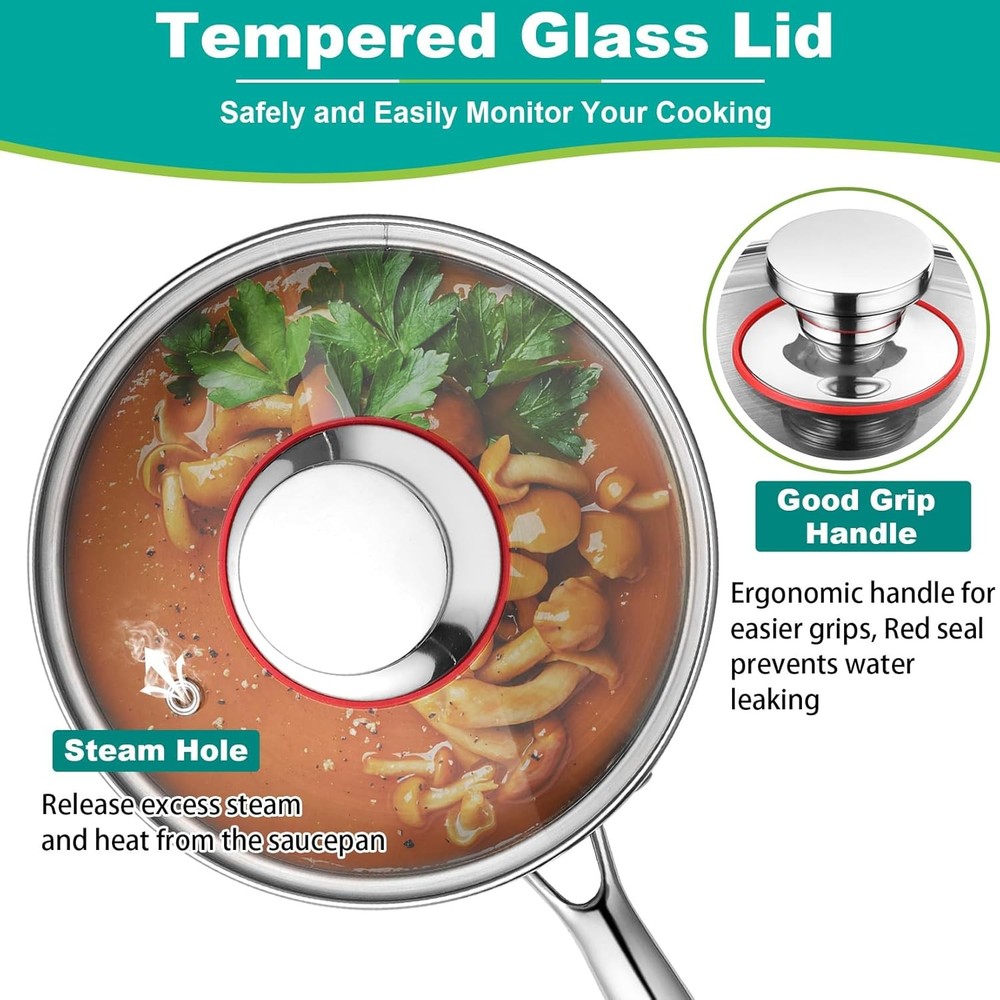About this item 【FULL 3-PLY PAN】 P&P CHEF 3qt saucepan is made of healthy 3 layered materials without toxic chemical coating, Inner 18/10 stainless steel will not react with food to alter natural tastes, Delivers fresh and flavorful results, Aluminum core for an even heating, Outer 18/0 stainless steel makes it work with induction cooktop perfectly, Feels sturdy when holding in hand, Durable use for long terms 【EXQUISITE CRAFT】Ergonomic long handle is comfortable to grasp and suitable for any size hands holding, no matter women or men, Firmly riveted to the saucepan for a safe gripping, which could bear heavy food and pot without breaking off, The big hole at the handle is designed for hanging on the hook anywhere for easy storage, Inner brush surface would reduce risks of sticking food and outer mirror surface always keep shiny and match a variety of kitchen styles 【VISIBLE GLASS LID】Tempered glass lid with steel edge is a thickened combination, which is impact and high temperature resistant for safe use, Easy to monitor the cooking process and lock the flavor and moisture of the food, A steam hole on the lid is designed for releasing excess steam and heat inside saucepan, Ergonomic knob and under red seal is easy to grip and better to prevent water leaking into between the lid and the handle 【OVEN & DISHWASHER SAFE】Full stainless steel stockpot could withstand high temperature and transfer heat evenly, Pan is oven safe up to 500℉, but please do not put the glass lid in the oven, It is perfect for baking and roasting, Both pan and lid is dishwasher safe To save your labor and time, Also easy clean by hand, Just easily soak in soapy water and then wash by soft cloth, Store in a ventilated and dry is a simple but useful maintenance 【3QT WITH MULTI USES】3 quart stock pot is efficient for home kitchen even restaurant use, Perfect to make 3 people food, like warming milk, boiling eggs, cooking noodle, pasta or soup, stewing and simmering, preparing food and reheating leftovers, Enjoy a healthier cooking and get rids of teflon, Easily work with all stoves, such as induction, gas, electric and halogen cooktops, A good gift for Housewarming, Birthday and Thanksgiving