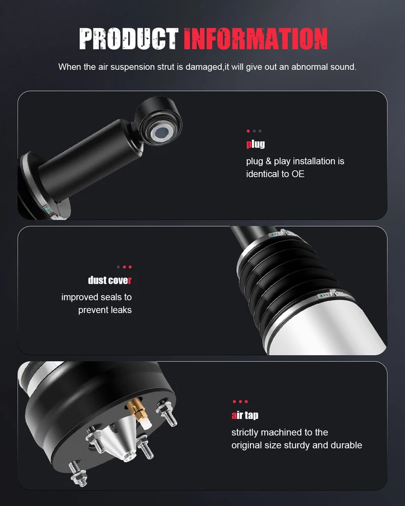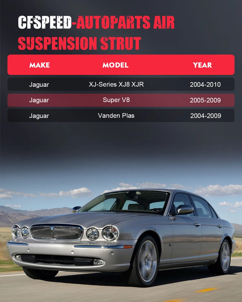 Notes: Please double confirm the compatibility as well as the OEM number before purchasing. Instruction is not included. Professional installation is recommended. *OEM Part Number: Rear Air Suspension Strut: C2C31014,C2C39765,C2C41343 Air Suspension Compressor Pump:C2C2450,C2C22825,C2C27702,C2C27702E *Item Specifications: Key Words: 3PCS Rear Air Suspension Shock Strut & Air Suspension Compressor Pump For Jaguar XJ-Series XJ8 XJR 2004-2010 Super V8 2005-2009 Vanden Plas 2004-2009 Package Includes: 2PCS Rear Left & Right Air Suspension Strut & 1PC Air Suspension Compressor Pump 3* Rear Air Suspension Shock & Compressor For Jaguar Super V8 /Vanden Plas Base Notes : Please double confirm the compatibility as well as the OEM number before purchasing. Instruction is not included. Professional installation is recommended. *OEM Part Number: Rear Air Suspension Strut: C2C31014,C2C39765,C2C41343 Air Suspension Compressor Pump: C2C2450,C2C22825,C2C27702,C2C27702E *Item Specifications: Key Words: 3 PCS Rear Air Suspension Shock Strut & Air Suspension Compressor Pump For Jaguar XJ-Series XJ8 XJR 2004-2010 Super V8 2005-2009 Vanden Plas 2004-2009 Package Includes: 2 PCS R ear Left & Right Air Suspension Strut & 1PC Air Suspension Compressor Pump *Compatibility Chart: 1, You can distinguish specific model of an automobile by VIN(Vehicle Identification Number). 2, VIN(Vehicle Identification Number) consists of total 17 English letters and arabic digits. 3, VIN does not include the letters I (i), O (o), and Q (q) (to avoid confusion with numerals 1 and 0). Jaguar Super V8 Base Sedan 4-Door 4.2L 2005-2009 Super V8 Portfolio Sedan 4-Door 4.2L 2006 Vanden Plas Base Sedan 4-Door 4.2L 2004-2009 XJ Base Sedan 4-Door 5.0L 2010 XJ L Sedan 4-Door 5.0L 2010 XJ L Supercharged Sedan 4-Door 5.0L 2010 XJ L Supersport Sedan 4-Door 5.0L 2010 XJ Supercharged Sedan 4-Door 5.0L 2010 XJ Supersport Sedan 4-Door 5.0L 2010 XJ8 Base Sedan 4-Door 4.2L 2004-2009 XJ8 L Sedan 4-Door 4.2L 2005-2009 XJR Base Sedan 4-Door 4.2L 2004-2009 * Generation & Evolution: Jaguar XJ Series XJ6 Series 1 (1968-1973) XJ6 Series 2 (1973-1979) XJ6 Series 3 (1979-1992) XJ40 (1986-1994) X300 (1994-1997) X308 (1997-2003) X350 (2003-2007) Super V8 Long-Wheelbase/Daimler Super Eight Vanden Plas XJ8-XJ Executive XJR-Sport Oriented X358 (2007-2009) Face-Lifted Version From X350 XJ8-XJ Executive XJR-Sport Oriented X351 (2009-present) *Platform Drive Layout : Front Engine-Rear Wheel Drive Layout *Installation Guideline: Tighten all nuts and bolts to manufacturer's specifications during the installation process. Do not remove the air fitting from the air strut. Doing so may cause damage and/or void warranty. Remove the white shipping pin from the new air fitting and insert the air line until fully seated. 1.Installation is in reverse order of air strut removal. Reusing factory hardware where applicable. * Frequently Asked Questions : How to prevent the damage of air springs/How to extend the service life of air springs/struts etc.? An air strut with separable air springs If your vehicle offers a separable air suspension (Audi Allroad A6 C5, Mercedes-Benz W164, BMW X5, etc.), you should regularly (about once a week) lift the car to the maximum position, and remove dirt with a high-pressure cleaner (keep the cleaner at a distance to the air spring about 30 cm/12 inches, otherwise water pressure can damage the air spring). The highest position may vary depending on your model and regulation options. Therefore, please test this by trying the different modes available to you (Sport, comfort, dynamic, off-road) and choose the one that sets your vehicle to the highest position. The dirt will most likely be found under the fold of the pneumatic chambers. If you find a frozen layer of bitumen on the piston guide (the part of a strut on which the air spring is installed), it is recommended to clean it as well. Whenever possible, avoid riding on fresh asphalt, as fresh bitumen mixed with sand immediately results in a build-up of abrasives on the piston and in turn contributes to accelerated wear and tear of the air spring. A complete air suspension shock Many cars such as Mercedes W220 or W211 are set up with a complete air strut - shock absorber and air spring visually form a complete spare part. In many cases, you can easily recognize these by the metal cups with which the air spring is tightly mounted. To best avoid any damage, we highly recommend to regularly check the condition of the dust protection seals of the air strut. What is the difference between an air spring and an air strut? The air spring is a part of the air strut. Some vehicles (e.g. Mercedes ML) allow you to change the air spring separately. At our online shop you have the opportunity to buy either the whole air strut or only the air spring. For some type of vehicles it is not possible to change the air spring separately. In this case the whole air strut should be replaced. Which side of my car is the Right and Left? The right and left sides of an automobile are determined as if sitting in the car facing forward. Thus, the left side is on the left when sitting in the car facing forward, and the right side is on the right. For American cars, the driver’s side is on the left, and the passenger sits to the right of the driver. For cars in Japan, Britain, Ireland, the Bahamas and some other former British colonies -- where they drive on the left side of the road -- the passenger sits on the left side, and the driver (along with all the driving controls) is on the right. Item Specifics Placement on Vehicle Left Right Rear Type Air Suspension Strut Fitment Type Direct Replacement Package Box Single Weight(LB) 42.108 Minimum Operating Pressure (psi) 90 Drive Layout Front Engine RWD & 4WD Platform X350 X358 Material Iron Aluminium Alloy Rubber Included Hardware None Custom Bundle Yes Quantity 3PCS Manufacturer Warranty 1 Year OE Spec or Performance/Custom OE Spec Adjustable Yes Features Sealed Superseded P