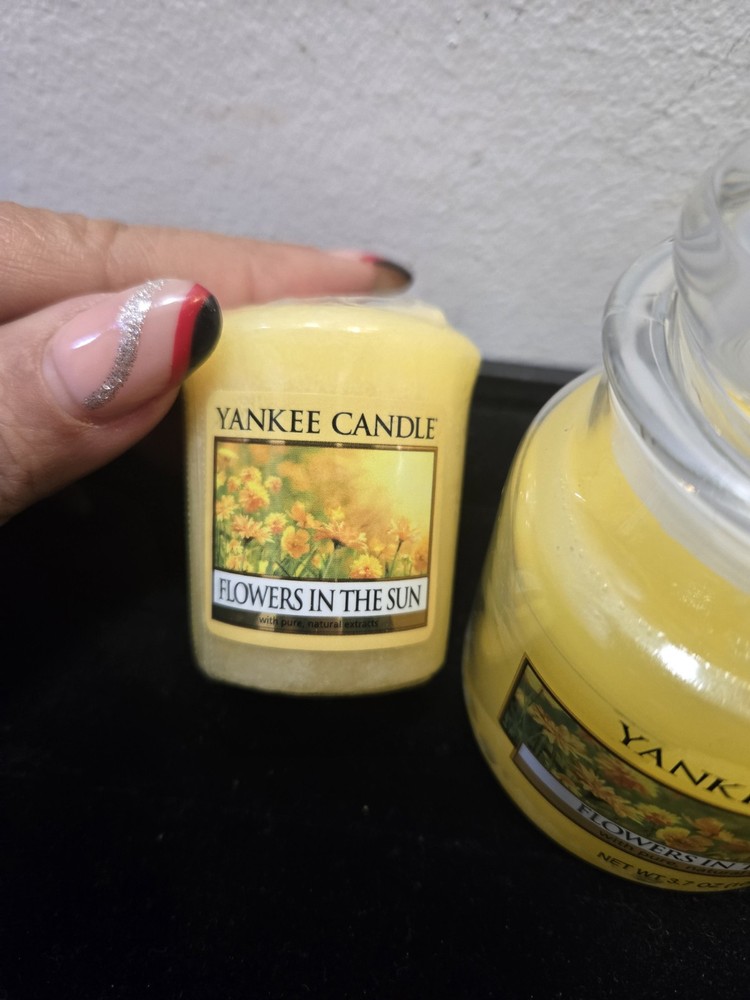 Theme:FlowersScent:Flowers In The SunHandmade:NoFeatures:ScentedCustomized:NoType:2 votives and 3.7 0z. jarPersonalize:NoCountry/Region of Manufacture:United StatesShape:FlowerBrand:Yankee CandleColor:YellowNumber in Pack:3Material:Wax