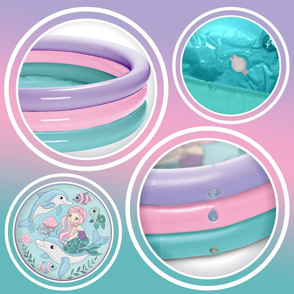 3 Ring Inflatable Pool - Kiddie Pool Floats 51" with Mermaid Design - Kids Pool Round 3 Ring Pool for Summer Outside Backyard Fun - for Children 3 Years Old and Up ✅ COOL DOWN WITHOUT LEAVING HOME - If you're looking for a colorful pool, today is your lucky day. Invest in a kiddie pool that’ll keep your children cool and entertained on hot, sticky days. It's made with lightweight and durable material resistant to punctures and safe for kids and can easily accommodate 2-3 kids at the same time. ✅ WON’T LEAK AIR - We know:) You’ve read dozens of online reviews decrying air loss in pools. Guess what? We designed this blow-up pool to tightly hold its air, which makes it perfect for those looking for a simple children’s pool that will make hanging out in your backyard so fun and unforgettable. ✅ A GREAT WAY TO CHILL OUT - When a trip to the beach isn't possible, blow up this inflatable 3 ring pool, and send the kids out for a little backyard snorkel for an instant escape. It's suitable for kids ages three and up. ✅ EASY SETUP AND FAST ASSEMBLY TIME - Unlike in-ground pools that are so time consuming and very hard to install, our inflatable swimming pool for kids can be set up in just a couple of minutes only requiring level ground and an air pump. All you have to do is inflate the three rings and fill it with water and your little ones will have a blast splashing around with the sea creatures. ✅ KIDDIE POOL WITH MERMAID PATTERN - The Mermaid 3-Ring Pool is the perfect way to cool off this summer. Designed with bright colors and attractive graphics that grab children's attention and imagination, giving them a feeling of being in the ocean. If you are looking for the perfect summer outdoor fun, you're at the right place. This 3 Ring Play Pool is a great introduction to water before they're ready to dive and a perfect way for your kiddies to cool off this summer. SAFE, DURABLE AND COMFORTABLE 3 RING POOL - What better way to cool off your child on a hot summer day than in this inflatable pool designed with Mermaid design that will keep the kids occupied for hours on a sunny day. Measuring 51 inch in diameter, this 3 ring pool works well in a variety of spaces. Best for ages 3 and up. INTRODUCE YOUR CHILD WITH SWIMMING - Kids can put the goggles on and pretend they are snorkeling and swim around in the water again and again. It is quick and easy for the owner to set up the kid's pool. Simply inflate the 3 rings and fill it with water and let your little ones be busy for hours and have the best time of their lives. DURABLE AND STRONG CONSTRUCTION - Make a fun investment for warm days in the garden with our kiddie pool. Made with BPA-free PVC material that is UV resistant and protects the pool from sun's harmful rays, which makes this backyard pool perfectly safe for your little ones. A great option because it is inflatable and can be stored away when the weather cools down. Specifications: Quick & easy to inflate Suitable for kids 3+ Easy to store and carry Triple-chamber structure Diameter: 51" Underwater pattern PACKAGE INCLUDES: 1 x Inflatable 3- Ring Pool Mermaid Design Notes: As with all kiddie pools, never leave your child unattended. Still not sure if this is the right inflatable pool you should buy for your little ones? ORDER NOW and we guarantee it will be your best investment! Assembly Required Yes Color Mermaid Special Feature Inflatable, Lightweight Material Polyvinyl Chloride (PVC) Occupancy 3 person Item Weight 2.25 pounds Shape Round Frame Material Polyvinyl Chloride (PVC) Age Range (Description) Kid Target Audience Unisex-Kids Package Dimensions 10.5 x 9.8 x 2.45 inches 9.8 inches x 10.5 inches x 2.45 inches. Weight: 2.25 lb Shipping from the USA All of our products are shipped from the USA, ensuring quick delivery to your destination. Payment We offer the following payment methods: PayPal, credit card, bank transfer, and eBay's secure payment system. Free Shipping & Free Returns Shipping within the USA is FREE. Additionally, any return is absolutely free for you. Risk-Free Purchase You have the option to return an item within 30 days without any justification. We cover the return shipping costs! Fast Shipping We ship immediately upon receipt of payment. Generally, the package is delivered within 2-3 days in the USA. If it takes longer, we will contact you. Quality and Costs Made in Europe, USA, China No customs fees or additional charges Total satisfaction guarantee Invoice with declared VAT available upon request in .pdf format Feedback Your feedback is very important to us. After you pay for your purchase, you will automatically receive positive feedback from us.