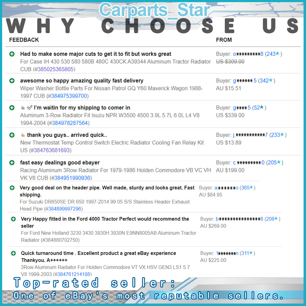 autocooling-sky STORE HOME ADD TO FAVS ABOUT US CONTACT US FEEDBACK STORE CATEGORIES Store Home Full Aluminum Radiator Aluminum Plastic Radiator Intercooler Oil Cooler Control-Arm AC CONDENSER OVERFLOW TANK Bearing-Hub Bottom-Roller ADAPTER FITTING Wheel Spacers SILICONE HOSE SIGNUP FOR NEWSLETTER Add my Store to your Favorites and receive my email newsletters about new items and special promotions! SIGN UP NOW! R E C O M M A N D A T I O N The New Thermostat Temp Control Switch Electric Radiator Cooler Fan Relay Kit US 13.99 USD Universal All Aluminum Radiator Cap Overflow Nipple Pipe Hose Fit 1/16" NPT US 4.99 USD Intercooler Pipe Boot Kit Silver For 2004-10 GMC Chevy Duramax 6.6L LLY LBZ LMM 113.00 USD 80110TR0A02 AC Condenser For 2012-2015 Honda Civic Sedan, 2013-2022 ILX Base 53.99 USD 20621 3-Rows Radiator Fit 1994-2000 95 Chevy GMC C2500 C3500 K2500 3500 7.4L V8 199.00 USD Aluminum 3 Row Core Cooling Radiator Fit 1955-1959 GMC Truck 5.2L 5.3L 5.7L 6.1L DESCRIPTION Package Include: 1 X 3-Row AA5052 Aluminum Radiator 1 X CNC Machined Radiator Cap Radiator Size: Condition:New High Performance Racing Spec. 3 -Row of tubes Core Racing Design Petock Drain:OEM style brass petcock drain Radiator Cap:CNC Machined Billet and High Pressure Radiator Cap 1.3 Bar Overall Height: 29 1/8" Overall Width: 26 1/4" Core Height: 22 5/8" Core Width: 23 7/8" Inlet Location: Center Inlet Diameter: 1 3/4" Outlet Location: Passenger Outlet Diameter: 1 3/4" Transmission Oil Cooler: Yes Please Check the Size Before You Buy! Application: Fits 1955-1959 GMC Truck 4.4L 5.2L 5.3L 5.7L 6.1L Radiator Description : Our Radiator is made of AA 5052 aircraft aluminum. Its different from other sellers T-3303 Series. In fact, AA 5052 series Aluminum is much better than T-3303 series. More than 90% of aftermarket manufacturers use the T-3303 series Aluminum, because it is cheaper and easier to get the material. However, T-3303 aluminum has many disadvantages, such as poor polishing effect, softness, easiness to scratch and corrode, poor heat dissipation effect. If the T-3303 aluminum radiator is operated in high pressure and high temperature for a long time, the leaking problem would occur very soon. AA 5052 Aluminum is an Al-Mg alloy with good corrosion resistance, excellent reliability and cold work ability and strength. The main alloying element of AA 5052 is magnesium, which has good forming and processing properties. It is widely used in the manufacture of aircraft fuel tanks, oil pipes, and sheet metal parts of transportation vehicles and ships, hardware products, and electrical-appliance casings. This AA 5052 Aluminum Radiator is designed to provide maximum cooling efficiency to prevent premature engine failure. Its light-weight, and high-heat transferring aluminum features a tube and fin design that, dramatically increases surface area that enables the heat to dissipate more efficiently. This AA 5052 Aluminum Radiator is at least 30%-45% more efficient than stock ones. Most importantly, it has a much higher capacity for coolant than stock ones, which means that your cooling system will be more efficient and will be more resistant to temperature surges in racing applications. Features: 1. Made from Aircraft AA 5052 grade aluminum for prolonged lifespan and with raw aluminum finish 2. Brazed core technology to guarantee optimum performance and dependability 3. All AA 5052 Aluminum 2mm thick tanks and fittings,Ensure it's hard and durable 4. Billet Aluminum CNC machined fill neck rugged and durable 5 . OEM style brass petcock drain much better than other plastic one on eBay 6 .Carefully crafted to exceptional OE standards for precise fit. PAYMENT SHIPPING RETURNS FEEDBACK ABOUT US PAYMENT We accept only PayPal payment All major credit cards are accepted through secure payment processor PayPal.(* If you use e-check on PayPal, delivery may take longer, as we will hold your order until your e-check clear) Payment must be received within 7 business days of auction closing. Please make sure your PayPal and eBay address is correct. If not, please correct it before payment. Thank you. Custom duties, taxes, or charges are not included in the cost you pay to us. Please check with your country's customs office to determine what these additional costs will be prior to bidding/ buying. Hot Products 3 Row Radiator Shroud Fan Fit 49-1954 Chevy Bel Air Fleetline Styleline Sedan V8 220.90 USD Aluminum Radiator 3Row For 1987-1995 Land Rover Discovery Range RO3010105 ESR V8 192.00 USD For 2005-2006 Suzuki GSXR1000 GSXR 1000 Motorcycle All Aluminum Radiator 99.00 USD Aluminum Radiator For Massey Ferguson 135 148 Tractor MF35 20 35 OEM#1660499M92 189.00 USD For 1999-2012 Chevy Silverado 1500 2500 Hummer H2 5.3L 3Row Radiator Shroud Fan 299.00 USD For Ford New Holland NAA Jubilee 500 501 600 700 800 Tractor 3-Row Radiator CUB 249.90 USD Radiator 4 Row For Case Backhoe 570 580L 580SSL 590SL 4300 P85 234876A2 234876A1 442.50 USD CUB Aluminum 4Row Radiator For Toyota LandCruiser HDJ100R Lexus LX470 1998-2007 249.90 USD Fuel Tank Filler Neck Gas For Chevrolet C1500 C2500 C & K Truck GMC 15003858 39.99 USD For 1996-2007 Freightliner Century Columbia FL112 FLD112 Aluminum 3 Row Radiator 559.00 USD For 1955-1957 56 Chevrolet Bel Air Belair V8 3Row Radiator Shroud Fan Relay Kit 209.00 USD Aluminum 3Row Radiator For John Deere 3020 Tractor AR40831 AR46016 R34457 R39517 299.00 USD Aluminum 4 Rows Radiator For 2003-2007 Chevy Kodiak GMC Topkick C4500 C5500 8.1L 599.00 USD Aluminum Cooler Intercooler For 2016-2023 Seadoo RXT-X 300, RXP-X300, GTX-300 209.00 USD 4 Rows Radiator 62mm For 1981-1983 Nissan Datsun 280ZX L28E 2.8L L6 GAS AT MT 209.00 USD Aluminum Billet Racing Fuel Rail Kit For 2019-ON Polaris RZR Pro XP Turbo S 4 119.00 USD SHIPPING We Ship to Worldwide, except China (Hong Kong), and we do not ship to APO/FPO. Orders processed within 12-24 hours of payment verification.( On Sundayis our rest day). Before buying, Please make sure your PayP