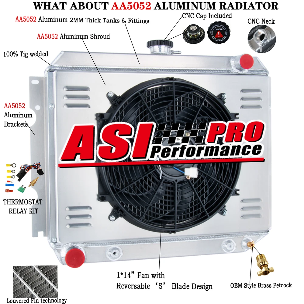 Document STORE HOME HOT ITEMS ADD TO FAVS CONTACT US FEEDBACK ABOUT US 3 Row Radiator Shroud Fan Fit 1968-1974 Dodge Plymouth Mopar Cars Big Block V8 Package Include: 1 X 3-Row AA5052 Aluminum Radiator 1 X CNC Machined Radiator Cap 1 X AA5052 Aluminum Shroud 1 X 14" Fans (Includes mounting kits) 1 X Thermostat Relay Kit Radiator Size: Brand: ASI Performance Condition:New Material:Aircraft AA5052 grade aluminum tank & core High Performance Racing Spec. 3 -Row of tubes Core Racing Design Core Size: 16 3/8''High x 22'' Wide Overall Size:21" High X 25 3/4" Wide Inlet Hose Connection: 1 1/2'' Passenger Side Outlet Hose Connection: 1 3/4'' Driver Side Transmission Oil Cooler: YES Fans Details : Volt :12v Maximum Fan CFM: 1730 cfm Fan Diameter (in): 14.050” Thickness (in): 2.500” Number of Blades: 8 S-Type blades Maximum Fan RPM: 2,250 rpm Blade Material: Plastic Amp Draw: 12.70 amps Includes the Mounting Tabs for an Easy Zip Tie Installation Thermostat Kit Installation: Universal fit for any automotive vehicle and electric fan. Activates by grounding electric fans at preset temperature. 180'F turn-on temperature, 165'F turn-off temperature. Probe typically threads into radiator, water outlet or manifold. RED + connect directly to battery. WHITE wire to ignition switch power source. BLACK goes to thermos switch. BLUE wire goes to the Fans. Vehicle Fitment 1970-1974 Dodge Challenger 5.2L 5.9L 5.6L 7.2L 6.3L 7.0L 22" Core-Big Block 1970-1974 Dodge Charger5.2L 5.9L 6.6L 7.2L 5.6L 6.3L 7.0L 22" Core-Big Block 1969-1974 Dodge Coronet 5.2L 5.9L 6.6L 7.2L 5.6L 6.3L 7.0L 22" Core-Big Block 1968-1973 Plymouth Satellite 3.7L 5.2L 5.6L 6.6L 7.2L 6.3L 4.5L 22" Core-Big Block The advantages of our radiator : Made from Aircraft AA5052 grade aluminum for prolonged lifespanand with raw aluminum finish Brazed core technology to guarantee optimum performance and dependability All AA5052 Aluminum 2mm thick tanks and fittings,Ensure it's hard and durable Billet Aluminum CNC machined fill neck rugged and durable CNC machined cap with Engraved craftsmanship, anodized treatment. OEM style brass petcock drain much better than other plastic one on eBay Carefully crafted to exceptional OE standards for precise fit. PAYMENT SHIPPING RETURNS FEEDBACK ABOUT US PAYMENT We accept only PayPal payment All major credit cards are accepted through secure payment processor PayPal.(* If you use e-check on PayPal, delivery may take longer, as we will hold your order until your e-check clear) Payment must be received within 7 business days of auction closing. Please make sure your PayPal and eBay address is correct. If not, please correct it before payment. Thank you. Custom duties, taxes, or charges are not included in the cost you pay to us. Please check with your country's customs office to determine what these additional costs will be prior to bidding/ buying. SHIPPING We Ship to Worldwide, except China (Hong Kong), and we do not ship to APO/FPO. Orders processed within 12-24 hours of payment verification.( On Sundayis our rest day). Before buying, Please make sure your PayPal and eBay address is correct. If not, please correct it before payment.if you want me send the item to another address,please send me a message. If you have not received your shipment within 40 days from payment, please contact us. We will track the shipment and get back to you as soon as possible with a reply. Our goal is customer satisfaction! Due to stock status and time differences, we will choose to ship your item from our first available warehouse for fast delivery. Many of our products have overseas warehouses, including Australian warehouses, American warehouses and British warehouses. RETURNS If you are not satisfied when you receive your item, please return it within 60 days for a replacement or money back. Please contact me before you return it. Defective items Must Be reported and returned to us within the warranty period (and in the original packaging, if possible). You must tell us what the defect is and give us your eBay ID. We act as a responsible seller; we are willing to actively undertake the following responsibilities: a. The item is lost during transit; b. The item is damaged during transport; c. Due to our work errors, transporting the wrong items to the buyer; d. The item in the actual use of the process of quality problems. FEEDBACK Very appreciated for your support. We hope you are happy with your purchase. We will leave POSITIVE FEEDBACK after receiving the payment. Please contact us if you are not satisfied with the item after receiving it. If you have any problem, please feel free to contact us via ebay message, we will reply your email within 24 hours (except weekends and holidays). We will do our best to solve your problem as soon as possible. We maintain high standards of excellence and strive for 100% customer satisfaction! Feedback is very important to us. We request that you contact us immediately. Before you give us neutral or negative Feedback, so that we can satisfactorily address your concerns. Good communication can fix all problems, we always believe that as long as you are willing to communicate with us, we will give you a satisfactory answer.Thank you for choosing us and have a great day! ABOUT US Welcome to my shop,We offer an extensive range of products selected by our professionals.superiority in details and quality is a high priority. We also have a high-standard team, qualified by authorized organizations to ensure products are of the highest quality. As an internet seller, we collaborate with excellent international transport companies, and in Australia and the United States we have our own warehouses, offering the most convenient delivery service possible. On-time shipping and reliable quality control are key areas of importance in our shop. We are increasingly expanding international markets based on high quality products, excellent service, reasonable prices and timely delivery. Please contact us at any 
