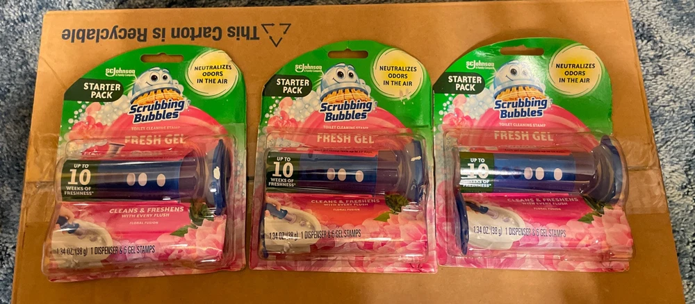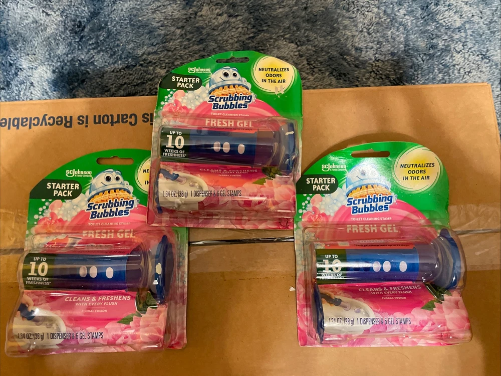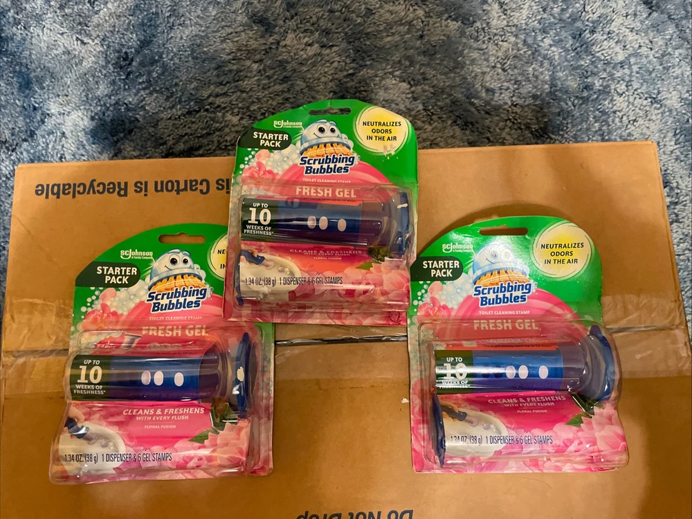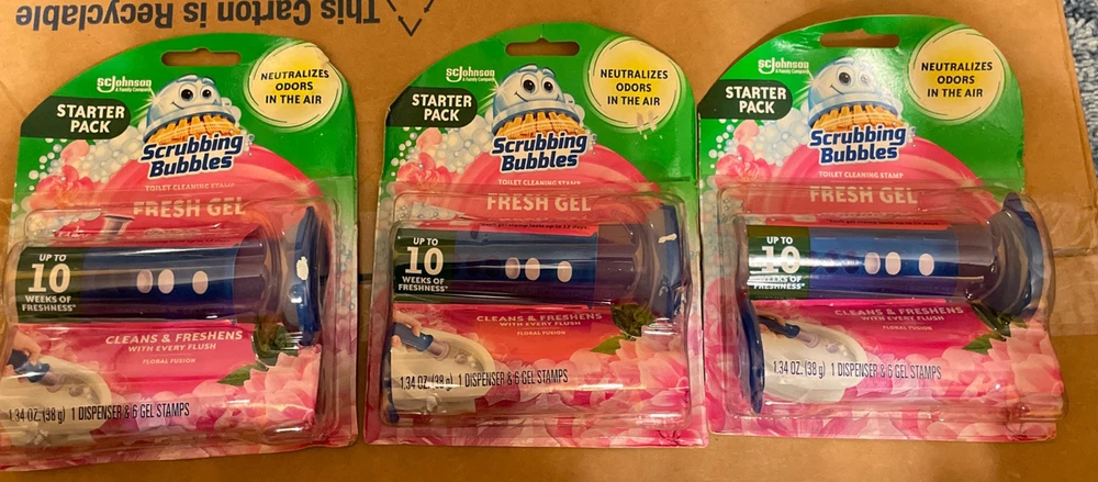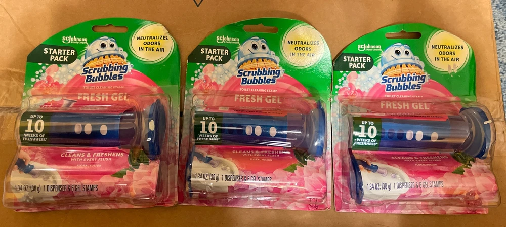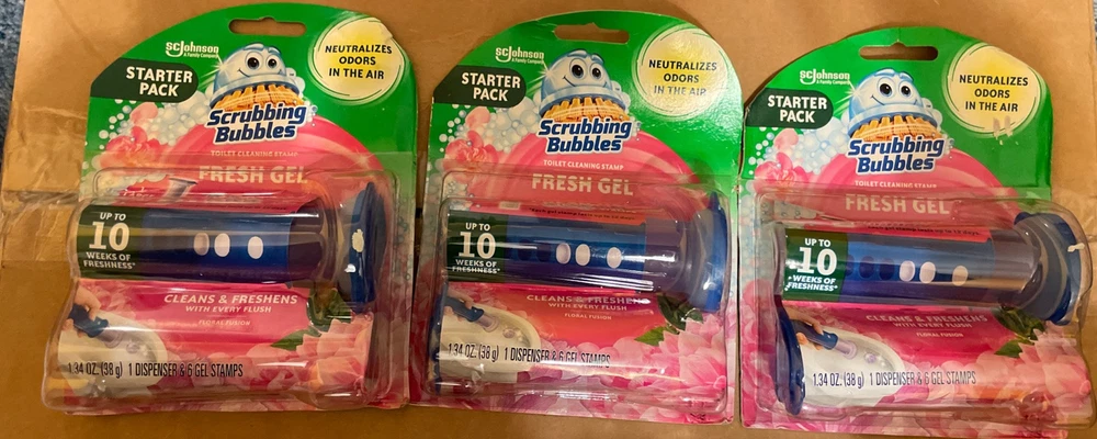 3 pack- Scrubbing Bubbles Fresh Gel Toilet Cleaning 6 Stamps Dispense FLORAL FUSION - new in packaging - starter packs - lasts up to 10 weeks of freshness - 1.34oz - 1 dispenser in each pack & 6 gel stamps in each packages as well - scrubbing bubbles - ScJohnson a family company brand - packages may have imperfections, everything is intact - best offers are welcome - fresh gel & neutralizes Oder in the air - 18 gels altogether and three dispensers in total