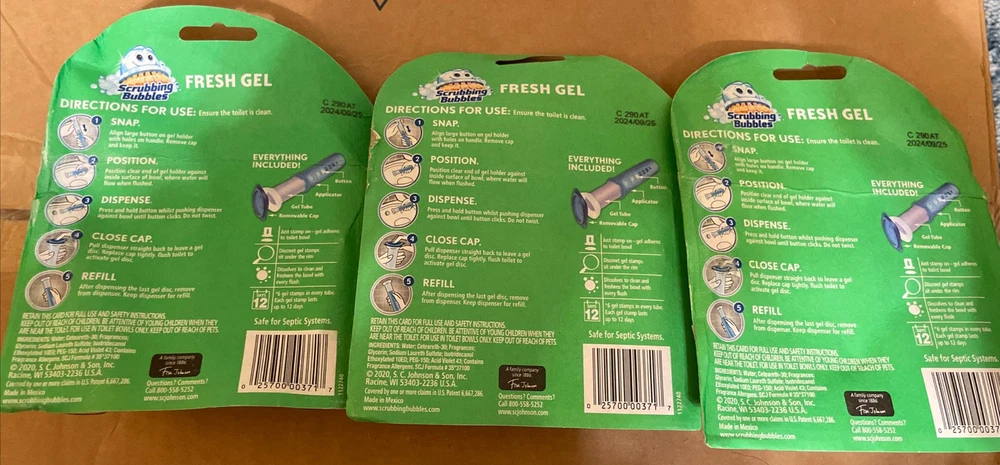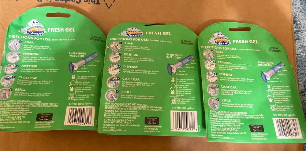 Scent: Floral Fusion Country/Region of Manufacture: United States Features: Prevent Limescale & Toilet Rings Buildup, Up to 8 Weeks of Freshness, Clean & Freshen with Every Flush, Septic Safe MPN: 1075090 gtin13: 025700003717 For: Bathroom Brand: Scrubbing Bubbles Number in Pack: 18 Stamps In Total- 3 Packs with 6 Gels In Each Pack UPC: 025700003717 Form: Gel Type: Disinfectant