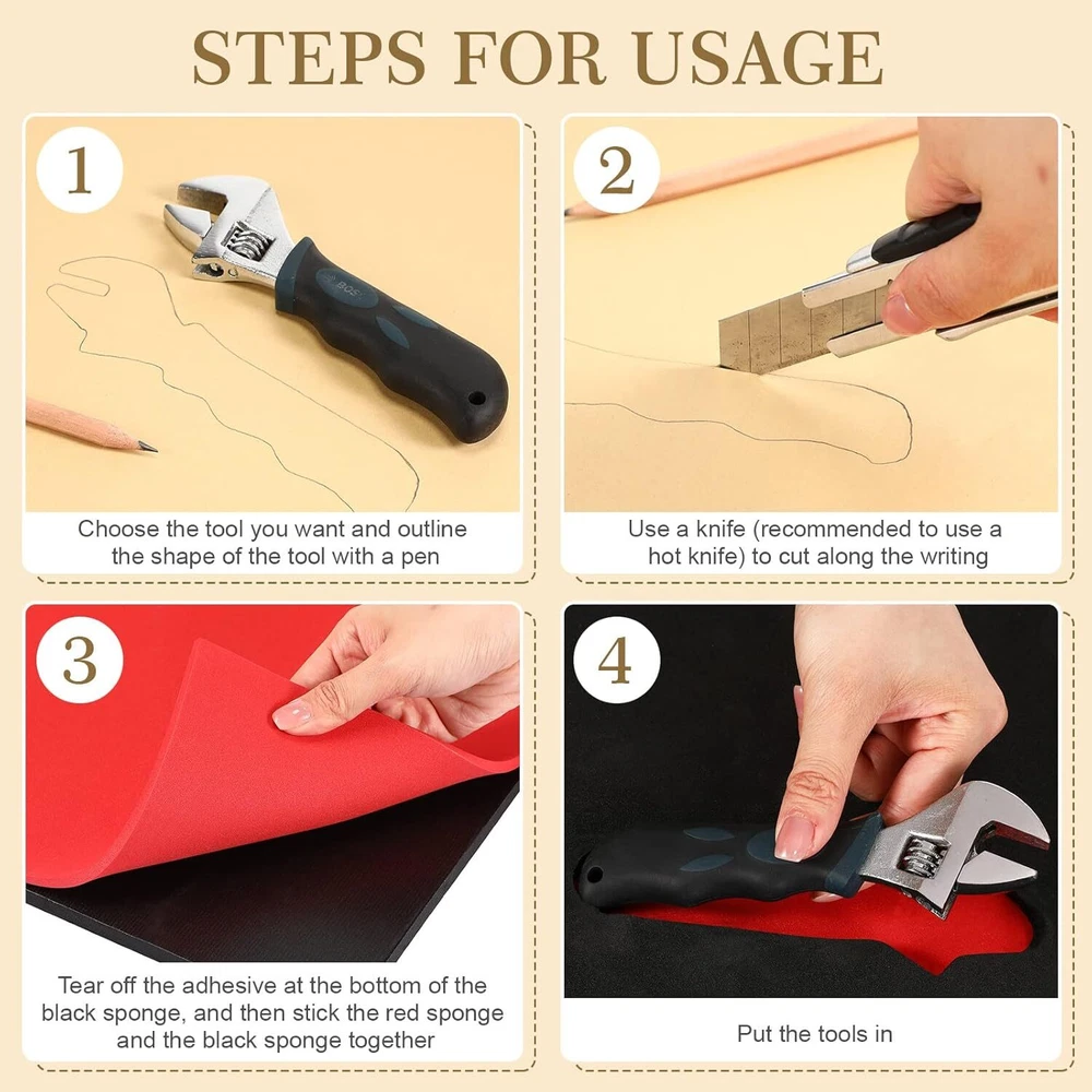 Product Description 3 Sets Tool Box Shadow Foam Organizers Tool Box Liner Adjustable Inserts Foam Non Slip Liner Mat for Tool Box, Cabinet and Chest Drawers, Black Top and Red Bottom (18 x 36 Inch) Package Includes: you will receive 3 sets of toolbox foam inserts, each has a red bottom and black top, enough quantity can meet your daily use and replacement needs, or you can share them with your family and friends 2 Colors Design: the toolbox accessories adopt the black top and red bottom design, contrasting colors can help you identify your missing tools instantly, and they also allow you to easily put your tools back in the right place, and it's easy for you to find what you want Adjustable Size: the size of the tool storage organizer is about 18 x 36 inches, and you can adjust the size according to your needs; You can outline the size of your tool on the black surface with a water pen, then cut it with a hot knife, tear off the backing paper, and stick the black foam with the red foam, then you can put in your toolbox and arrange the tools (toolbox and tools are not included); It is recommended to cut the foam with a hot knife for better effect Strong and Reliable: the adjustable tool chest insert is made of EVA foam material, not easy to fade and break, reliable and strong to use, besides, the black adhesive surface has sufficient stickiness and is not easy to fall off when sticking to the red foam; Repeated tearing is easy to leave foam at the glue, making the viscosity worse, so it is recommended to stick the foam firmly at one time Convenient to Carry: the foam tool box inserts fit many types of toolboxes, so they won't bump into each other inside, easy for you to carry when you go out to do some work outside, they can also be applied to cabinets and chests of drawers, convenient to use About Us We are a reputable seller with many years of experience selling on eBay. Our goal is to provide high-quality products and excellent customer service. Shipping Items will be shipped within 1-3 business days when we received payment. (Orders are not processed on weekends & holidays) Tracking information will be sent once item is shipped. Delivery time depends on destination and other factors Item is shipped to ebay address. Leaving correct address can minimize delay. For international shipping and shipping to Guam, Hawaii and Alaska, Please contact us before placing the order. International buyers please note: Import duties, taxes and charges are not included in the item price or shipping charges. These charges are buyer’s responsibility. We will try our best to reduce the risk of the custom duties. Local pick-up is unavailable at the moment. Contact Us We reply any email messages within 1 business / working days(off-duty at weekend). If you do not get a response from us, then please check your junk or spam mailbox. Our Business hours: Mon-Fri 9:00-18:00, UTC/GMT +8 hours. Please contact us either by clicking "contact seller" in the "purchase history" section or simply click "ask a question" at the bottom of this page. If you are unsatisfied with our item or service, please contact us before leaving any feedback. We are committed to resolve all issues in a friendly and satisfactory manner.