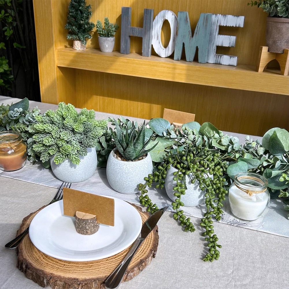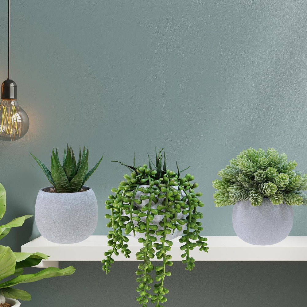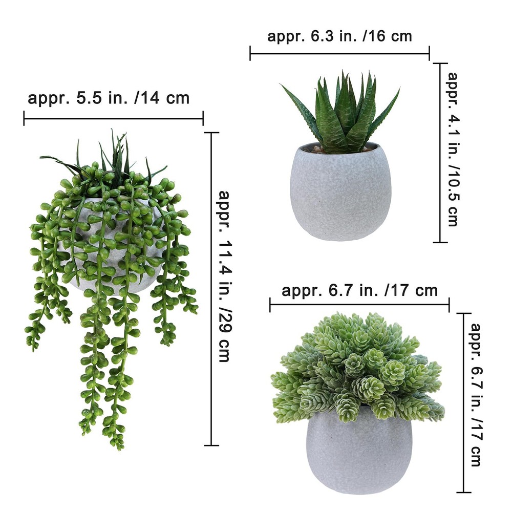 Set of 3 Small Artificial Potted Succulent Plants is a Great Choice for Adding Character to any Space: - Faux potted succulent plants are perfect display for narrow window ledges, counter, sink, dining table, coffee table, entryway table, end table, office desk, kitchen cabinet, shelves, mantel, countertop, nightstand, living room, bedroom, bathroom, balcony, patio. - These faux potted plants perfectly fit into any place in your home, apartment, studio, office, and garden. - These small plants decor are easily integrated with the surrounding environment. They are easier to move around, adding visual interest. - Place on your tiered tray, wodd box or other container with these small artificial succulent potted plants for charming farmhouse-inspired tabletop dispaly. - Use them as place cards. You can place the name cards directly in the pots among the leaves, or attach the tags written with guests' names to the planters. - These fake succulent plants are also available as a hanging plant. Hang them up with macrame plant hangers to elevate your decor and comfort a drab corner of a room. Long-lasting and Beautiful Gift: These artificial succulent plants in ceramic pots can also be used as a great gift. Perfect for housewarming gift, hostess gift, birthday gift as well as presents for occasions such as Mother's Day, wedding, baby shower, Christmas and holidays. Also great as party favors for guests, especially those green-thumb-challenged friend. Trio Faux Succulent Plant Set: Package includes 3 artificial potted succulent plants, featuring an incredibly realistic faux aloe plant, a hops plant, and a string of pearls plant. They are planted separately in 3 round concrete ceramic pots for your convenience and display. At the base of the succulent plants are natural-looking pebbles that complement the pots so well! They look great and will bringing a fresh and natural atmosphere to any space. Nice Green Shades: Assorted artificial potted succulents showcase a dark green aloe plant, a trailing green teardrop shaped string of pearls plant, and flocked green sedum hop blossoms plant, secured in gray round ceramic pots with white finish. They feature nice green shades and realistic textures, create a lifelike look and feel. Simple yet very elegant, they can blend well with any decor, perfect for adding a simplistic aesthetic to your settings. Perfect Size: The total height of this set of faux potted succulent plant measures about is about 4.1"-11.4" and a width of 5.5"-6.7". Each concrete pot measures about 3" tall. Arrange them all together or separately throughout your small spaces or bare nooks for a vibrant display. These lifelike potted succulents fit perfectly on your office desk, coffee table, floating shelf, cabinet, window ledge, or wherever you would like to add a dash of green! Durable & Minimal Maintenance: Artificial succulent plants are made of plastic and look lifelike in color and texture. These fake plants are nestled in concrete ceramic pots with decorative pebbles. There are padded pads on the bottom of each pot to prevent scratching your furniture. These faux potted succulents are meticulously crafted to resemble the real deal, so you can enjoy the beauty of plant life without the need for water or sunlight. These natural-looking artificial succulent plants with gray planters look great, perfect for bedecking your coffee table, shelf, cabinet, windowsill, kitchen counter, office desk, dining room table or outdoor bbq table. They can be used for your baby showers, wedding, thank you, placecards, etc. These faux succulent potted plants even make a great gift for that green-thumb-challenged friend! They are also great for a housewarming, hostess gifts, sympathy gifts, birthday gifts and more.