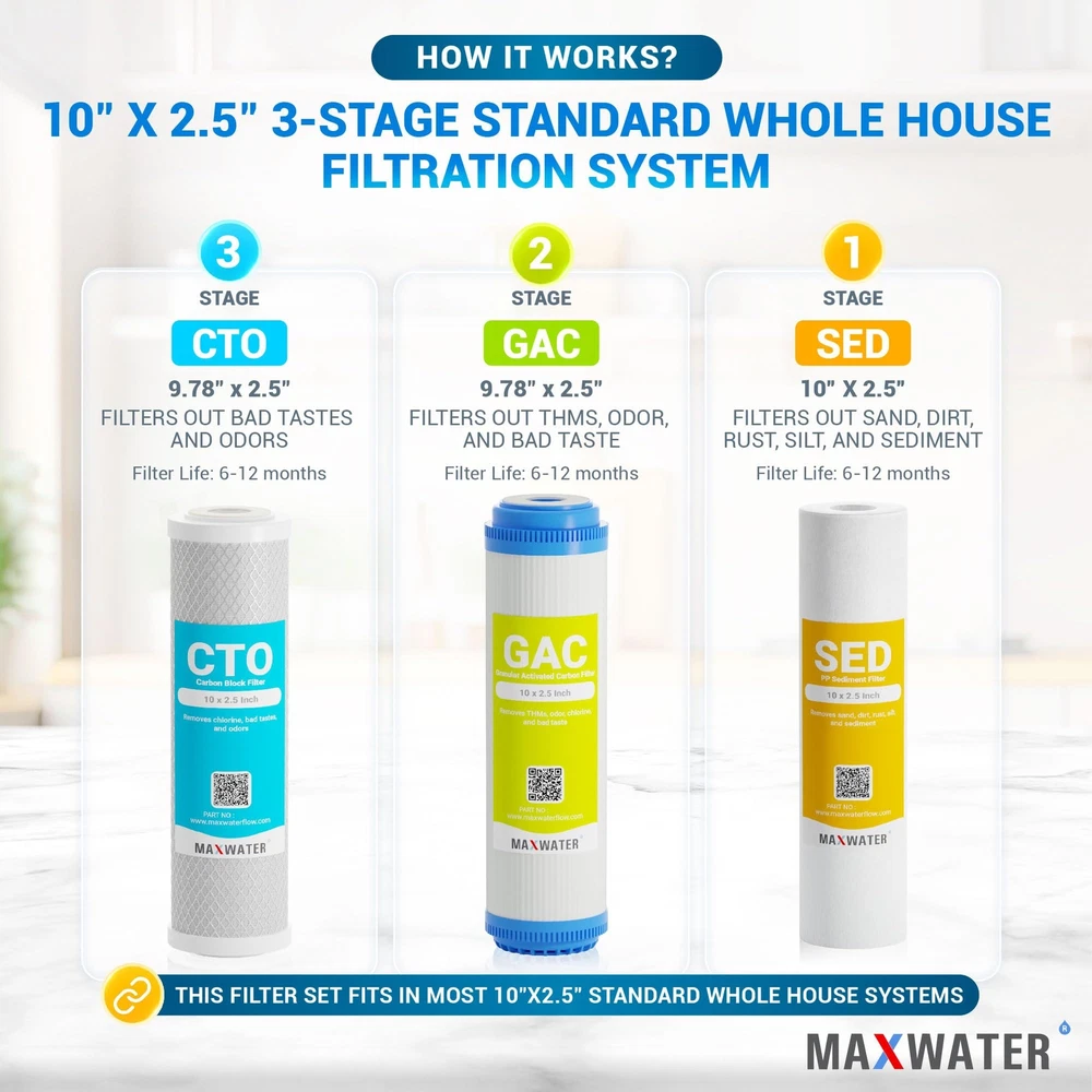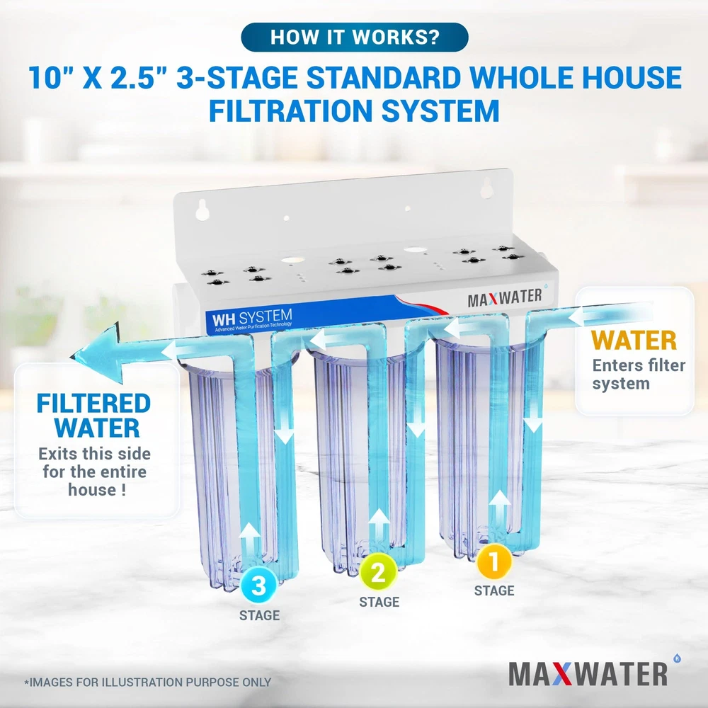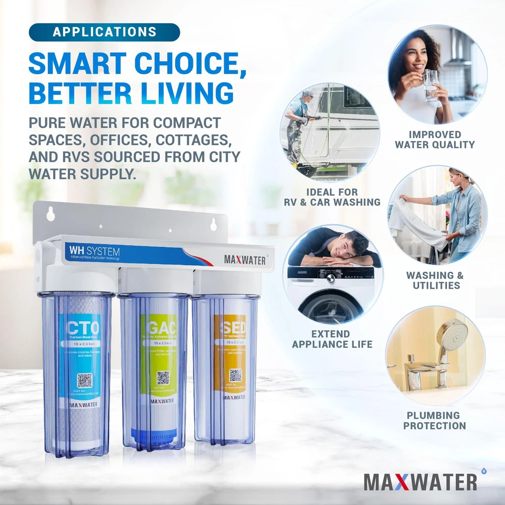 3-stage Whole House/Cottage Water Filter for city water Our 10” Standard Whole House is cost-effective for smaller spaces such as RVs, apartments, cottages and any other light duty applications where space is at a premium. This system will not disinfect water should only be used in areas where the water supply is biologically safe, or in conjunction with a UV sterilizer or other disinfection techniques. If you have a larger home/cottage or have more than 2 people using the water consistently, you may want to consider looking at some of our higher capacity systems. Pre-loaded Filter Cartridges: 1st Stage: 5-micron Polypropylene Sediment Filter 2nd Stage: Granular Activated Carbon (GAC) Filter 3rd Stage: Carbon Block (CTO) Filter Reduces: Sediment (silt, dirt, rust, ETC.) Pesticides Bad Taste & Odors Giardia Cysts Chlorine Turbidity Herbicides VOCs (Volatile Organic Compounds) THMs (Trihalomethanes) MTBEs (Methyl Tert-Butyl Ethers) Includes: 1x 3-Stage White Steel Mounting Bracket 3x 10" Clear Filter Housing, ¾ NPT Inlet/Outlet 1x 10" Standard 5-micron Polypropylene Sediment Filter 1x 10" Standard Granular Activated Carbon (GAC) Filter 1x 10" Carbon Block (CTO) Filter 1x Opening Spanner/Wrench Specifications Filter Life: Approx. 6 to 12 months Maximum Operating Pressure: 125 psi Maximum Operating Temperature: 125°F Recommended Operating Temperature Range: 40-100°F Dimensions: 15" Height x 15" Width x 6" Depth Total Weight: Approx. 17 Lbs with Filters Flow Rate: 1-10 GPM* for ¾" Inlet/Outlet *Pressure drop will be determined based on feed water pressure, filter cartridge, fluid viscosity, filter life, and conditions. Classic Drinking Filter: The water flows through PP sediment filtration (5 Micron), dual carbon filtration (GAC + CTO (5 Micron)). It filters out common sediments in drinking water, like dust, sand, particles, dirt, and rust. Effectively addresses impurities, cloudiness, colors, and more. It also improves the taste and neutralizes odor. Fresh Healthy Water Supplier : The on-demand fast flow rate of the WH 3 stage system allows it to meet the widest possible range of needs in your home. Up to 20x more effective than the common water pitcher dispenser. Flow Rate: Up to 1 - 8 GPM* depending on source water pressure. Maximum Pressure: 90psi. It washes fresh produce like fruit and vegetables, can provide your entire family with delicious, clean water straight from your tap. Excellent Quality and Design : Features beautiful designed clear see-through 3 stage housing. Clear see-through housings makes filter inspection a snap. Manufactured to comply strictly with quality standards for water quality, material safety and structural integrity. Easy to Install and Maintain: This system is designed for easy installation, low maintenance, and features dual carbon filters along with a high-capacity sediment filter. The sediment filter protects and extends the life of your system, while the carbon filters work to improve water quality and odor. You can replace the filter every 6 to 12 months, judged by the water’s taste. Use only original MaxWater replacement parts and filters for best results. TDS Note and Customer Services: This under sink water filter will not alter the TDS of the incoming water. Instead, it keeps the healthy minerals in your water. If you are interested in a filter that addresses TDS, please consider a reverse osmosis system. Backed by a 1-year Manufacturer warranty. For any issue or concern, please don't hesitate to contact us.