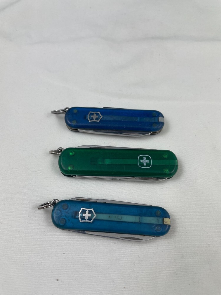 Three Swiss Army Classic Multi Tool's. 2 are blue and one is green. They will need some cleaning. For inventory - H15