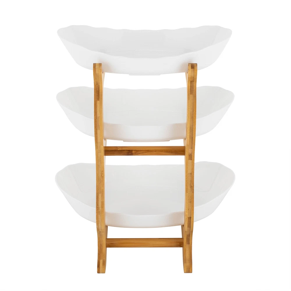 This 3-tier bamboo serving stand is perfect for parties! The elegant yuanbao design and polished finish make it stylish, while the sturdy construction holds snacks, fruits, or desserts neatly. The different-sized bowls are spacious, and the natural wood look adds a classy touch to any table. Easy to assemble, though handwashing is needed—totally worth it for such a beautiful and functional piece! Great for entertaining or as a gift.