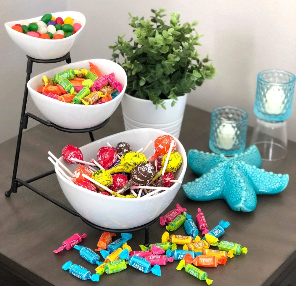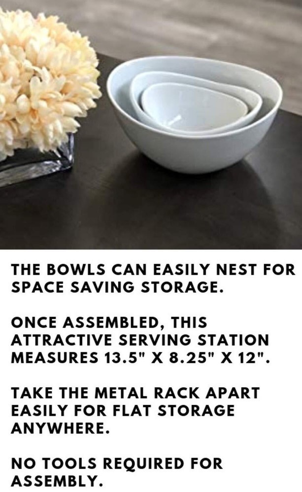 3 Tier White Oval Bowl Set with Sturdy Collapsible Metal Rack for Chips Display