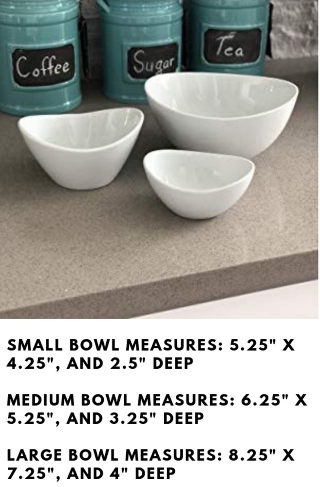 3 Tier White Oval Bowl Set with Collapsible Thicker Metal Rack - Perfect Display for Chips, Dips, Candy, Fruit and More Collapsible Stand with Nesting Bowls for Easy Storage ✅ STARTING TODAY: Breathe New Life In Your Parties With The Most Elegant Food Server Chip Bowl Set! Add a touch of elegance on your dinner table or party. The convenient sizes of this Bowl set allows you to use it for dozens of amazing treats. Serve your holiday sweets, chips, dip, finger food, appetizers, fruits and veggies, cheese sticks or any other treat and rest assured that everyone will be impressed of how great your presentation looks! ✅ STYLISH SERVICE FOR YOUR GUESTS: This eye-catching 3-Level Bowl Rack will surely showcase your culinary ideas on these beautiful bowls to make your event more lively and interesting. A stronger stent won't shake the forgotten uneven and sturdy service stent of those inexpensive 5mm legs. The metal frame has a diameter of 6.5mm, so it has higher stability. ✅ EASY TO STORE and save space when not in use These oval shaped bowls can be easily nested and stored. Listed below are 3 bowls, 5.25, 6.25, and 8.25. These durable ceramic bowls are easy to clean and can be used in dishwashers, microwaves and freezers. ✅ PERFECT FOR ANY KIND OF DISPLAY: Our simple and elegant three-tier bowl rack service kit can be used as a display stand for jewelry, food, toys, and is a perfect complement to any special event. Ideal for holidays, birthdays, parties, weddings, formal and informal parties, etc. Your beautifully redesigned display stand will surely impress your guests. ✅ BUY WITH CONFIDENCE: We offer a 30-day 100 money back guarantee. We support our product and know you will like it. 3 Unique Bowl Sizes: Small Bowl Measures: 5.25" x 4.25", and 2.5" Deep Medium Bowl Measures: 6.25" x 5.25", and 3.25" Deep Large Bowl Measures: 8.25" x 7.25", and 4" Deep Shipping We offer FREE shipping on all orders! We ship within Three business days of payment, usually sooner. We use a selection of shipping services such as UPS, FedEx, USPS etc. We only ship to the lower 48 states, no APO/FPO addresses or PO Boxes allowed. Local pickups and combined shipping options are not provided at this time. International buyers – please note: Import duties, taxes, and charges aren't included in the item price or postage cost. These charges are the buyer's responsibility. Please check with your country's customs office to determine what these additional costs will be prior to bidding or buying. Order Cancellation Policy * Order Cancellation Policy ** You can return a product for up to 30 days from the date you purchased it. 1. The seller reserves the right to cancel the special case only due to eBay cancellation fee. 2. The decision of seller is the final. 3. The seller will respond to the cancellation request within 2 business days. Please wait for the result of cancellation. 4. In case the cancellation is not completed by some reasons, the buyer can follow the options below to get the refund. 4.1 The buyer can reject the item when it arrives. 4.2 The buyer can send the item back to the seller within 30 days If the buyer receives item (USA Shipment ONLY). The seller will provide the FREE return label to the buyer when the buyer opens " Return Item" case on eBay by using the reason as "Change my mind" ONLY. 5. When buyer has placed the order. The order will be processed and completed by automatic warehouse system within 5 minutes. In case that buyer sends the cancellation request after 5 minutes of placing the order, the request will be rejected. **Sending direct message to cancel the order is not allowed for every case.* Return Policy - If buyer would like to return the items for refund or replacement, please CONTACT SELLER to receive the free return label from seller. The refund or replacement will be processed with the tracking number of return label which is provided by seller only. The other ways of return which are not approved by seller will not be processed for the refund or replacement. Return You can return a product for up to 30 days from the date you purchased it. Any product you return must be in the same condition you received it and in the original packaging. Please keep the receipt. Payment We accept payment by any of the following methods: eBay Payments Please pay as soon as possible after winning an auction, as that will allow us to post your item to you sooner! Feedback Customer satisfaction is very important to us. If you have any problem with your order, please contact us and we will do our best to make you satisfied. Contact Us If you have any queries, please contact us via ebay. We usually respond within 24 hours on weekdays. Please visit our eBay store to check out other items for sale! Thank you for shopping at our store.