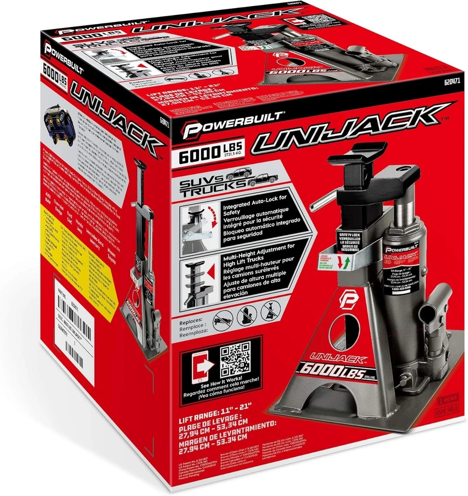 3 Ton Bottle Jack Lift for Off-Road Vehicles Simply Genius: Experience the speed and convenience of a clever design that seamlessly combines a bottle jack and jackstand into one compact unit. Lifts and Holds Your Vehicle: Featuring a built-in ratcheting safety bar that ensures the jack stand remains securely locked in the raised position for your peace of mind. Perfect for SUVs and Trucks: With an impressive 3,000-pound capacity and a versatile lift range of 11 to 21 inches, this jack is ideal for pick-up trucks, SUVs, vans, and jeeps. Great for RV and Off-Road Use: The wide base enhances stability on all surfaces, reducing "sinking" under load, making it perfect for leveling RVs and trailers. Built to Last: Meticulously engineered to meet or exceed ANSI standards, and protected by a 1- factory for your confidence and assurance. Why Choose Our 3 Ton Unijack? The 3 Ton Unijack transforms your lifting experience with its ingenious design that safely lifts and holds both traditional and unibody vehicles using a single lift point. Say goodbye to the hassle of conventional jacks that often leave you with no room for jackstands. The Unijack accommodates a range of lift points with both concave and flat surfaces, ensuring your vehicle's integrity during lifting. With a lifting capacity of 6000 pounds and a lift range of 11 to 21 inches, this jack is designed not just for SUVs and trucks, but also for RVs, enjoying both cost-effectiveness and convenience. Invest in quality and safety with the 3 Ton Bottle Jack Lift for Off-Road Vehicles, where your adventures begin with confidence. Order today and elevate your vehicle maintenance experience! Manufacturer Part Number: Car Jack and Stands Unit Quantity: 1 Vehicle Type: Heavy Duty/Commercial,SUV,Truck,Van,Jeep,RV,Off-Road Vehicle Type: Jack & Stand Set Number of Pieces: 1 Drive: Manual Material: Metallic-Fiber Capacity per Stand: 6000lbs. Set or Single Item: Single Item Minimum Height: 11 Inches Unit Type: Unit