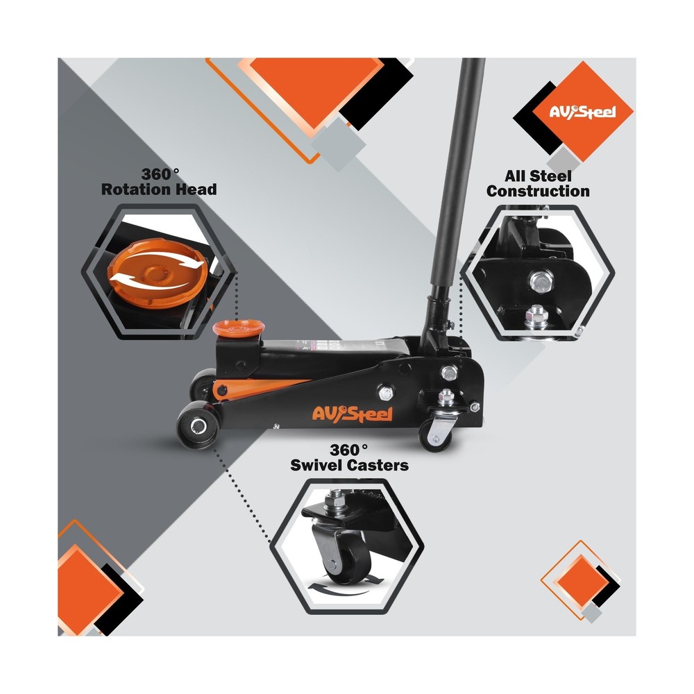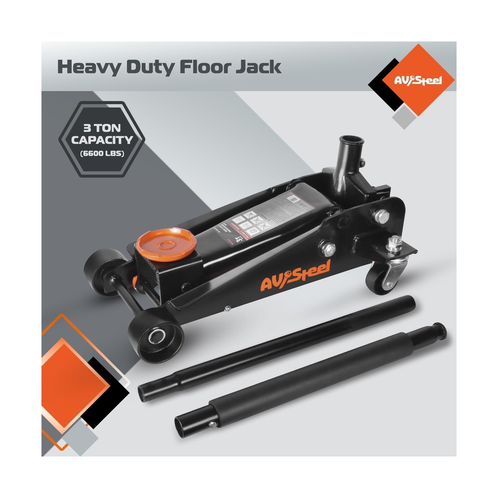 3 Ton Floor Jack (6600 lbs), Heavy Duty Hydraulic Jack for Car, Heavy-Duty Floor Jack with Single Piston Pump, Quick Lift Car Jack 3 ton with Lifting Range 5.5'' to 18.5'' Description Features: Capacity: AV Steel car floor jack can easily lift up to 3 tons (6,600 lbs) with a min lifting height of 5.5" and a max height of 18.5", making it suitable for most cars, trucks, and SUVs in terms of listing range and capacity. Truck jack is great for garage service and heavy-duty industrial use. Overload Protection: A safety measure in the hydraulic car jack serves to provide extra protection in case of excess weight and to avoid harm or damage. A 360 rotatable saddle provides maximum protection to your vehicle. High Quality: Our heavy-duty car lift jack is made of strong and durable steel construction. With wheels, including 2 rotating rear wheels that are universal, this jack is easy to move, steer, and roll. Meets ANSI/ASME PASE safety standards. Universal fit: Whether you need to change a tire, perform maintenance, or make repairs, the 3ton floor jack is the perfect tool for the job. Its easy-to-use design and reliable performance make it a great addition to any garage or workshop. Product Details: Load Capacity: 6600 Pounds Maximum Lifting Height: 18.5 Inches Brand: AV Steel Color: Multi color Item dimensions L x W x H: 26.4 x 14.2 x 8.3 inches Load Capacity: 6600 Pounds Maximum Lifting Height: 18.5 Inches Brand: AV Steel Color: Multi color Item dimensions L x W x H: 26.4 x 14.2 x 8.3 inches Style: Quick lift Manufacturer: AV Steel UPC: 198168207376 Model: Floor Jack Item Weight: 63.9 pounds Product Dimensions: 26.4 x 14.2 x 8.3 inches Item model number: AV-300101F Manufacturer Part Number: AV-300101F Date First Available: April 27, 2024 Delivery We Do Not Ship Outside of the Continental US. Return Policy All items qualify for returns within 30 days of receipt. Buyer is responsible for return shipping on any item that is not damaged. Feedback We take our reputation seriously, we buy and sell online, so we understand the value of trust. If you are unsatisfied with your order, please contact us and we will work with you to resolve it to your satisfaction.