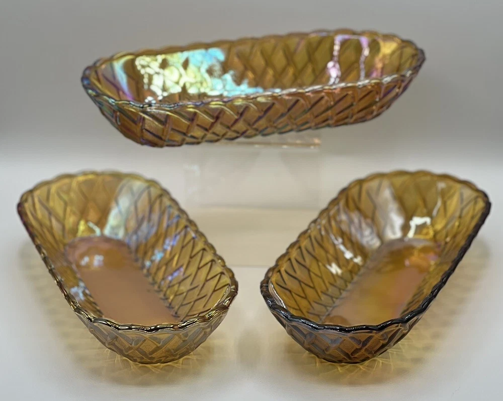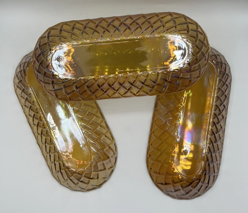Add a touch of vintage charm to your table setting with this beautiful gold oval relish dish from Indiana Glass. With its unique pretzel amber color and mid-century modern style, it's sure to be a conversation starter. Made in the United States, this dish is perfect for serving your favorite snacks or small dishes. It's not handmade, but its quality and durability are undeniable. Indiana Glass is a trusted brand known for their exceptional glassware, and this dish is no exception. Bring a piece of history to your home with this gorgeous vintage relish dish. 10.5” Long