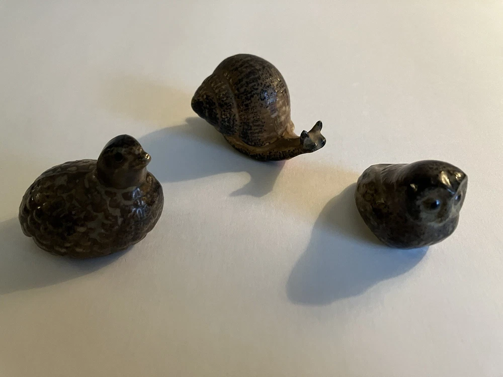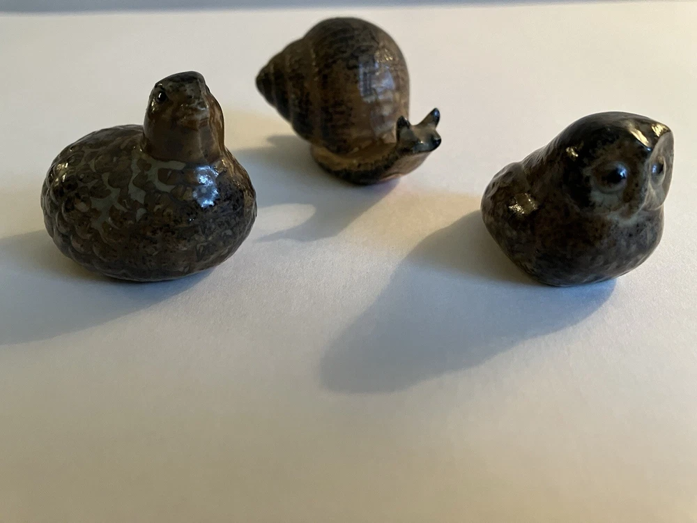 Vintage lot of 3 miniature Otagiri brown stoneware miniature figurines. Lot includes snail ( 2 1/4” x 1 1/4”,) owl (1 1/4” x 1 1:4”,) and quail (1 1/2” x 1 1/3”.) Quail stamped Japan and snail has red and gold Made in Japan foil label. All in great shape, no chips or cracks. Clean. Cute trio. Thanks for looking. Now for the fine print…… I use the good old USPS for all shipping. Despite their recent increase in shipping rates, I try to charge fair shipping. On certain items I charge a $1.00 handling fee to offset the price of bubble wrap, boxes, Styrofoam peanuts, etc. I’m very happy to combine shipping on multiple items that you purchase. I ship every day; Monday through Friday (except for snow and ice events) but do not ship on Saturdays.