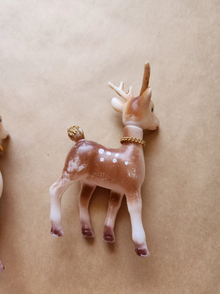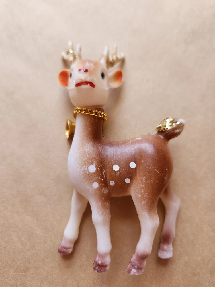 3 Vintage Soft Plastic Reindeer 5 inches tall Pre-Owned one of the reindeer missing a bell, some paint rubbed away here and there Please refer to photos for condition